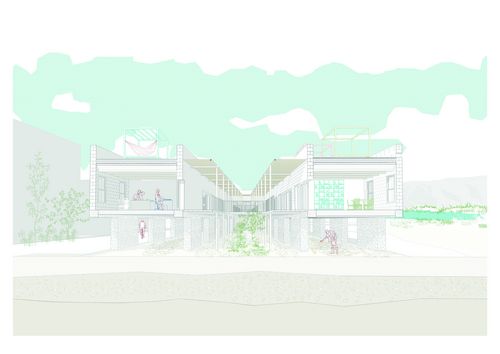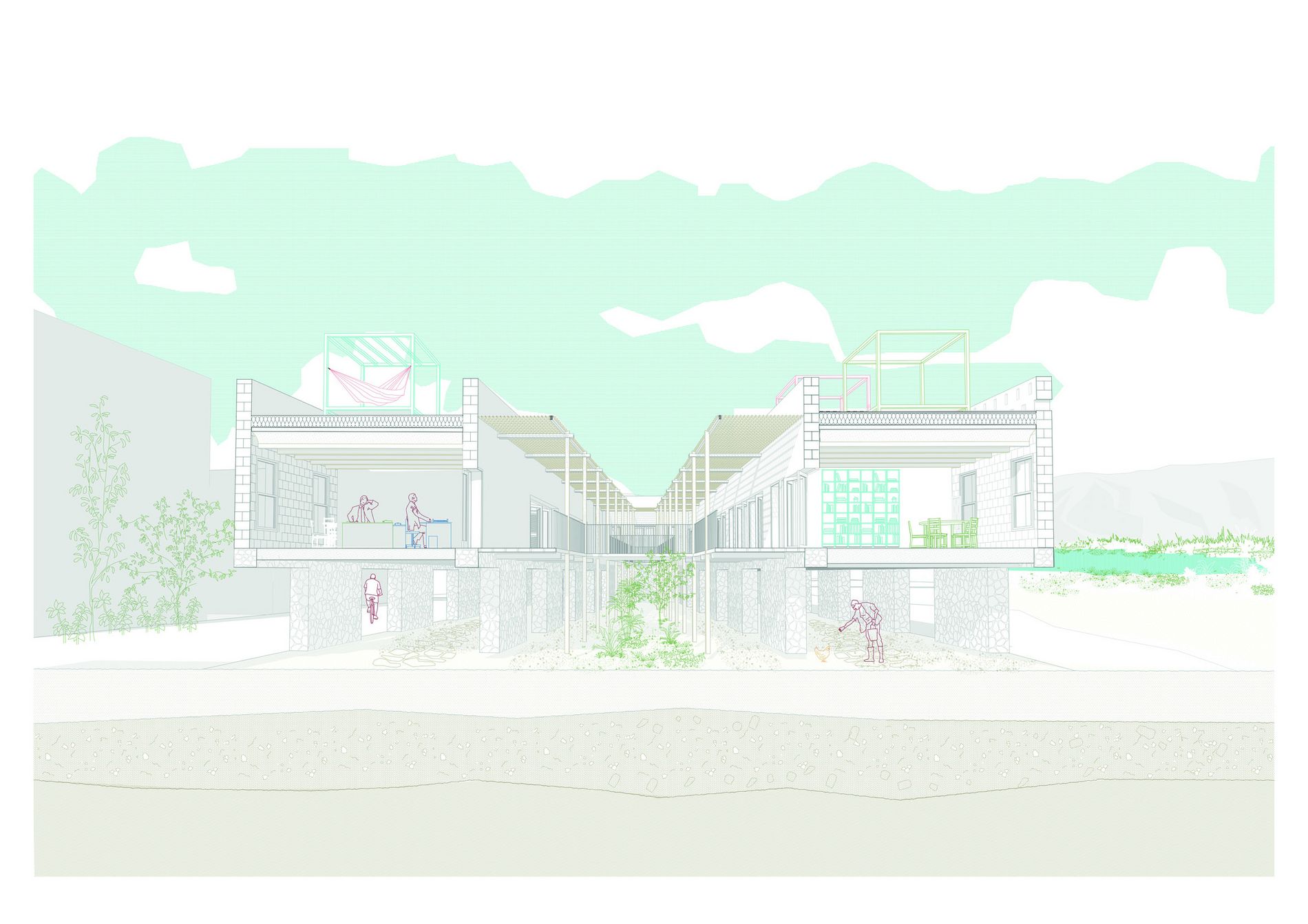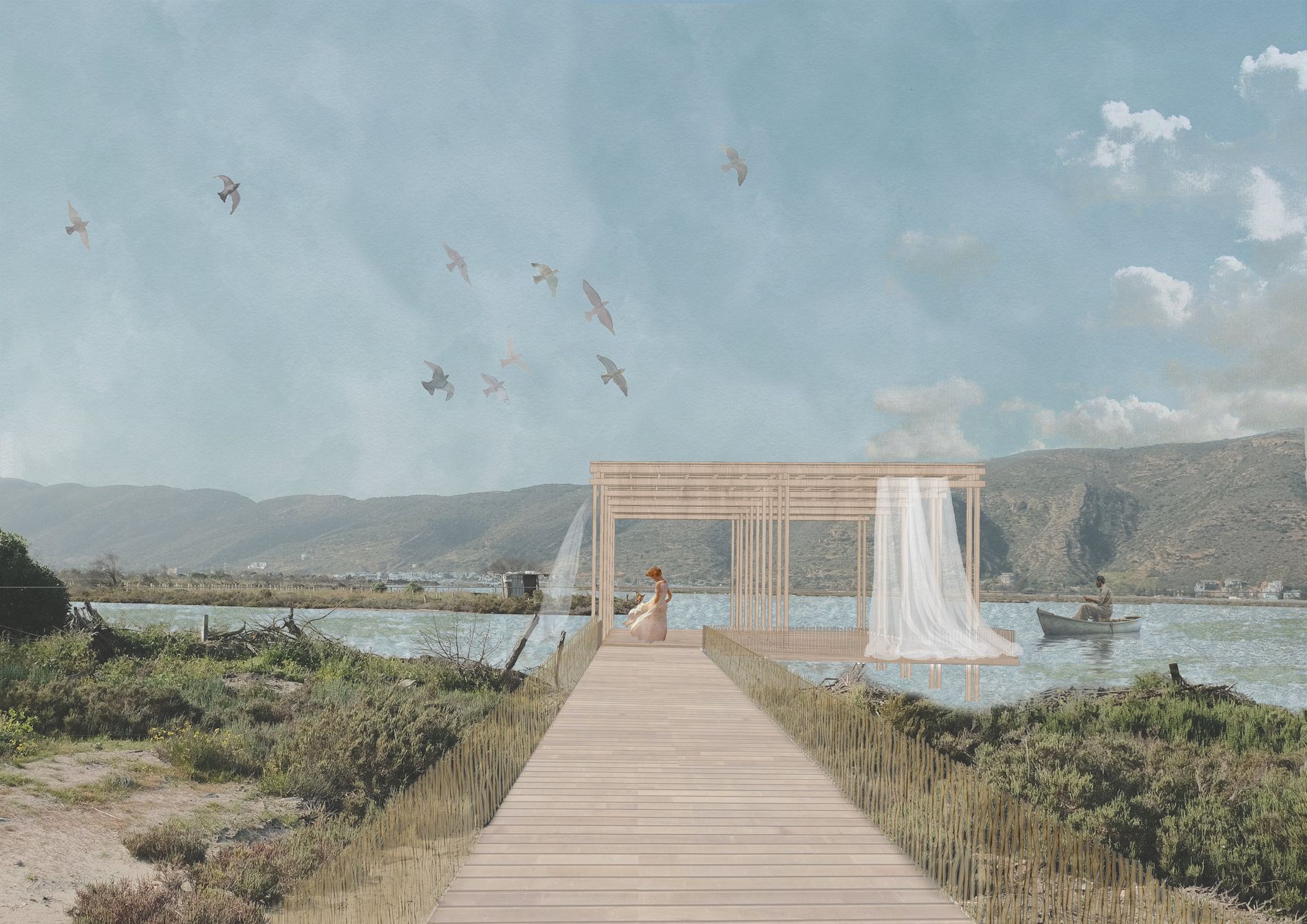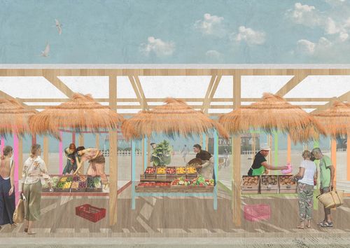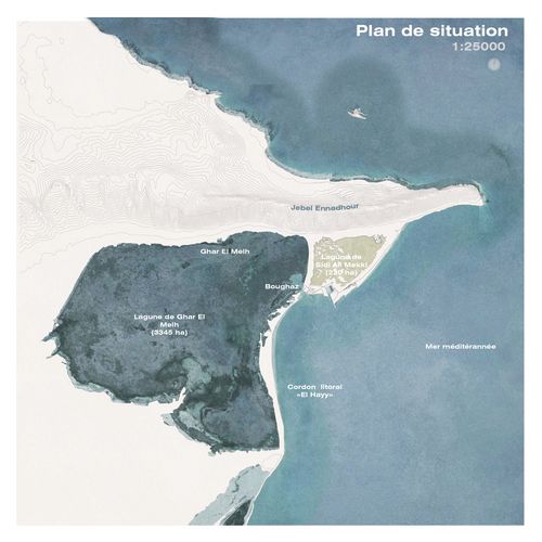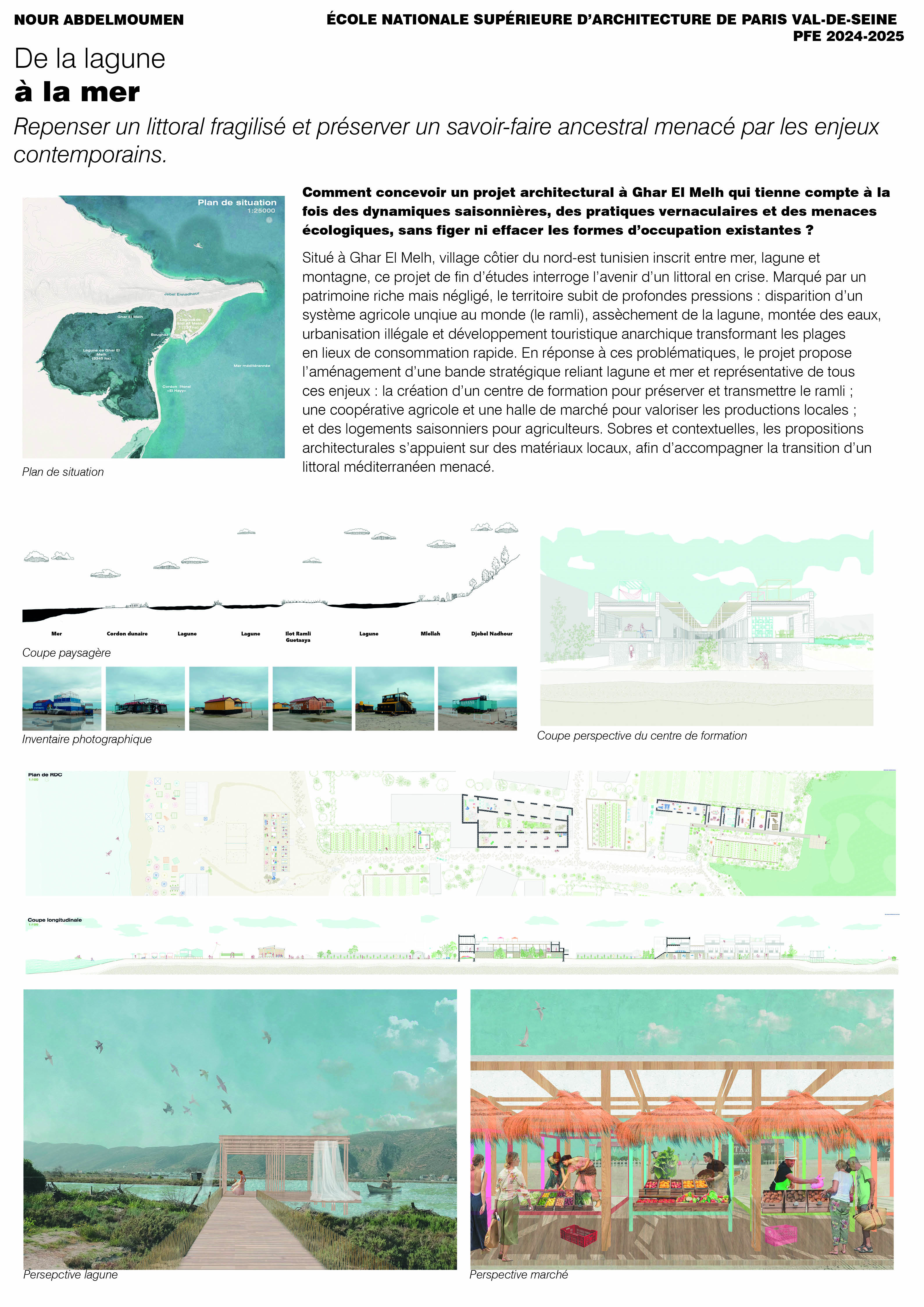 Situé à Ghar El Melh, village côtier du nord-est tunisien inscrit entre mer, lagune et montagne, ce projet de fin d’études interroge l’avenir d’un littoral en crise. Marqué par un patrimoine riche mais négligé, le territoire subit de profondes pressions : disparition d'un système agricole unqiue au monde (le ramli), assèchement de la lagune, montée des eaux, urbanisation illégale et développement touristique anarchique transformant les plages en lieux de consommation rapide. En réponse à ces problématiques, le projet propose l’aménagement d’une bande stratégique reliant lagune et mer et représentative de tous ces enjeux : la création d’un centre de formation pour préserver et transmettre le ramli ; une coopérative agricole et une halle de marché pour valoriser les productions locales ; et des logements saisonniers pour agriculteurs. Sobres et contextuelles, les propositions architecturales s’appuient sur des matériaux locaux, afin d’accompagner la transition d’un littoral méditerranéen menacé.