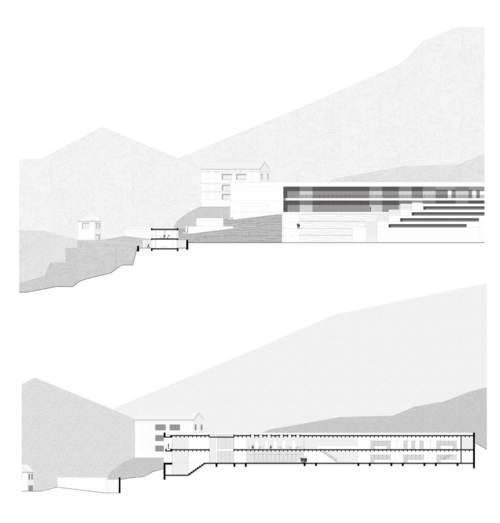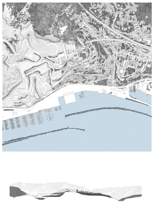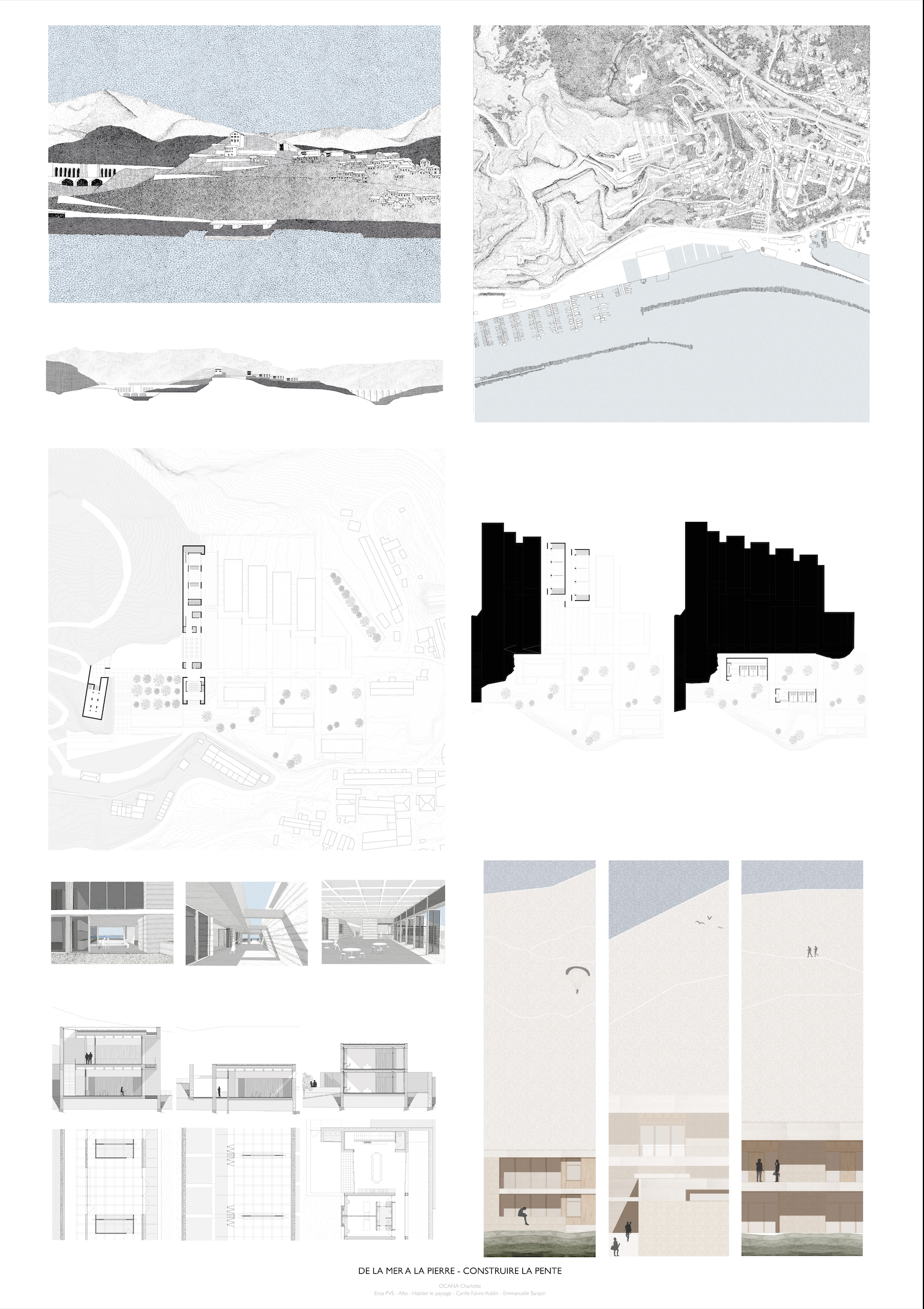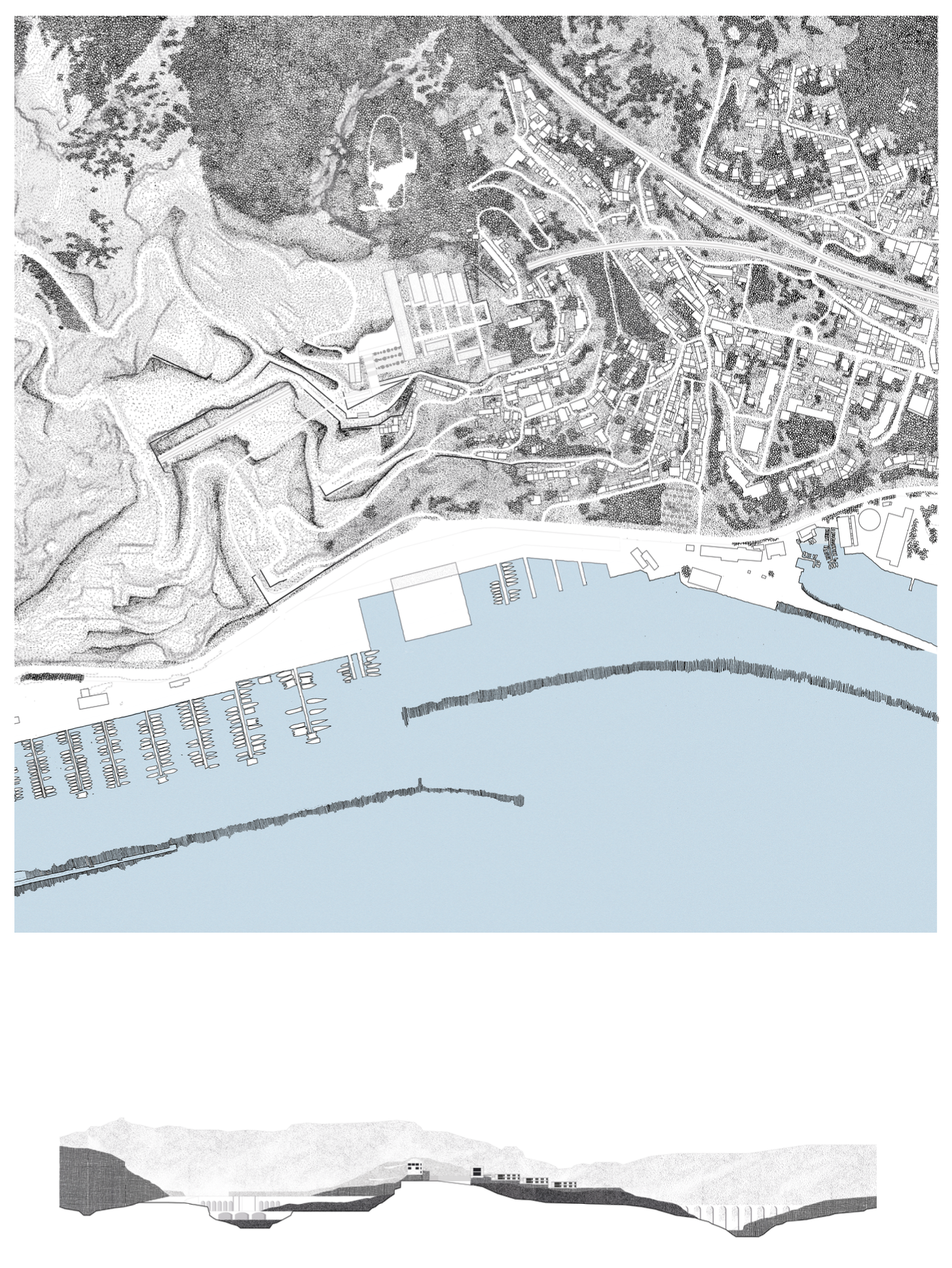 Le projet se déploie sur plusieurs niveaux et s’articule autour d’une rotule reliant tous les éléments. Il redonne accès à l’eau grâce à des halles séparant la route de la mer. La montée sinueuse est redessinée, ses soutènements reconstruits et transformés en belvédères. Un train à crémaillère gravit le creux de l’ancienne usine. Enfin, un entablement fort souligne la maison sur son rocher, repère du territoire, réhabilité en musée du site. L’esplanade devient le cœur du programme. On y trouve l’accès au musée, creusé dans la montagne et orienté tour à tour vers la mer et la ville. L’école d’art et des logements étudiants collectifs complètent cet ensemble et rejoigne le tissu urbain.