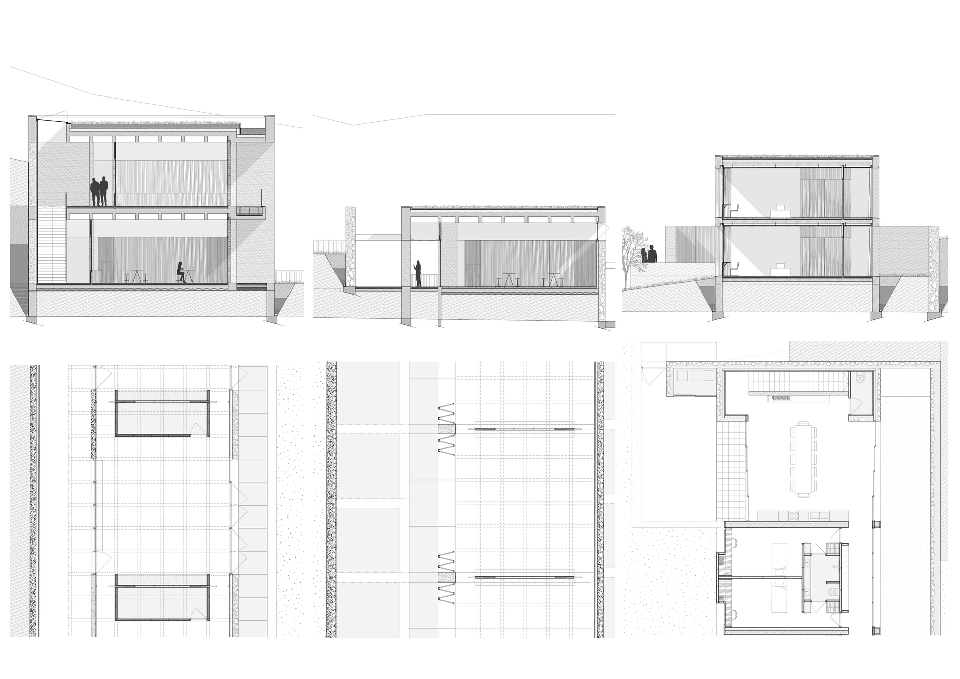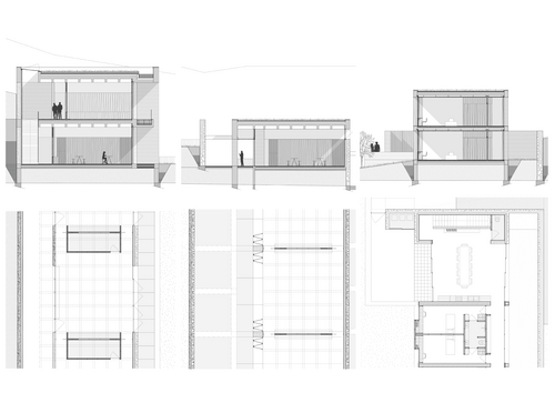 Enfin, le système constructif met en valeur l’histoire du lieu : les pierres issues des ruines de l’usine sont réutilisées pour fabriquer un béton cyclopéen où elles apparaissent ponctuellement dans les murs, renforçant l’identité tectonique du projet.