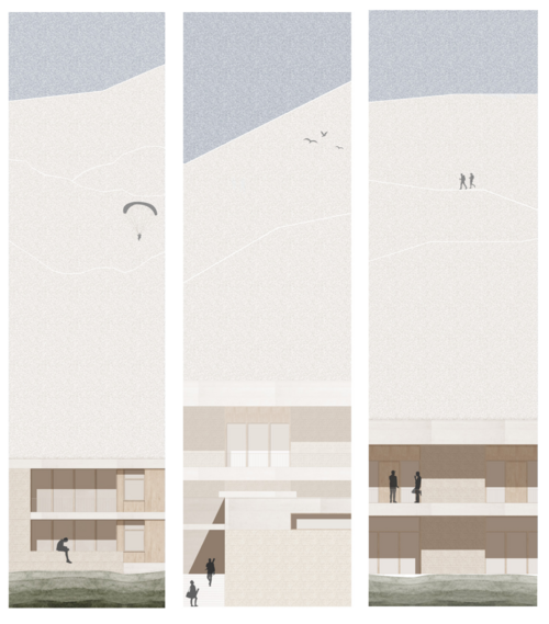 Le projet va donner à voir ce paysage particulier en créant des entablements et des esplanades qui deviennent des points de chute depuis la mer et des points de départ vers le parc, réhabilitant l’ancienne usine et y installant une école d’art et ses logements étudiants tournés vers la ville.