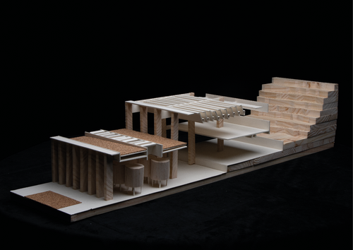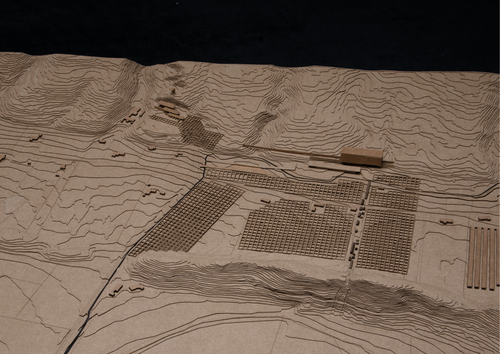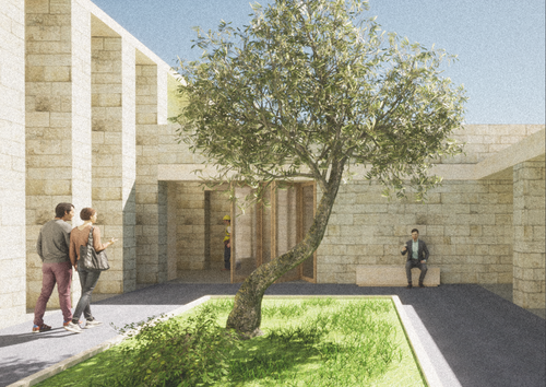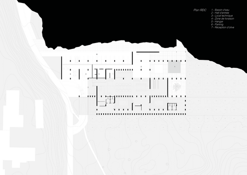 Dans un territoire marqué par des chaînes de montagnes pittoresques dans le sud des Alpilles, le site s’inscrit dans son environnement archéologique. L’implantation s’articule autour d’un chemin paysager et agricole en lien avec son patrimoine : l’aqueduc de Barbegal et les oliveraies de la Vallée des Baux. Le projet est un domaine oléicole qui apparait comme une masse sur un plateau en contrebas d’une colline et épouse cette forme par un principe d’escalier.