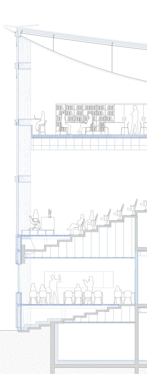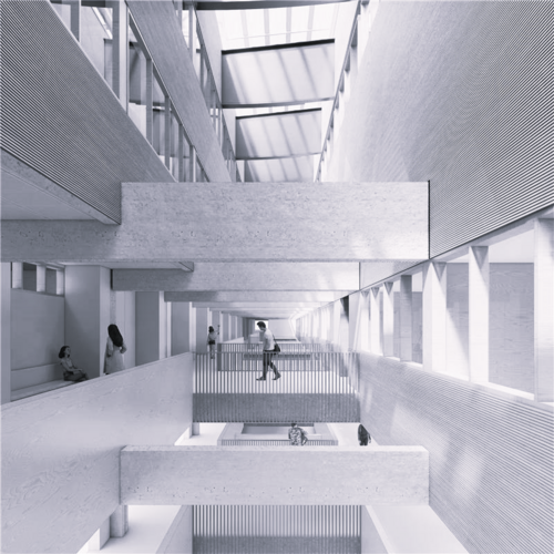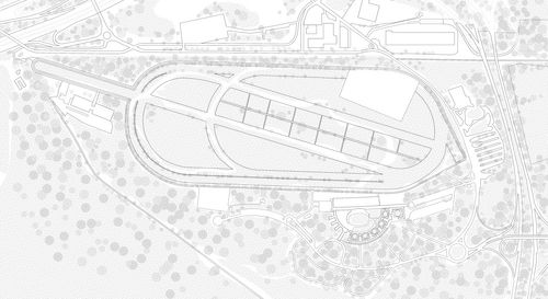 Le choix s’est porté sur un campus sport-études équestre, associant enseignement, internat et pôle équestre. Ce programme s’inscrit dans la continuité historique du lieu et exploite son insularité en proposant un établissement autonome. L’intervention architecturale privilégie la transformation plutôt que la démolition. Les écuries accueillent le pôle équestre, tandis que les tribunes sont réinvesties par les salles de classe et l’internat. Leur reconversion passe par une réhabilitation thermique, la création d’un atrium central et la mise en place d’une nouvelle enveloppe vitrée, qui convertit l’espace des gradins en un vaste intérieur lumineux et habité. Ainsi, l’hippodrome devient école, conservant son identité tout en se réinventant.