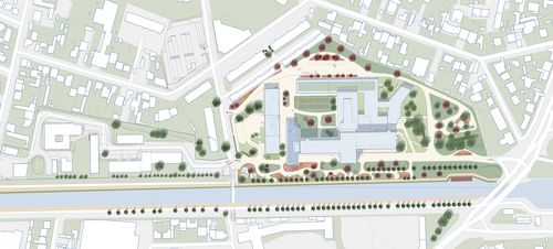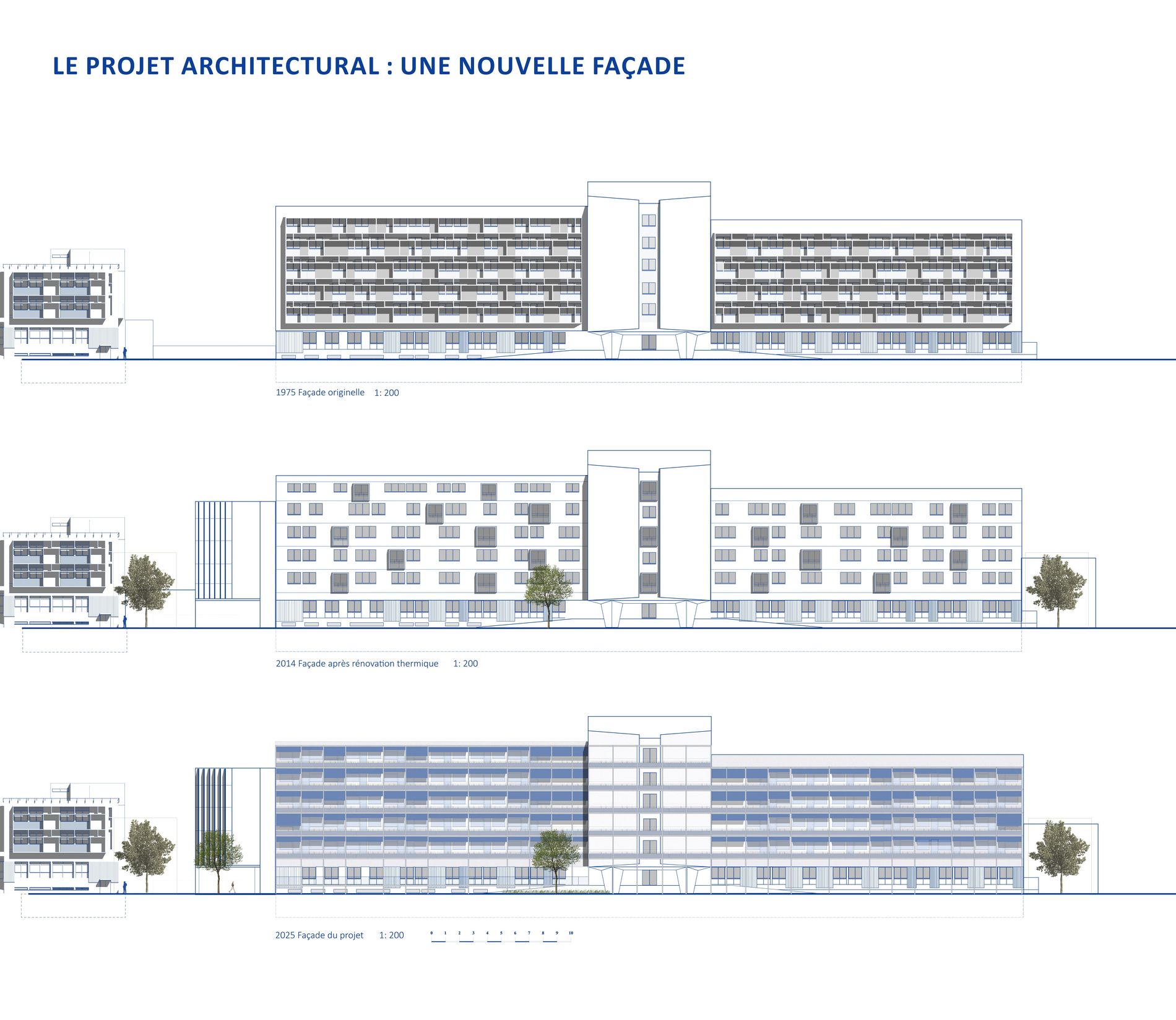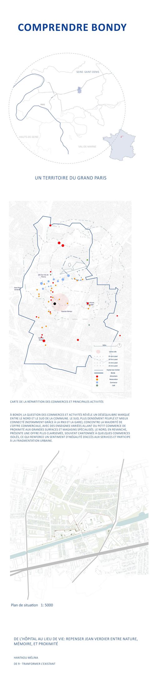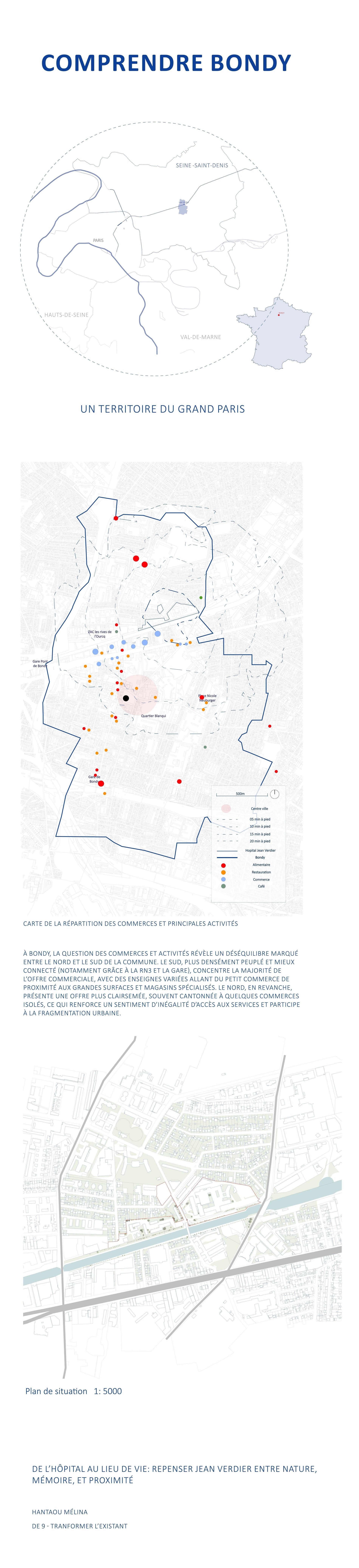 Le projet de requalification du site de l’hôpital Jean Verdier s’inscrit dans une dynamique de transformation urbaine et paysagère. Avec le transfert progressif des activités hospitalières, près de 44 000 m² de bâti se libèrent, offrant l’opportunité de repenser ce patrimoine. Le bâtiment principal, dit tripode, est réinvesti pour accueillir une résidence intergénérationnelle, favorisant la mixité sociale et le vivre-ensemble, tout en intégrant des espaces partagés à chaque étage. Autour, le programme associe commerces de proximité, espaces productifs (fab lab, incubateur de start-up) et équipements ouverts au quartier, afin de créer un véritable lieu de vie et d’innovation. Le projet paysager transforme le site en parc ouvert sur le canal de l’Ourcq, avec des cheminements piétons et cyclables, des jardins favorisant la biodiversité et de nouveaux espaces publics conviviaux. L’enjeu est de reconnecter le site à la ville, d’offrir de nouveaux usages et de faire de Jean Verdier un levier de renouveau pour Bondy.