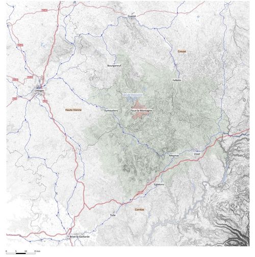 La commune de Faux-la-Montagne, dynamique malgré son hyper-ruralité, a servi de terrain d’étude. En collaboration avec ses acteurs locaux, le projet propose d’abord des guides d’intervention sur trois enjeux urbains. Le travail s’est ensuite concentré sur un site stratégique à l’entrée est, autour de l’Hôtel Bouteille et de la place du Carrefour. La démarche architecturale consiste à réhabiliter les typologies vernaculaires et à y implanter un programme associatif et de logements communaux. Cette réhabilitation est complétée par la conception d’une halle en bois feuillu, dont la structure prend en compte les contraintes des scieries locales.