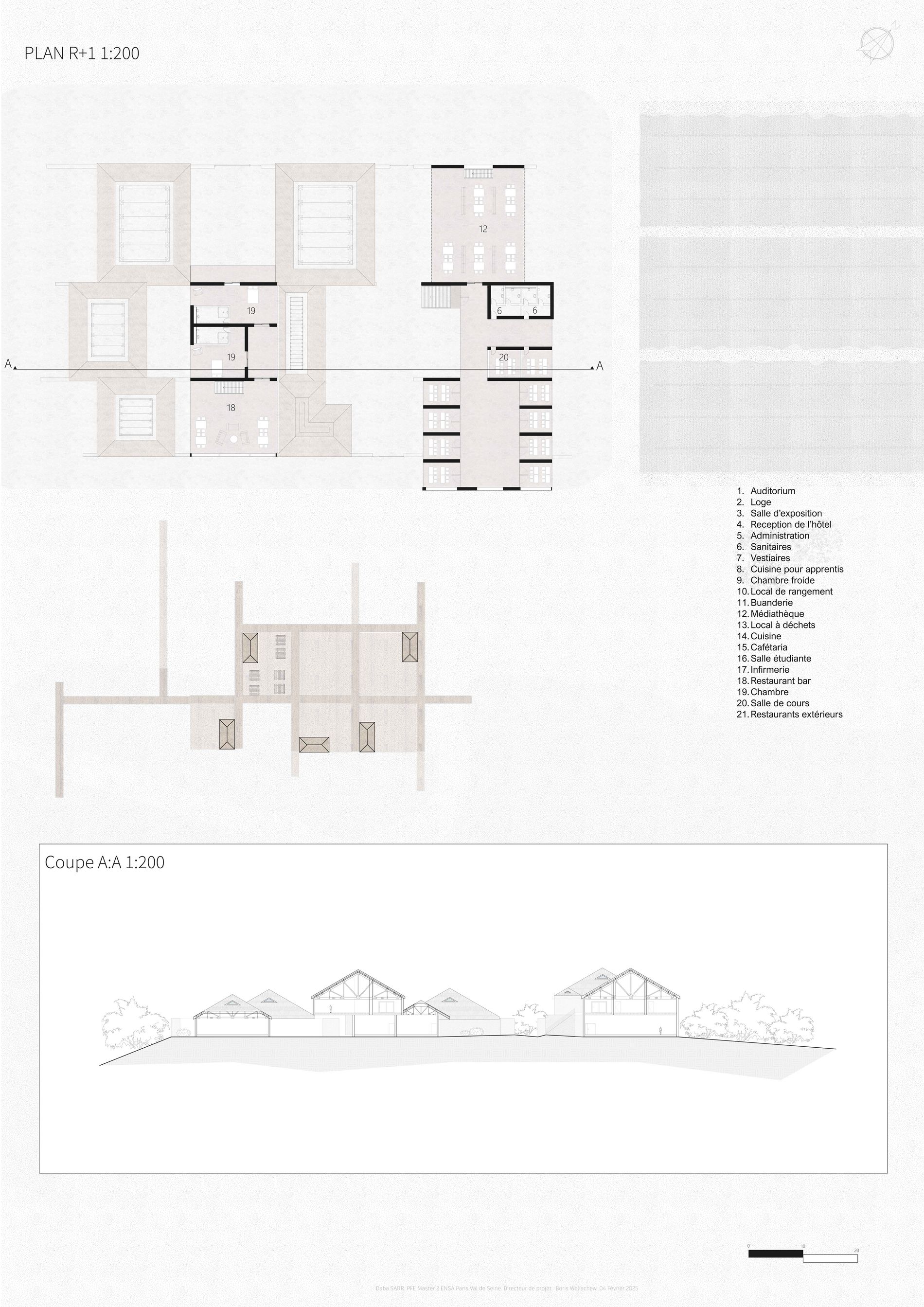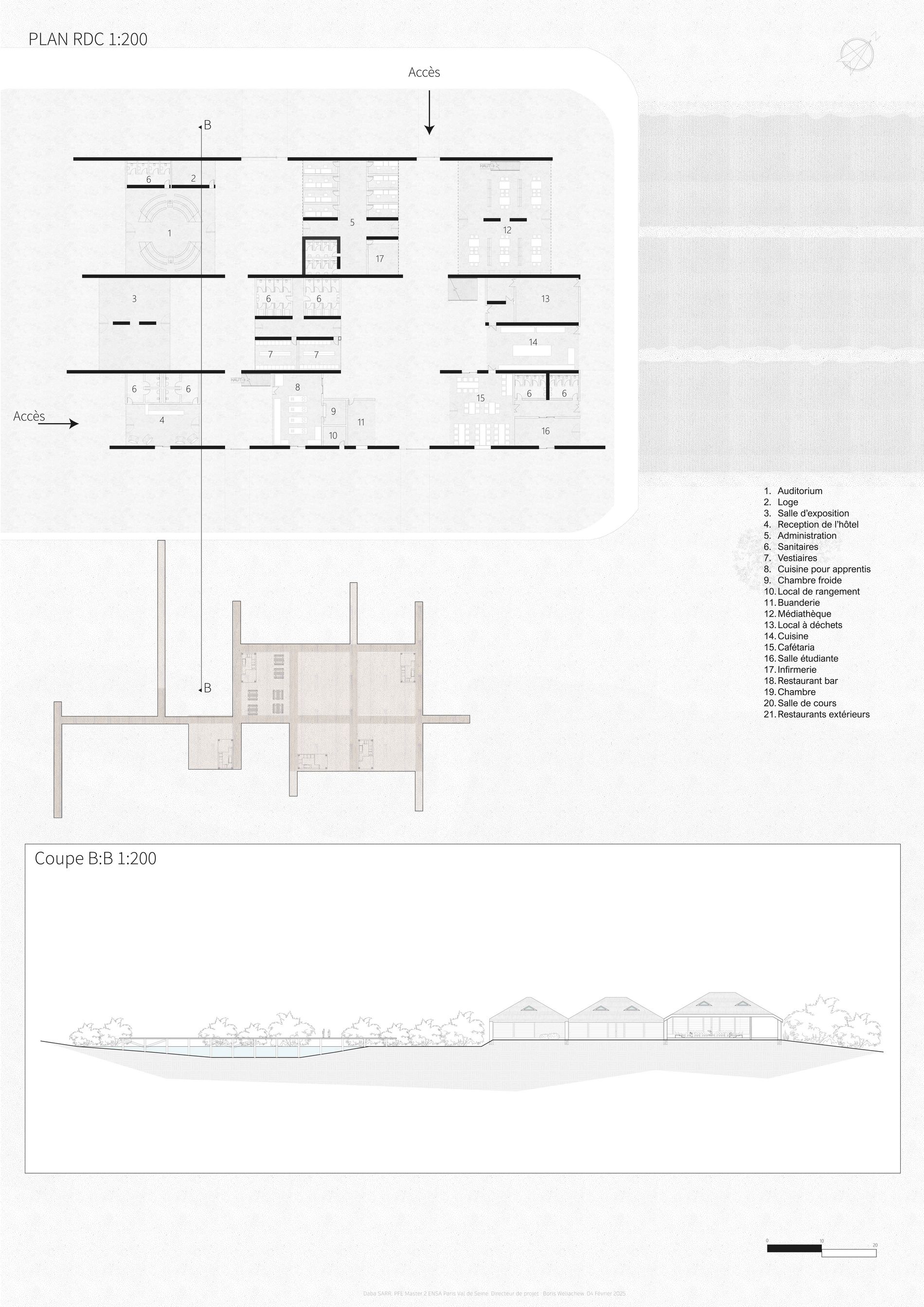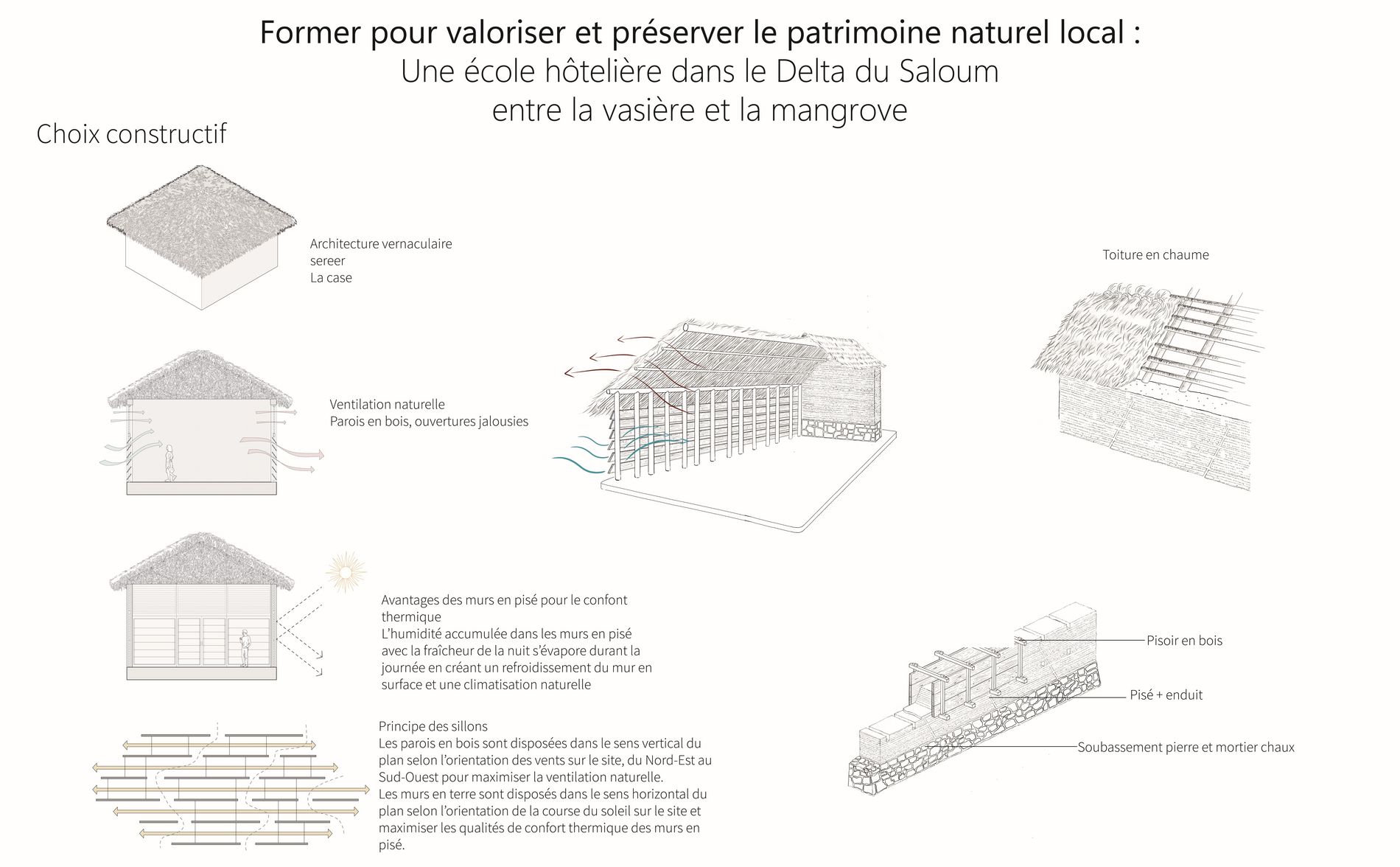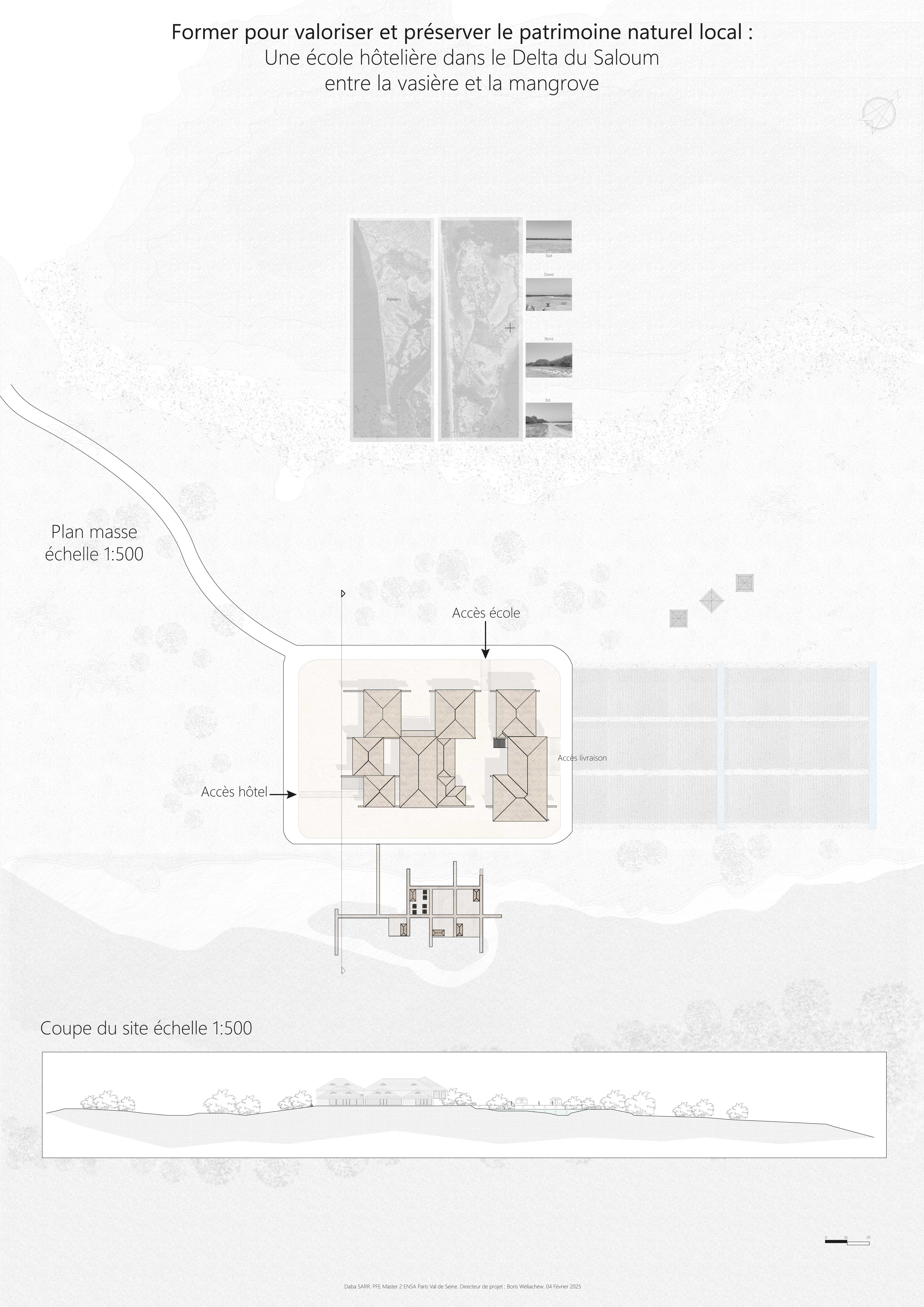 Située sur la côte ouest du Sénégal, le Delta du Saloum se distingue par ses paysages exceptionnels, d’environ 70 000 Hectares de mangroves, et un écosystème riche. Palmarin, est un village emblématique du Delta du Saloum. Il se distingue par sa proximité à la nature, notamment les mangroves, les bolongs et les zones humides. Cependant, comme beaucoup de localités rurales du Sénégal, le village de Palmarin est confronté à un des défis majeurs : un accès limité à des infrastructures éducatives et professionnelles. Si l’enseignement primaire et secondaire est accessible, les options pour l’enseignement supérieur ou la formation technique sont inexistantes. Les jeunes doivent se rendre dans des centres urbains tels que Dakar, Thiès ou Kaolack pour poursuivre des études universitaires ou techniques. Les plus grandes villes sont perçues comme des pôles d’opportunités, offrant une qualité de vie supérieure, des emplois diversifiés et des réseaux professionnels. Le départ massif des jeunes contribue à une diminution marquée de la population active dans la région. À Palmarin, l’abandon de plusieurs hôtels illustre une double problématique majeure. D’une part, l’érosion côtière, exacerbée par le changement climatique, menace les infrastructures touristiques situées en bord de mer, entraînant leur détérioration ou leur disparition. D’autre part, le manque de professionnels formés dans le secteur hôtelier freine le développement et la gestion durable de ces établissements. Ces défis soulignent l’urgence de préserver ce patrimoine naturel exceptionnel, qui est la première source d’économie de l’île, en proposant des solutions durables et en renforçant les capacités humaines pour préserver ce territoire. C’est dans ce contexte que s’inscrit mon projet de fin d’études : la conception d’un centre de formation supérieure des métiers de l’hotellerie, artisanaux et agricole à Palmarin. Mon ambition réside à contribuer à la formation d’une nouvelle génération de professionnels en leurs offrant les outils pour valoriser le patrimoine exceptionnel du Delta du Saloum. En adoptant une approche systémique, j’ai cherché à comprendre les multiples interactions entre le site, les habitants, et les dynamiques socio-économiques locales. J’ai souhaité concevoir un projet qui dialogue avec l’âme de Palmarin, en s’appuyant sur des matériaux locaux, des techniques durables, et une architecture qui s’intègre harmonieusement dans le paysage.