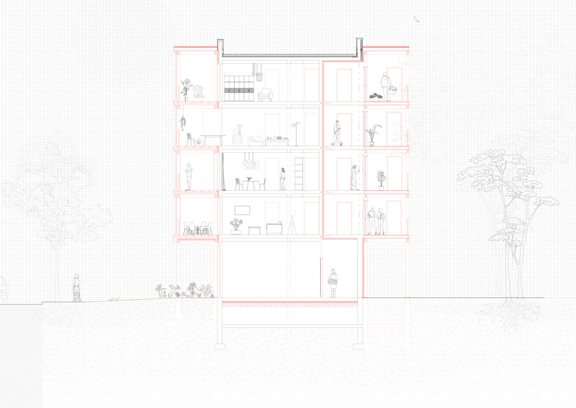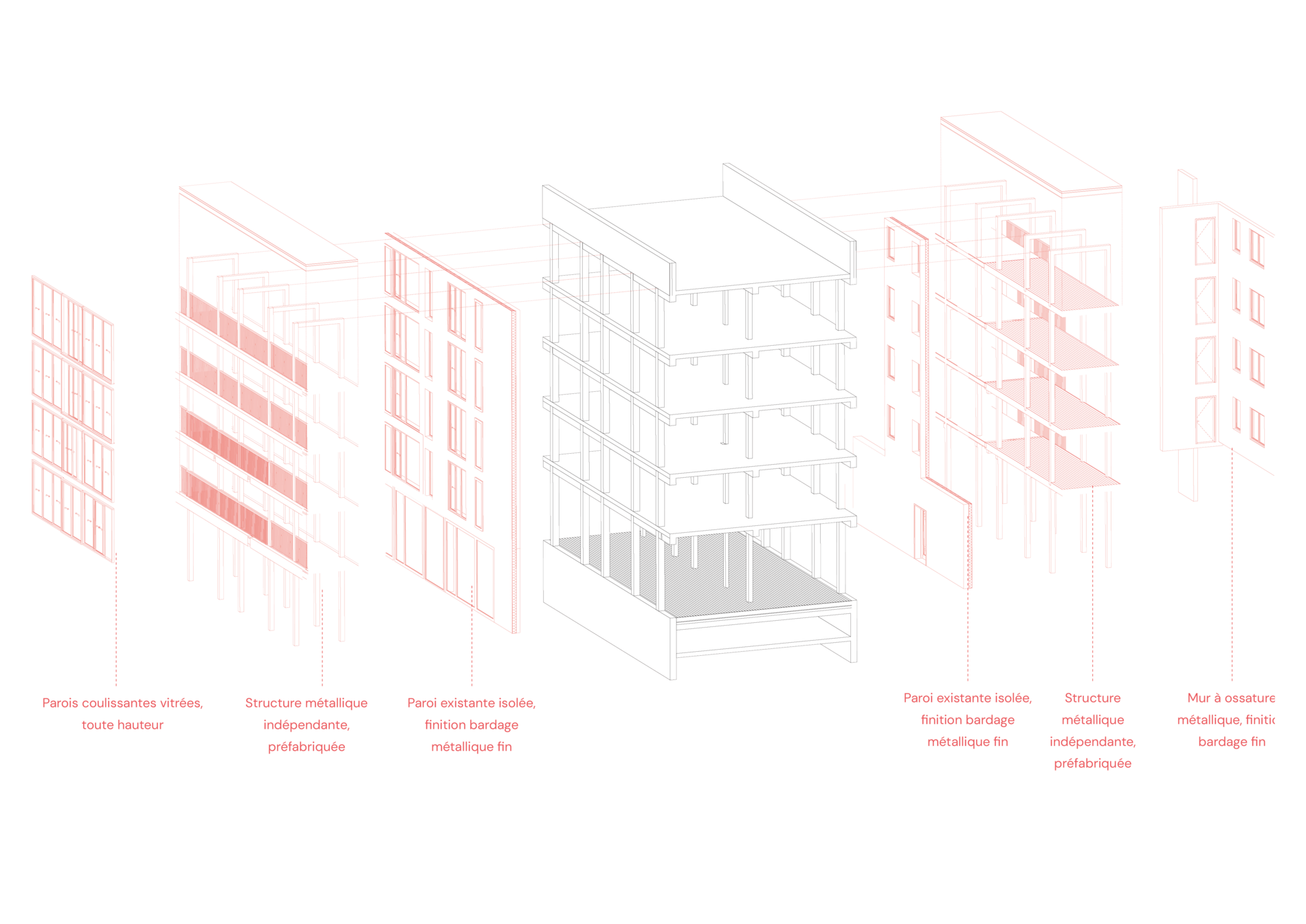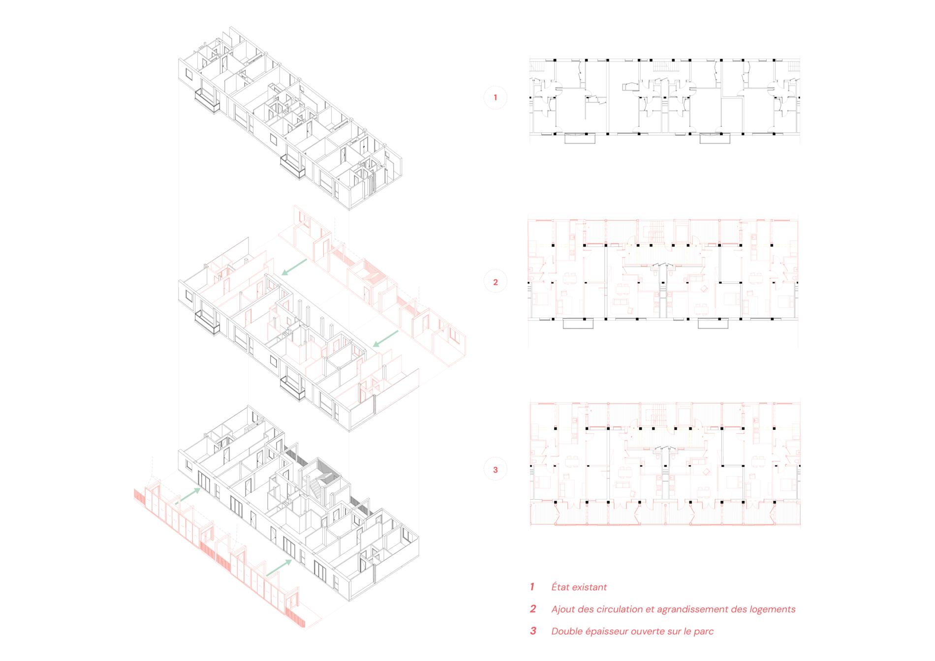 Ce projet de fin d’études porte sur le grand ensemble de la Vallée aux Renards, entre Fresnes et l’Haÿ-les-Roses (Val-de-Marne). Il interroge le devenir du quartier face à la menace de démolition, en valorisant ses qualités architecturales et paysagères. Sur le plan urbain, l’intervention redonne une centralité par la création d’une place publique et de commerces à l’entrée, et recompose des îlots générant de nouveaux paysages intérieurs à partir de l’existant. À l’échelle architecturale, le bâtiment longeant le parc est reconsidéré dans son épaisseur : les logements sont agrandis, remis aux normes côté cœur d’îlot, et dotés de terrasses et jardins d’hiver côté parc, offrant de nouvelles qualités d’usage. Cette stratégie, rendue possible par la répétitivité et la structure en béton armé, est reproductible à l’ensemble du quartier. Enfin, l’intervention est pensée par phases pour maintenir les habitants sur place, en mobilisant les logements vacants pour les reloger temporairement. Le choix d’une structure métallique, venant se greffer de part et d’autre des immeubles, accompagne cette démarche.