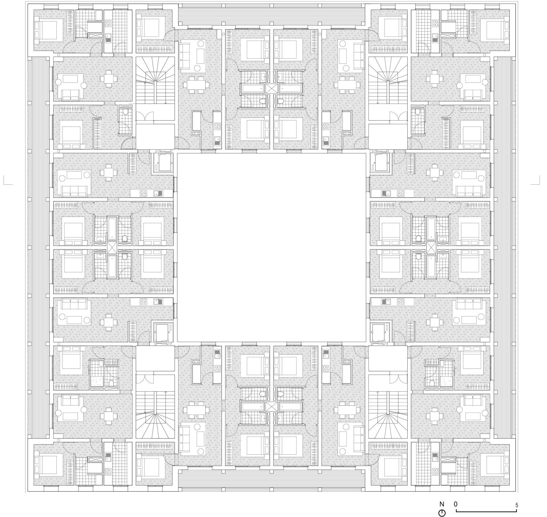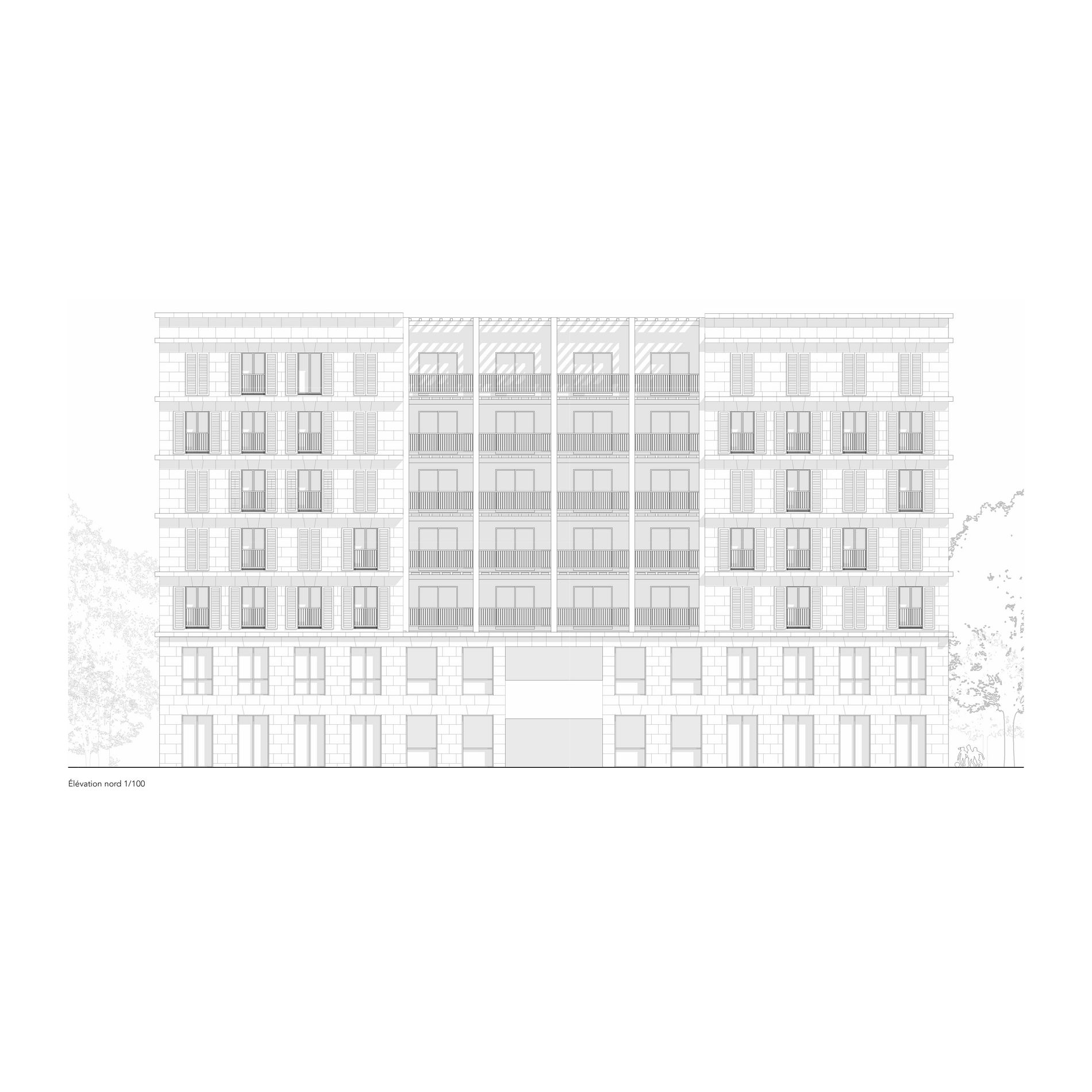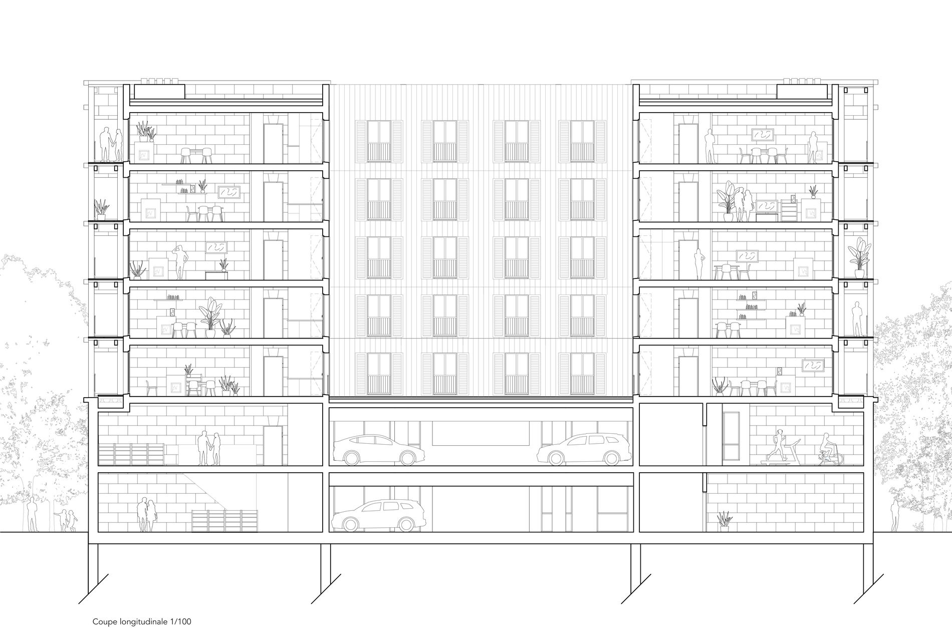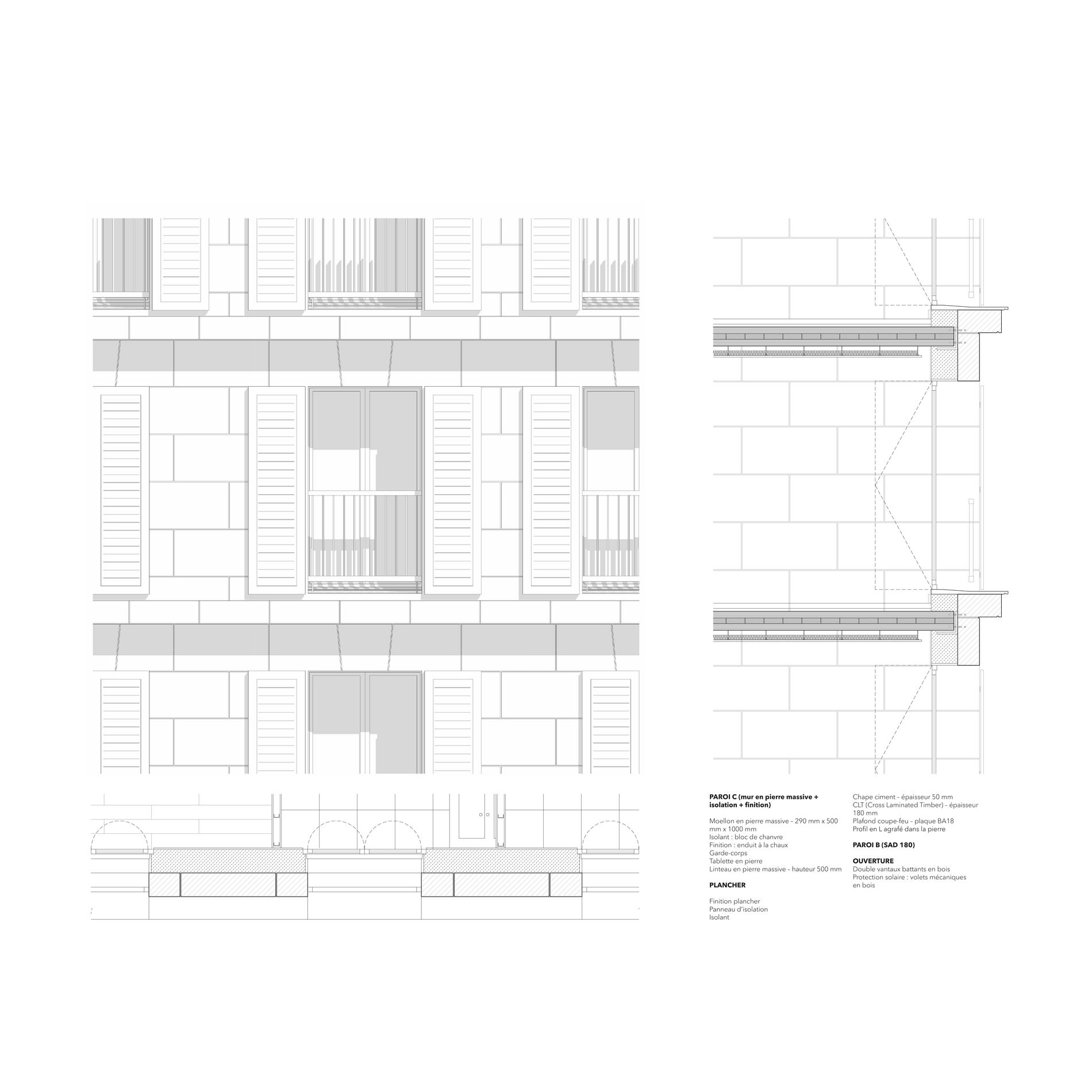 Le projet a été pensé en partant du détail constructif, avant d’être implanté dans un second temps sur un site de la métropole bordelaise. La pierre et le bois, matériaux emblématiques de la Gironde, rythment le plan et la façade. Des moellons de pierre massive sont utilisés en murs de refend, libérant les espaces et permettant la création de logements traversants. L’étude de projets en pierre massive (de l’agence Barrault Pressacco et de Gilles Perraudin) a permis d’évaluer l’inertie thermique des pignons : la solution retenue associe 28 cm de pierre et 25 cm de bloc de chanvre, garantissant un déphasage supérieur à 24 h et respectant les exigences thermiques, là où un mur en pierre seule nécessiterait 8,5 m d’épaisseur. Les façades à ossature bois se développent le long des balcons et à l’intérieur du plan, côté patio. Le plan d’étage courant accueille douze logements aux typologies variées (T3 à T4), adaptés aussi bien aux familles qu’aux colocations étudiantes.