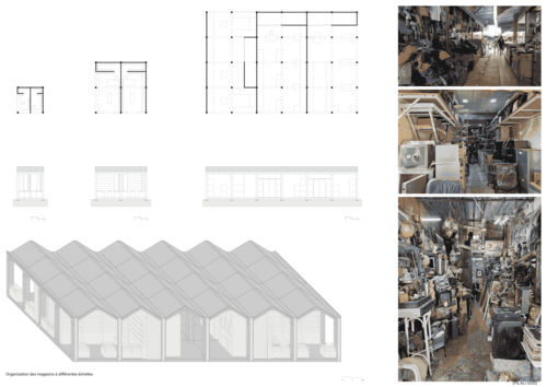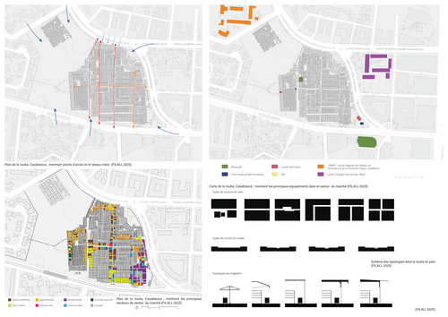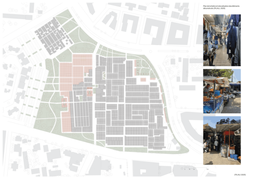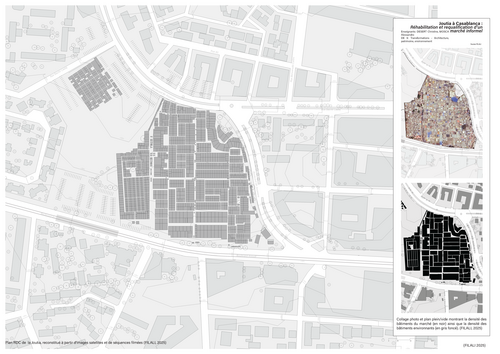 La Joutia de Derb Ghallef, au cœur de Casablanca, constitue l’un des marchés informels les plus emblématiques du Maroc. Densité spatiale, réseaux sociaux intenses et organisation économique alternative en font un microcosme urbain unique, né dans les marges de la ville planifiée. Véritable patrimoine vernaculaire du commerce, il s’est construit à travers la récupération, l’adaptation et l’intelligence collective, tout en échappant aux cadres institutionnels. Pourtant, ce tissu fragile fait face à de multiples pressions : risques d’incendies, insalubrité, saturation, contraintes foncières et projets de résorption. Ce projet de fin d’études propose une réhabilitation respectueuse de son identité, articulant diagnostic architectural et proposition d’aménagement. À travers des stratégies modulaires, l’introduction de lisières plantées, la création d’espaces publics ouverts et la relocalisation de certaines activités, l’objectif est d’améliorer la sécurité, la lisibilité et le confort sans effacer la vitalité propre du lieu. Il s’agit de penser la transformation non comme normalisation, mais comme reconnaissance d’un patrimoine vivant, moteur d’innovation et acteur à part entière de la fabrique urbaine contemporaine. Le projet propose de considérer l’informel comme une ressource urbaine et non une anomalie, invitant à concevoir des outils de planification souples, inclusifs et adaptés aux dynamiques populaires.
