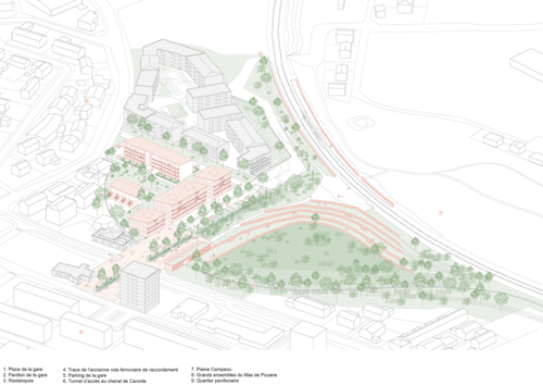 À grande échelle, une promenade relie la gare aux berges du chenal. À l’échelle urbaine, des restanques prolongent les quais en gradins publics, un pavillon crée le lien entre la rue et la gare et des logements ancrent le lieu dans la vie du quartier. Ce nouveau modèle de gare dans ce territoire crée un support d’usages quotidiens, pas seulement un point d’arrêt. Croix-Sainte devient un pôle de vie, capable de requalifier une portion oubliée de la Côte Bleue.