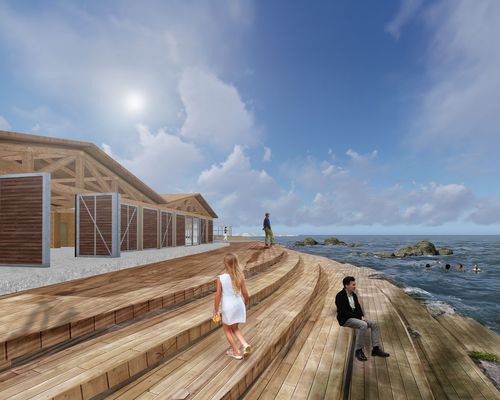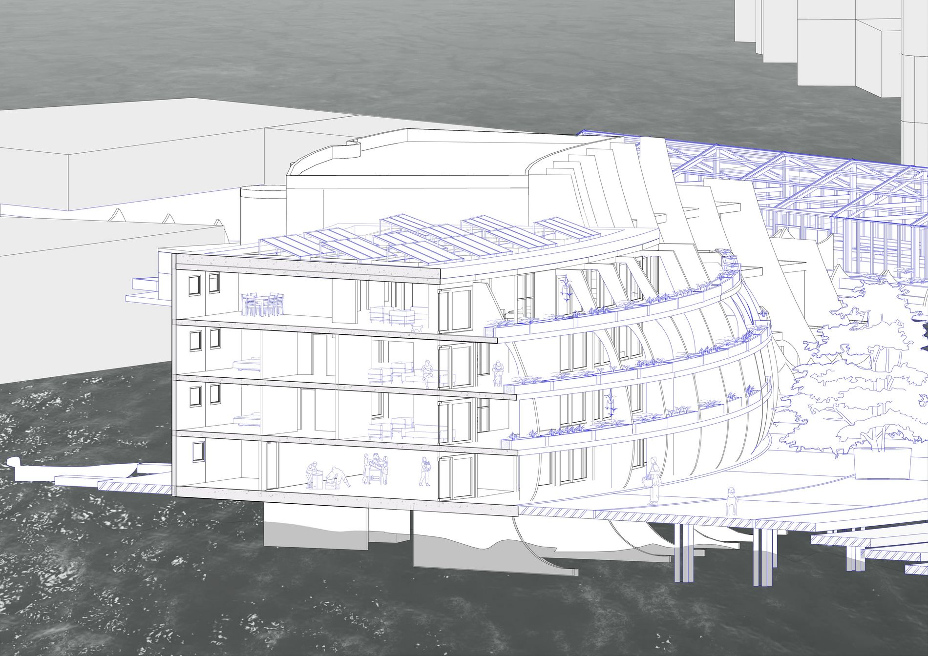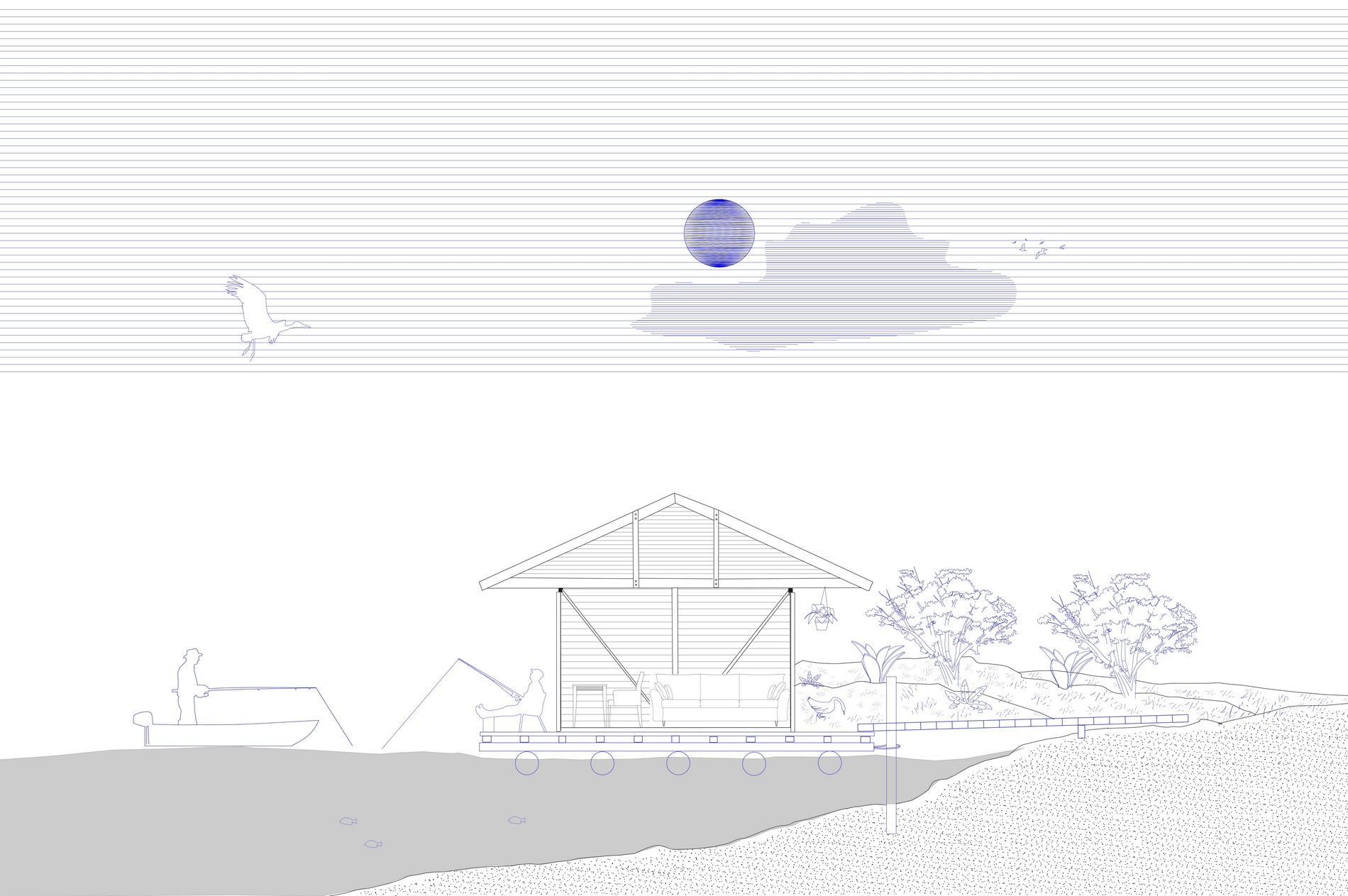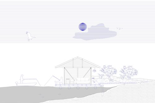 À partir d’une lecture territoriale et de rencontres sur place, j’ai choisi d’accepter ce risque et d’en faire la matière même du projet. Je propose trois stratégies complémentaires dans les quartiers du Couchant, du Levant et des campings : adapter l’existant en l’élevant au-dessus de l’eau, transformer la plage en une digue-paysage habité, et réinventer les campings en structures flottantes.