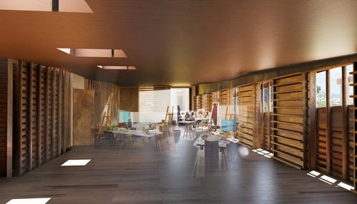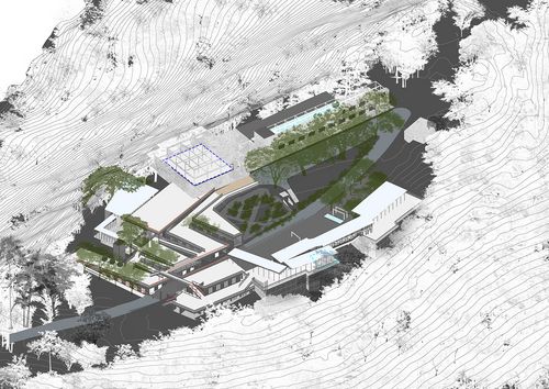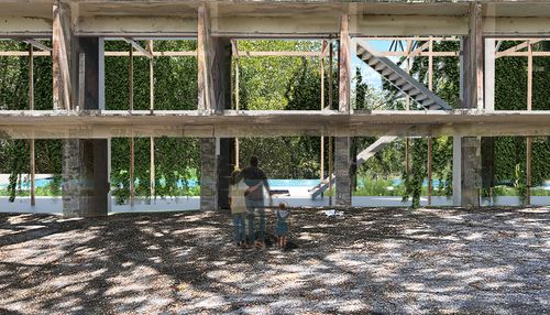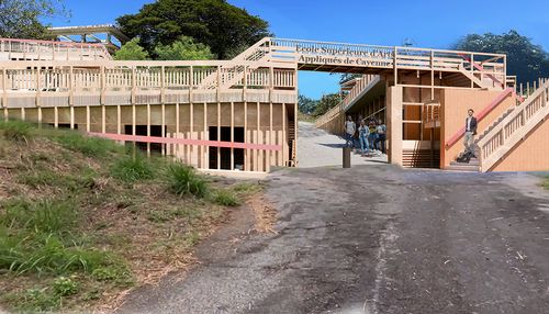 Une École d’Art Appliquée Coopérative vient soutenir le programme d’un parc qui gravit le mont à la redécouverte de son héritage architectural. Le récit d’une rencontre entre deux amants dont les visiteurs deviennent les personnages se transforme en promenade pittoresque, comme rituel d’union entre les nombreuses cultures et populations qui habitent la Guyane.