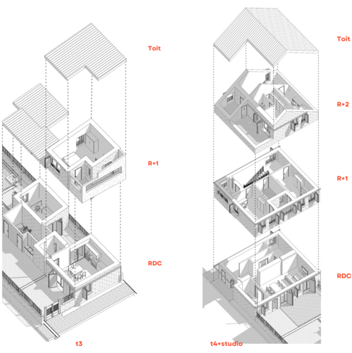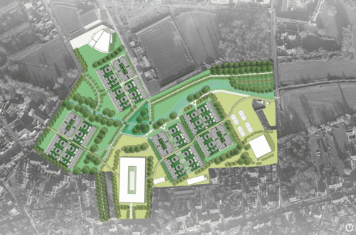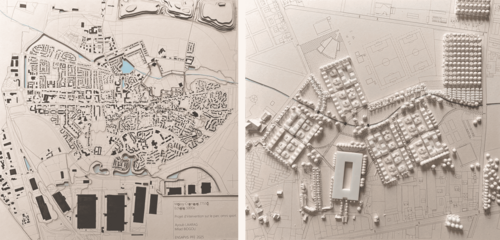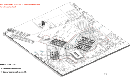 Le projet s’inscrit dans la commune de Moissy-Cramayel (77550), en Seine-et-Marne. Le site d’étude, un parc omnisport de 12 ha en lisière du centre-ville et des terres agricoles, comprend 7 terrains de football, des terrains de tennis, une salle polyvalente, un centre aquatique et un ruisseau. Aujourd’hui sous-utilisé, ce site présente un réel potentiel de requalification. Le projet propose de densifier cet espace en construisant sur les terrains de football existants pour y implanter logements, commerces et un parking silo. L’idée forte est d’avoir une surface de sol naturel supérieure à celle des surfaces bâties, d’où le choix d’îlots compacts. Le tout s’inscrit dans une trame paysagère existante, notamment par la valorisation et le prolongement de la trame bleue. Ce projet se distingue par une approche alternative d’urbanisation, plus respectueuse du site, différente des pratiques actuelles en périphérie, souvent plus minérales et consommatrices d’espace.