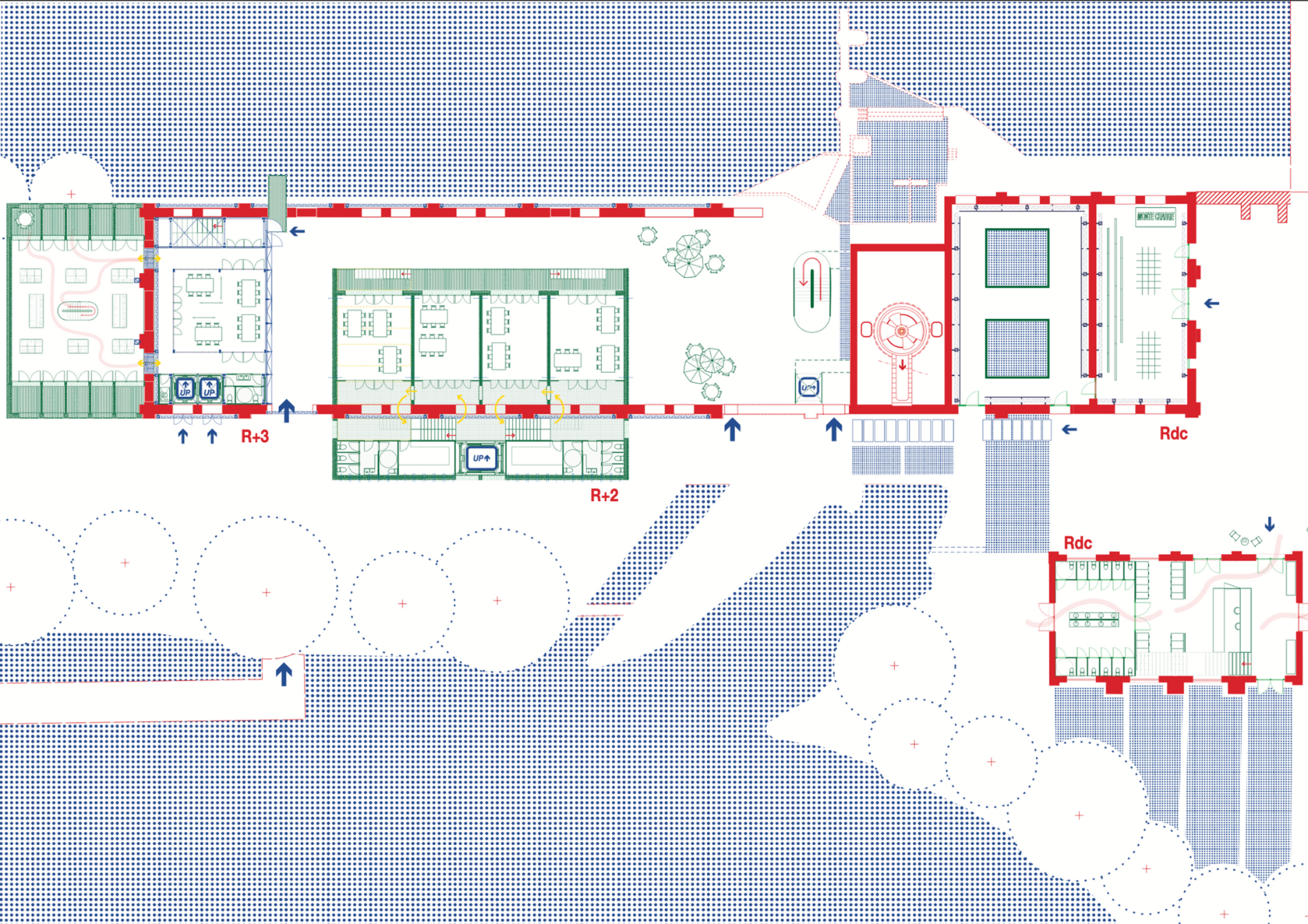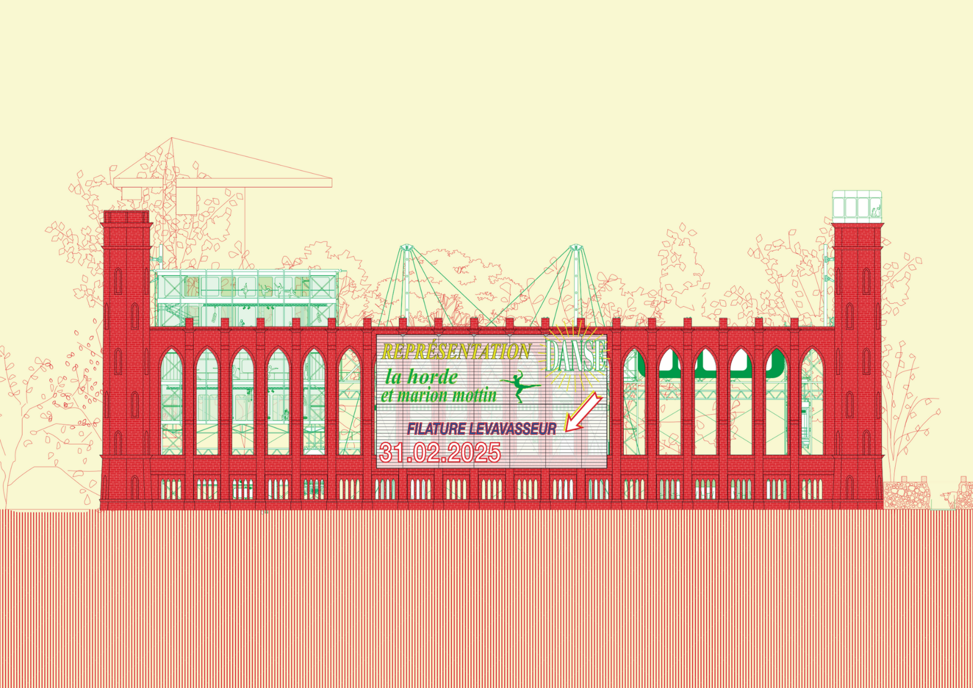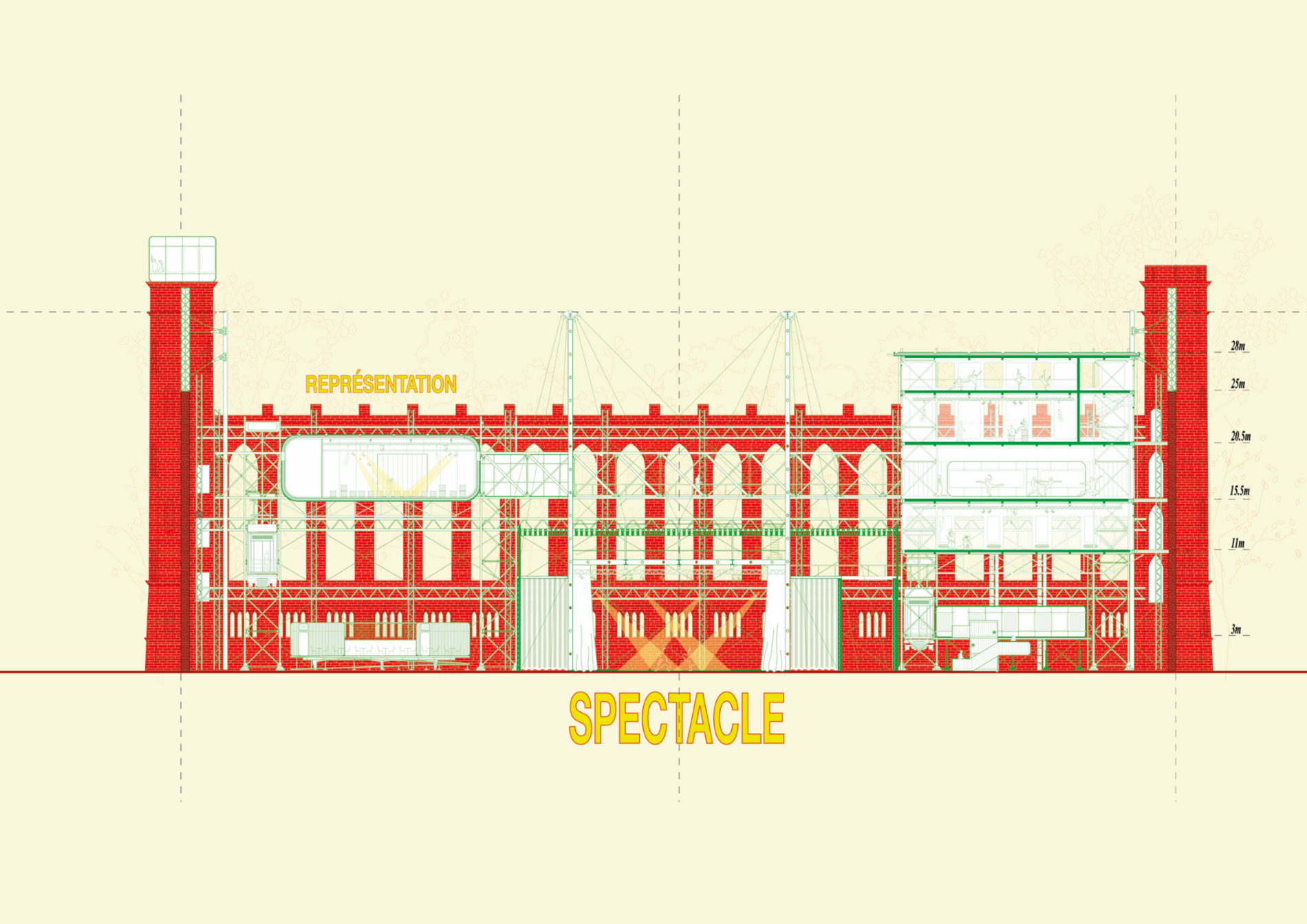 L’ancienne Filature Levavasseur de Pont-Saint-Pierre près de Rouen, est aujourd’hui en ruine, elle s’élève sur une presqu’île comme un symbole monumentale de la vallée. Trois temps structurent le programme: au bout, des logements, lieux intimes et privé dédié au temps long ; puis l’école dans la petite filature, qui suit un rythme plus quotidien dédié à l’apprentissage des savoir-faire de la région ; la grande filature, elle, crée l’évènement, devient un lieu de représentation ouvert toute l’année, devenant repère pour les habitant de vallée.