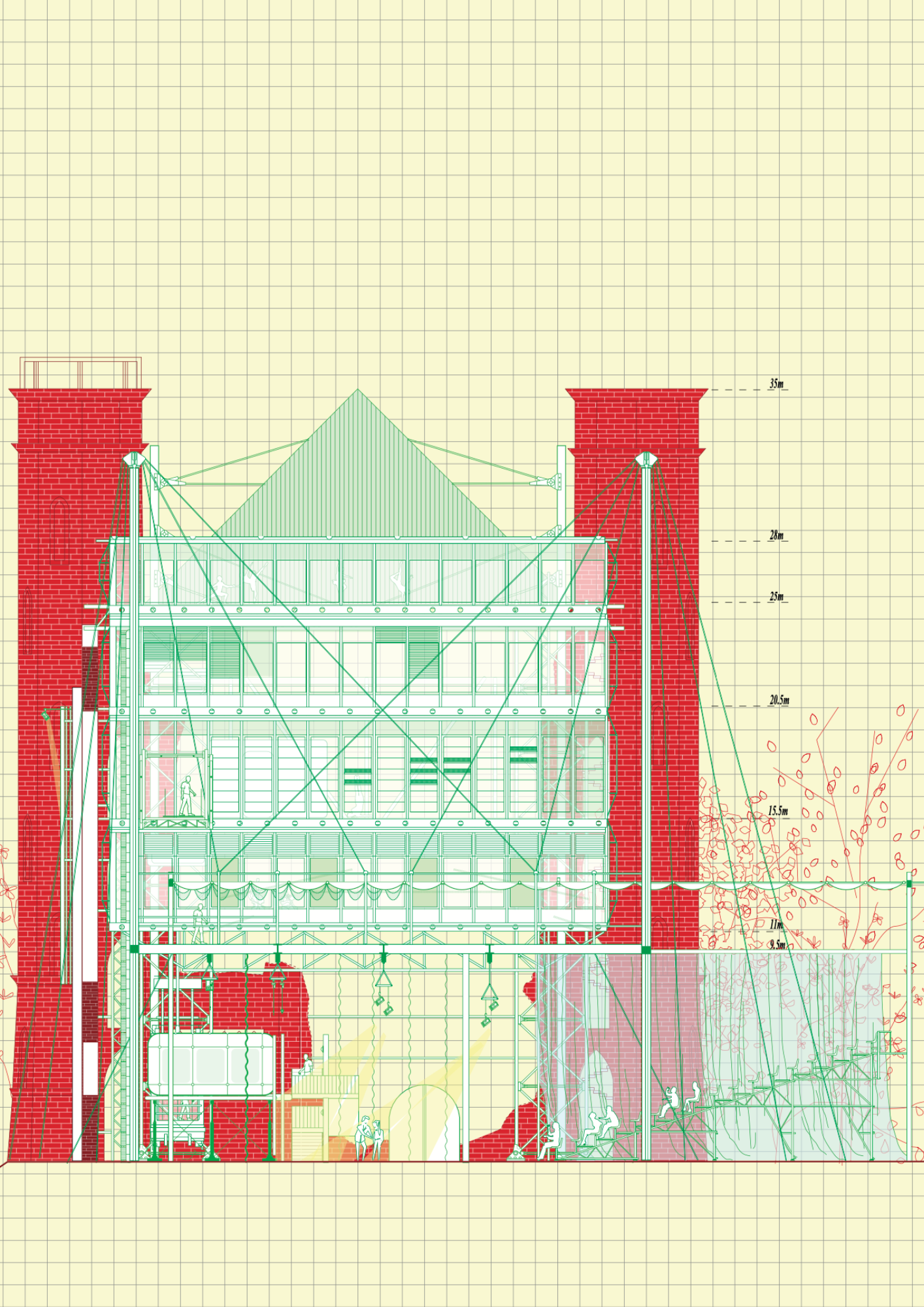 Ces programmes coexiste, tissant des seuils, effectuant une gradation du privé vers le public le long de la promenade sur l’île. Ce projet se veut une réhabilitation du patrimoine, conçue comme laboratoire. Le pastiche néogothique initial du lieu, aide a déceler l’ironie comme point de départ, et a nourri l’ambition de réinterpréter ce symbole, d’expérimenter autour de ce patrimoine vu comme intouchable. En y projetant un projet inspiré des utopies des années 1970, naissent des questions entre héritage et prospective, dans ce monde qui à changé et où l’urgence écologique redéfinie nos responsabilités. Ainsi, cette réhabilitation s’assume comme un essai qui confrontent deux visions, tout en cherchant à rester réversible.