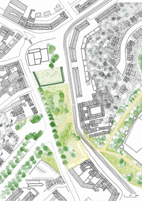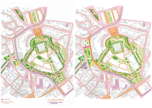 Le projet a donc pour but de décentraliser le LABA et de l’ouvrir sur la ville. Une portion de la rue de geôle devient piétonne et le site se raccroche à la promenade du château par un jardin. On peut donc à présent déambuler depuis la fac à pied faire le tour du château et rejoindre le jardin botanique en passant par le jardin de la Mare.
