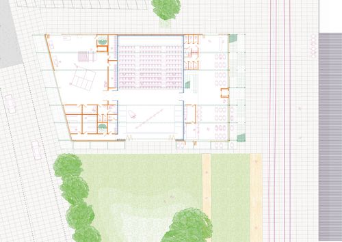 Le théâtre agit comme une porte d’entrée du jardin, qu’on aperçoit à travers le hall d’abord depuis la place publique