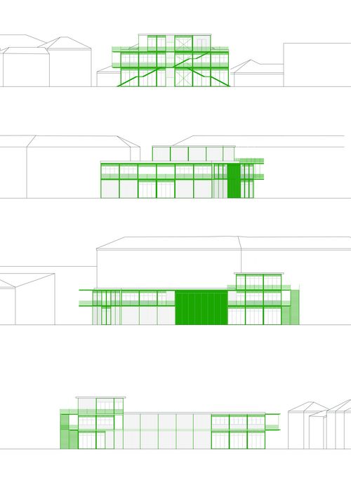 Le projet peut se voir comme une promenade ou l’on commence par une place piétonne minérale agissant comme une place de quartier, un sol vient relier les commerces de la rue de geôle avec l’entrée de la maison des adolescents et du théâtre.