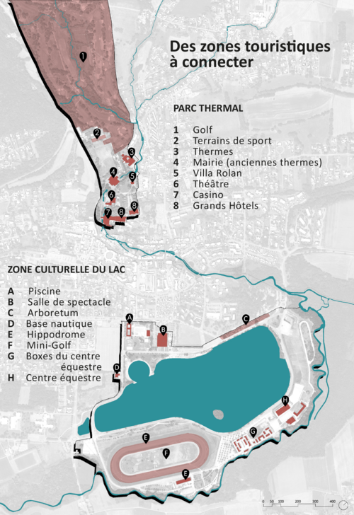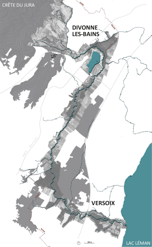 Divonne vient du latin div (divin) et du celte onna (eau, source). Son nom signifie donc « eau divine » ou « sources divines ». Pourtant, la place de l’eau dans la ville semble peu à peu s’estomper. Au fil des siècles, Divonne-les-Bains s’est appuyée sur cette ressource pour se développer : roues hydrauliques, thermalisme, tourisme des années 60, avec lac artificiel et activités de plein air. Mais avec l’essor de la métropole du Grand Genève, Divonne devient peu à peu une ville-dortoir, oubliant son identité de ville d’eau. Pourtant, l’eau est toujours là !