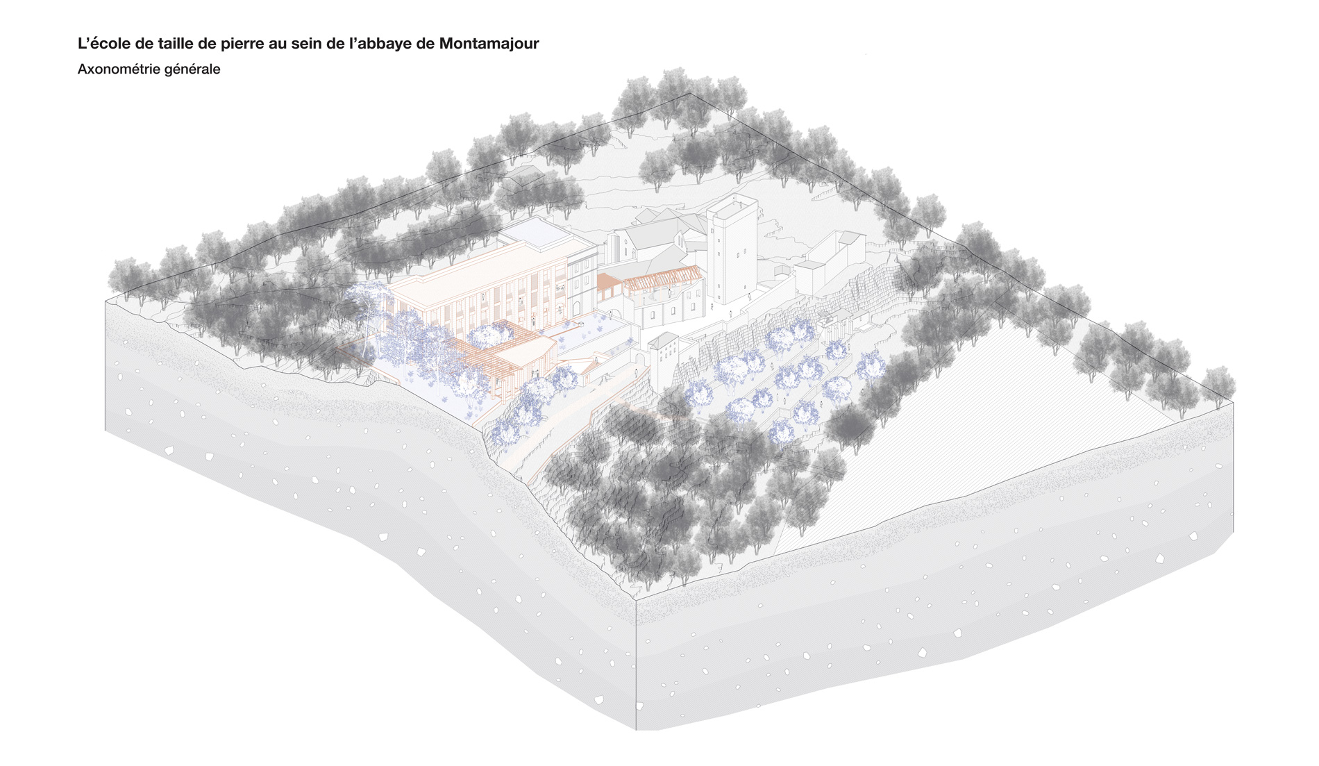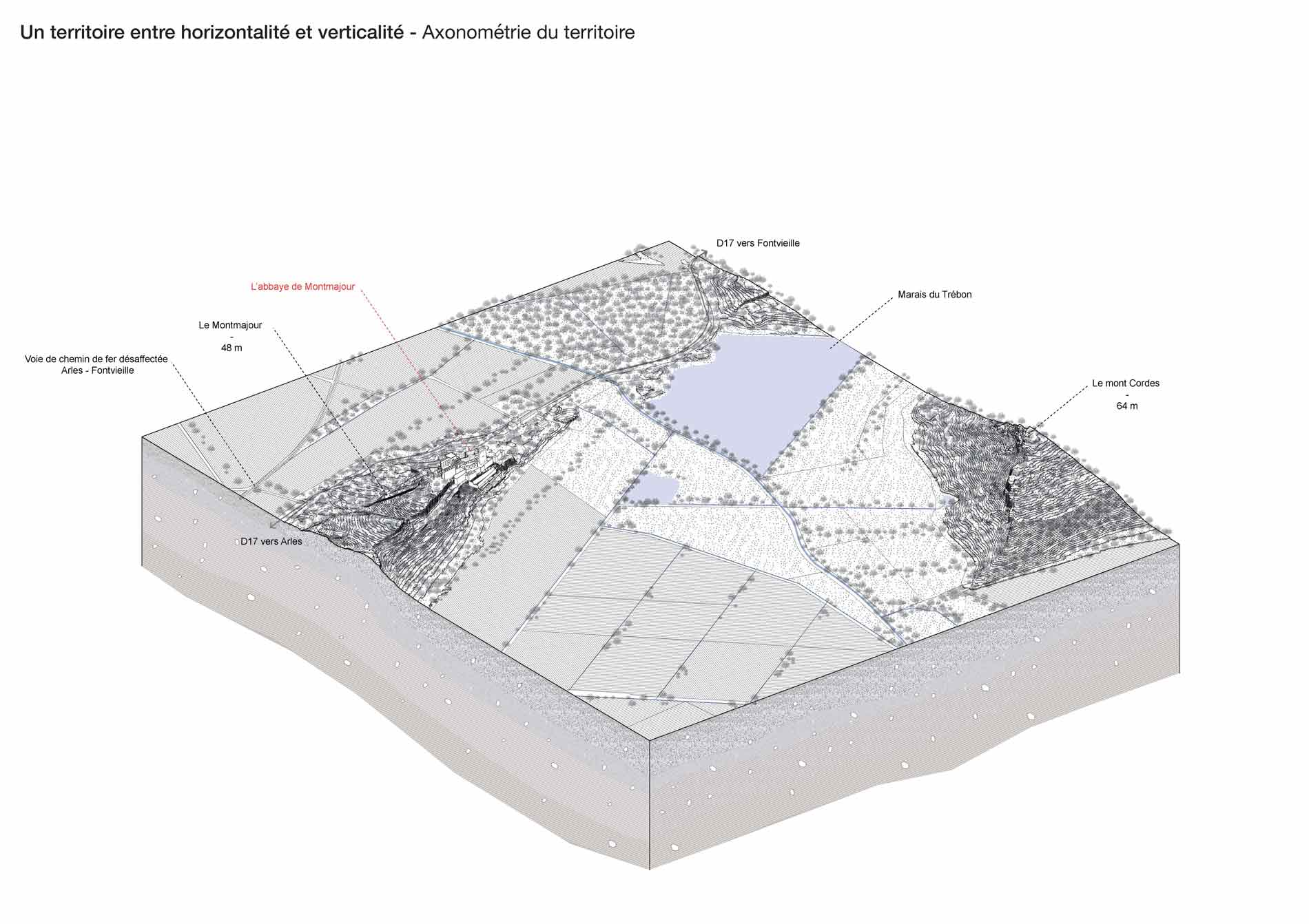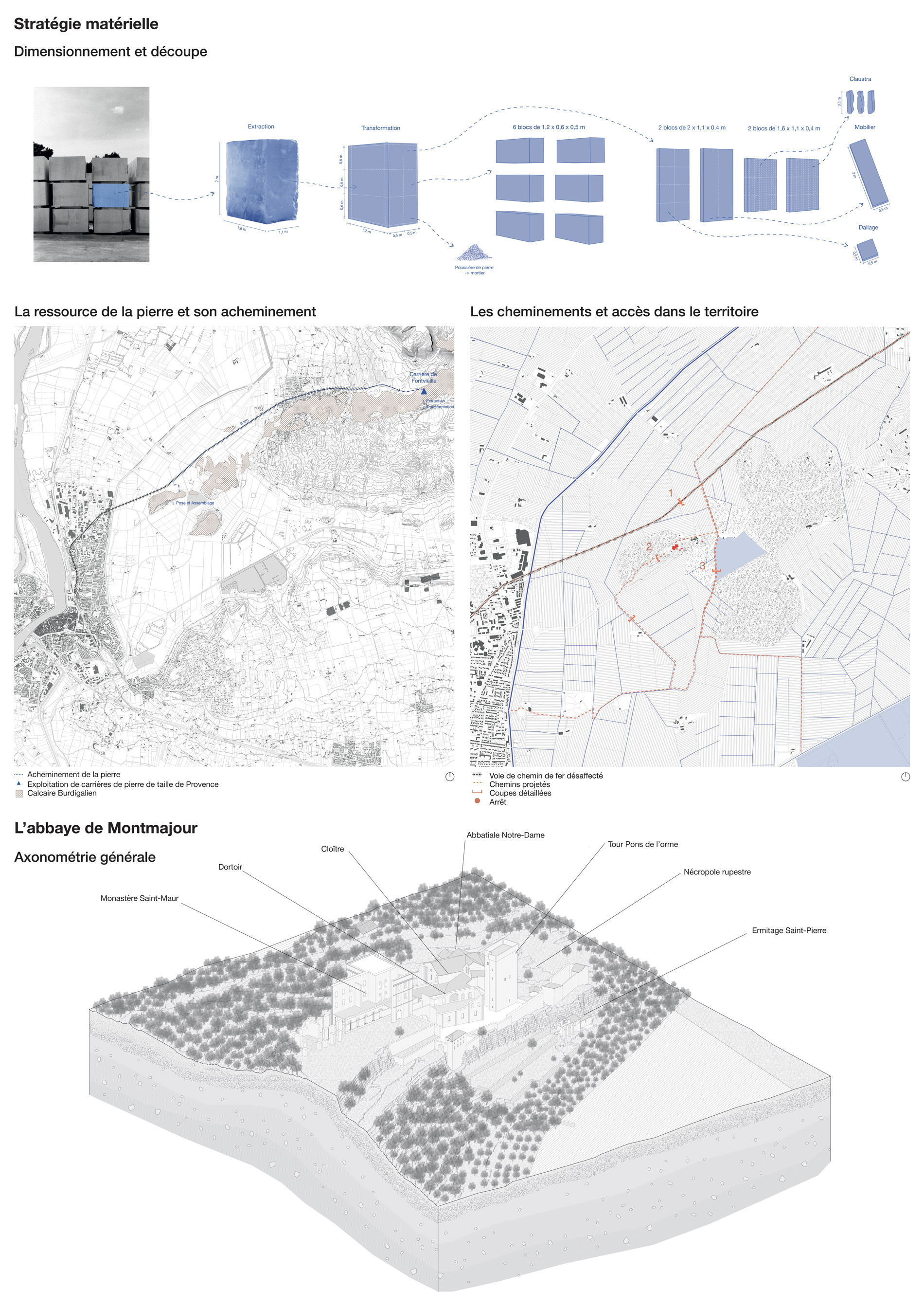 Ce projet de fin d’études se développe autour de la question patrimoniale et paysagère de la ruine, sur l’aile mauriste de l’abbaye de Montmajour. C’est une ancienne abbaye bénédictine située à 4km au Nord-Est de la ville d’Arles. Elle surplombe son territoire depuis l’éperon rocheu du Montmajour sur lequel elle est assise. L’abbaye de Montmajour a été construite du 11e aux 18e siècle. Cette ruine interroge donc sur son avenir. Dans ce projet, la posture a été de travailler sur une extension contemporaine en retravaillant sur sa volumétrie à travers le développement d’une école de taille de pierre. Le projet est traité autour de la question matérielle de la pierre, en fonction des dimensions des blocs extraits de la carrière de Fontvieille. L’intervention consiste en deux parties, la première sur la prolongation du bâtiment sur l’emprise de la ruine, puis sur la terrasse haute comme jardin. L’atelier principal tient lieu dans l’ancien réfectoire et s’ouvre sur une coursive semi-extérieure puis au Sud sur le jardin. Cette coursive permet de relier les deux extrémités du bâtiment avec les espaces communs tout en offrant une extension de l’atelier vers le jardin.