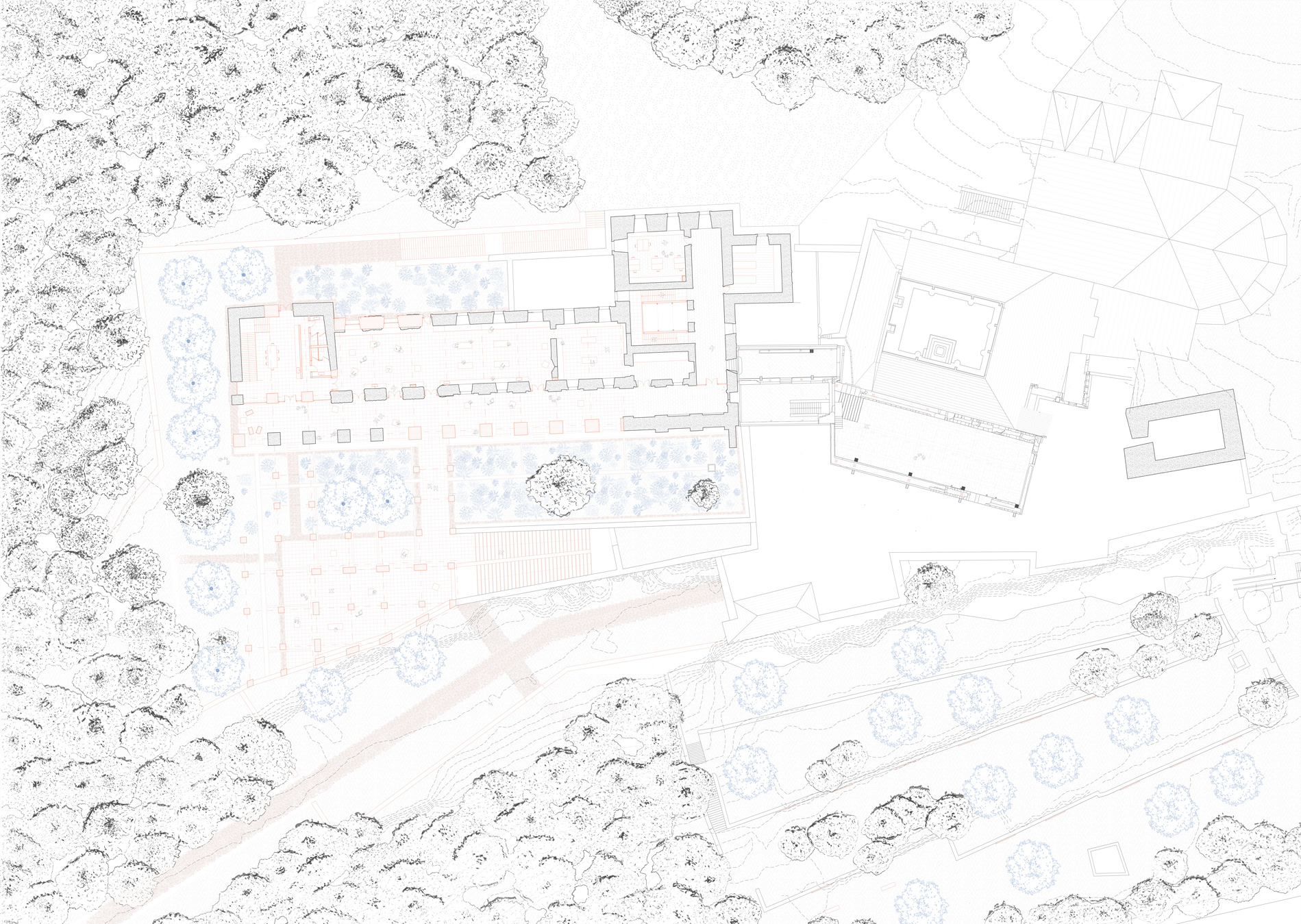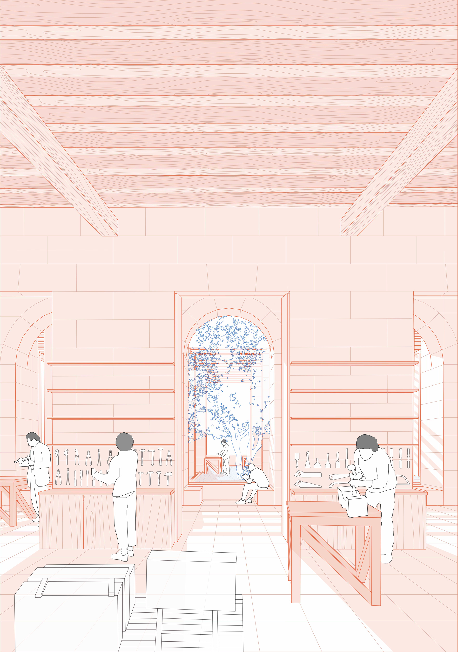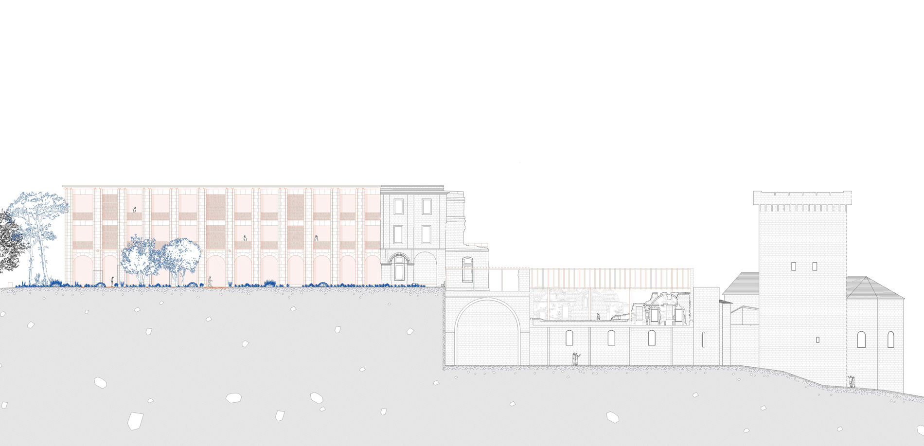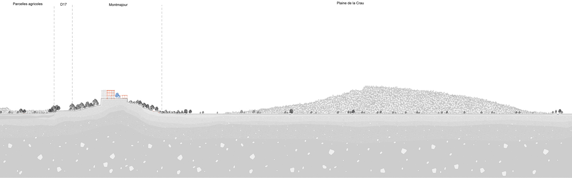 Ce projet de fin d’études se développe autour de la question patrimoniale et paysagère de la ruine, sur l’aile mauriste de l’abbaye de Montmajour. C’est une ancienne abbaye bénédictine située à 4km au Nord-Est de la ville d’Arles. Elle surplombe son territoire depuis l’éperon rocheu du Montmajour sur lequel elle est assise. L’abbaye de Montmajour a été construite du 11e aux 18e siècle. Cette ruine interroge donc sur son avenir. Dans ce projet, la posture a été de travailler sur une extension contemporaine en retravaillant sur sa volumétrie à travers le développement d’une école de taille de pierre. Le projet est traité autour de la question matérielle de la pierre, en fonction des dimensions des blocs extraits de la carrière de Fontvieille. L’intervention consiste en deux parties, la première sur la prolongation du bâtiment sur l’emprise de la ruine, puis sur la terrasse haute comme jardin. L’atelier principal tient lieu dans l’ancien réfectoire et s’ouvre sur une coursive semi-extérieure puis au Sud sur le jardin. Cette coursive permet de relier les deux extrémités du bâtiment avec les espaces communs tout en offrant une extension de l’atelier vers le jardin.
