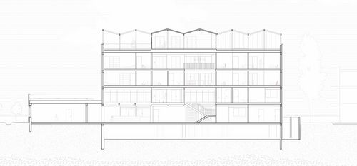 L’isolation et la texture de la façade est repensée en pierre calcaire et chaux. Le patio en rez-de-chaussée est agrandi pour laisser entrer la lumière, tout comme les sheds. Des balcons sont ajoutés au sud pour protéger du soleil et ouvrir les logements sur le canal. Ils sont reliés à une structure en toiture qui abrite des espaces de repos et d’activités.