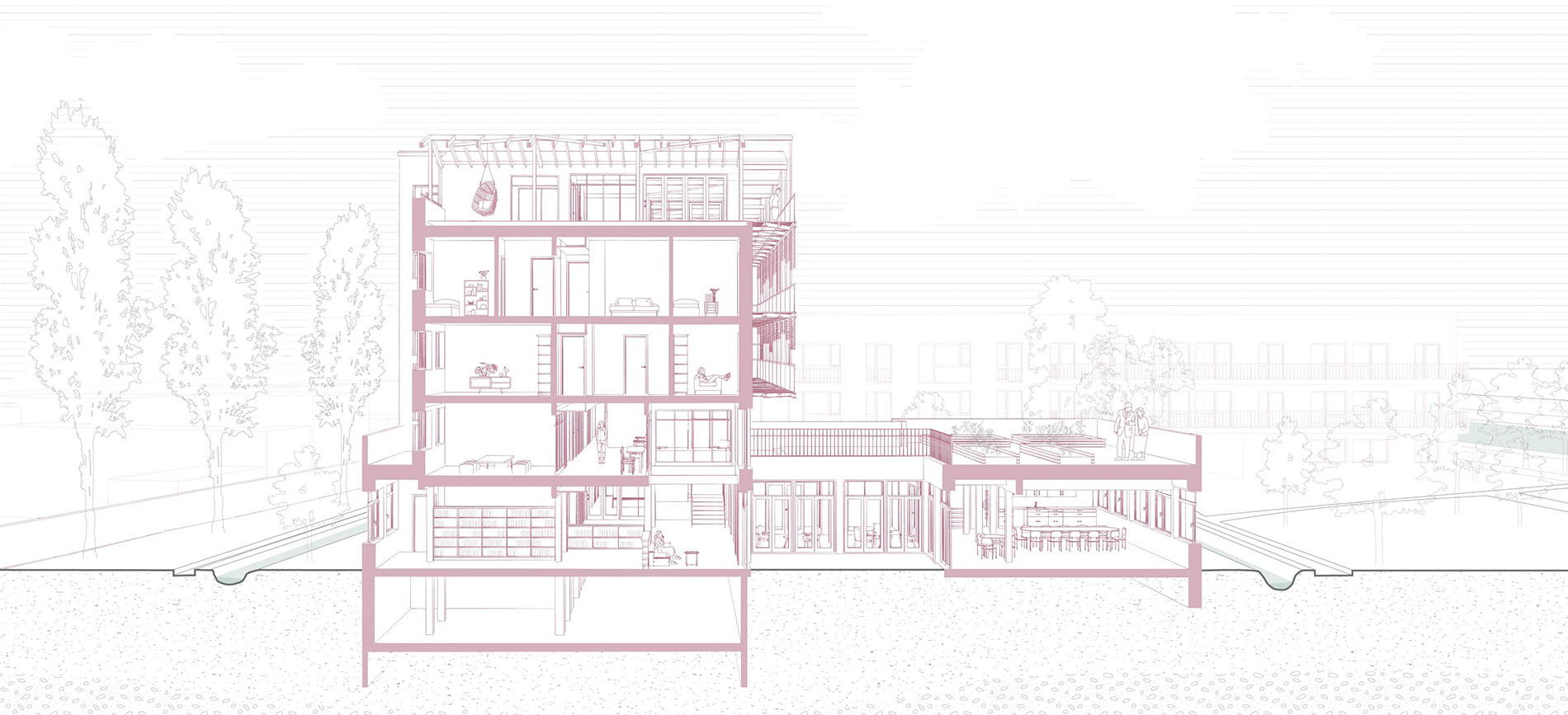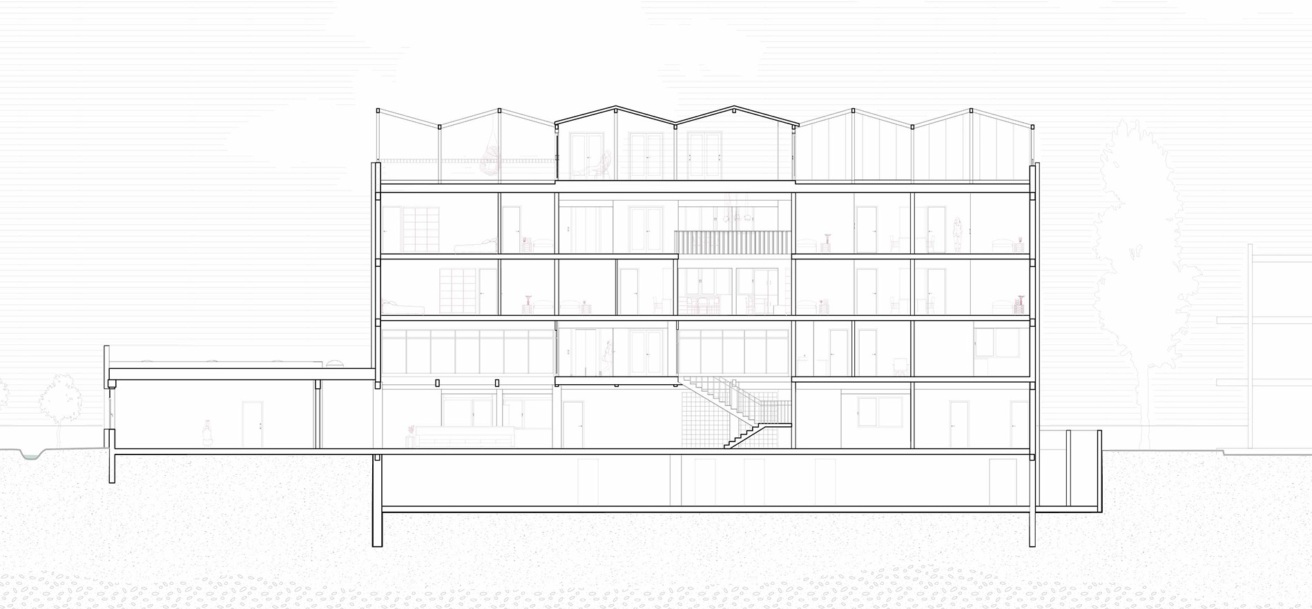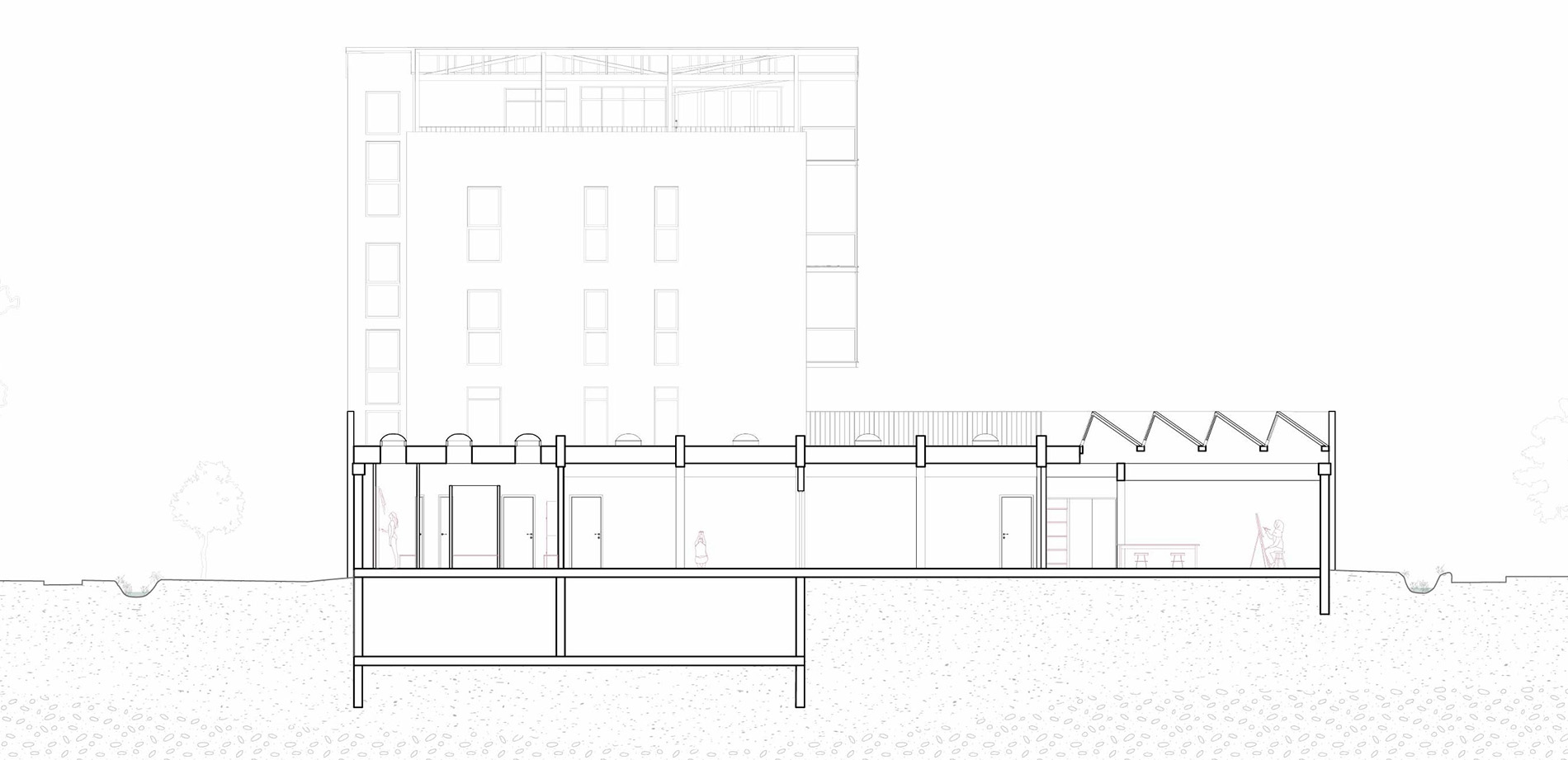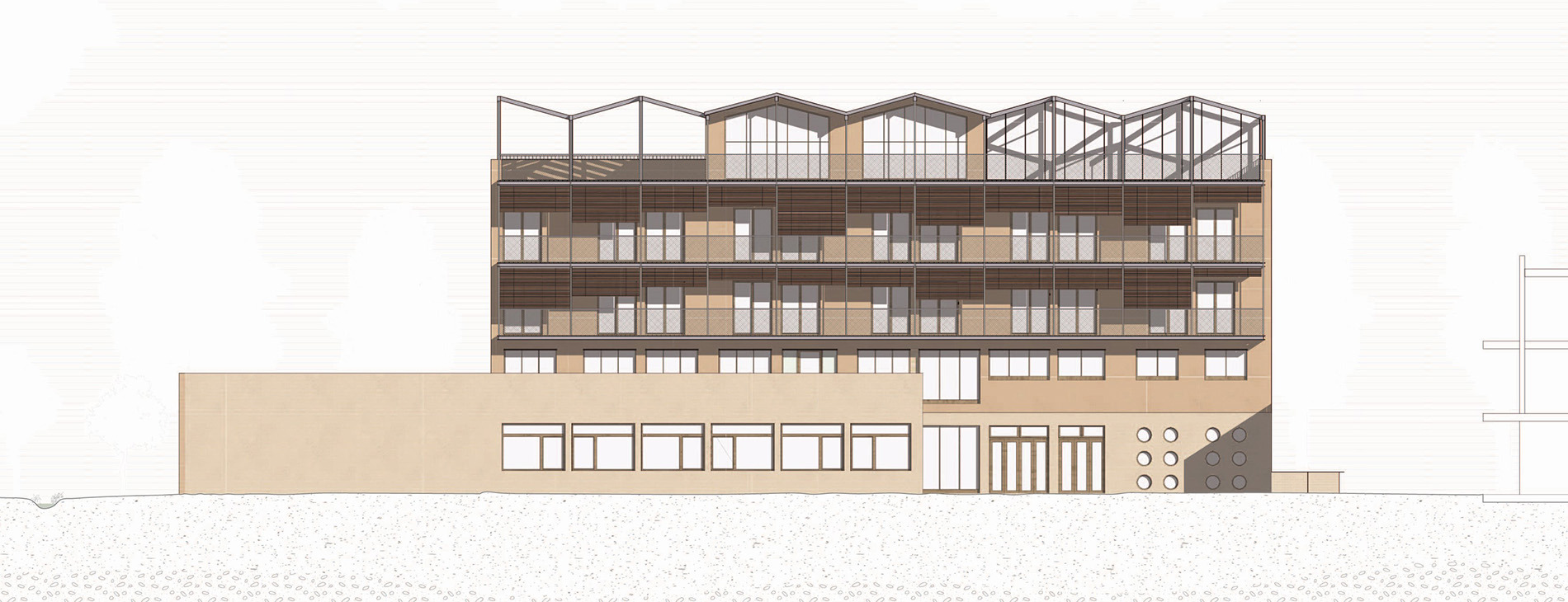 L’isolation et la texture de la façade est repensée en pierre calcaire et chaux. Le patio en rez-de-chaussée est agrandi pour laisser entrer la lumière, tout comme les sheds. Des balcons sont ajoutés au sud pour protéger du soleil et ouvrir les logements sur le canal. Ils sont reliés à une structure en toiture qui abrite des espaces de repos et d’activités.
