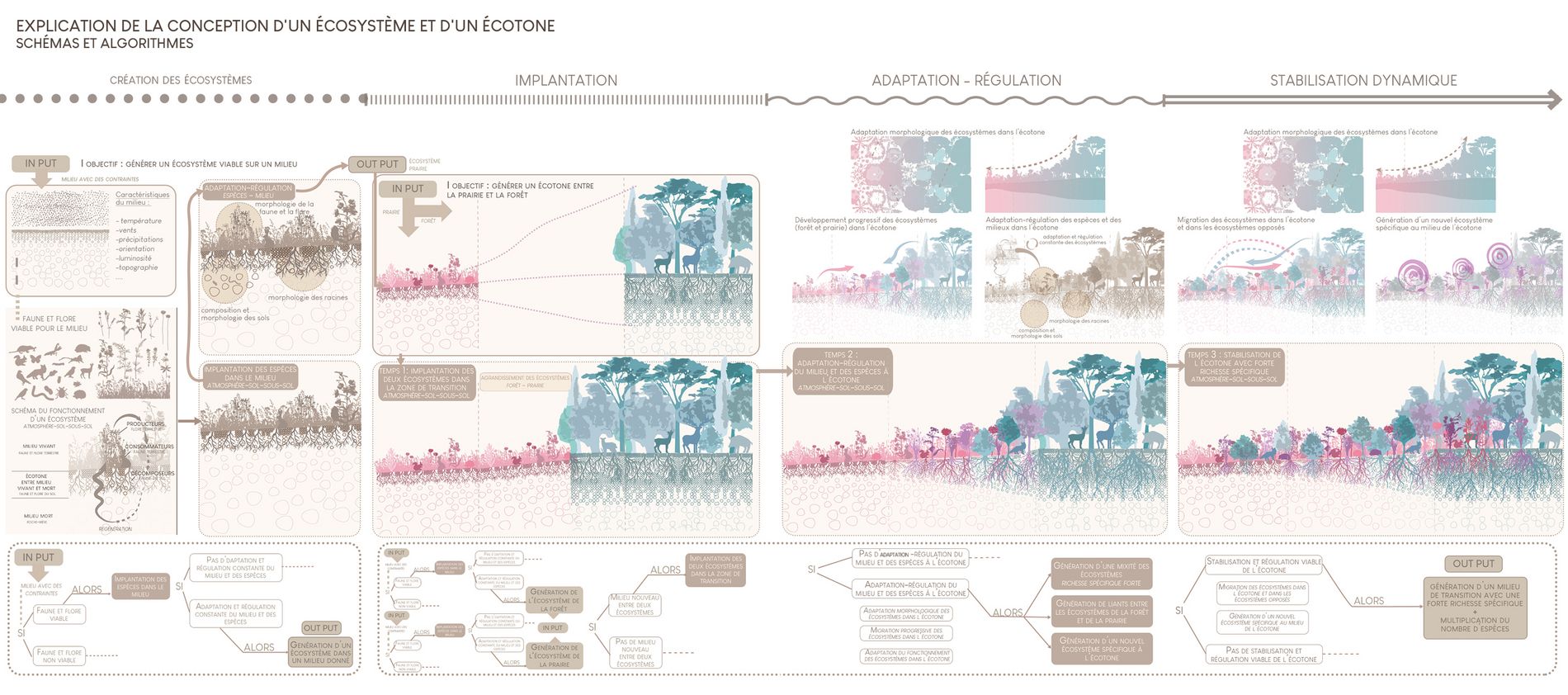 L’étude historique a montré que cette fracture s’est renforcée au fil du temps, notamment avec le projet EuroMéditerranée, qui risque d’aggraver la ségrégation en traçant une séparation nette entre les quartiers nord précaires et les zones gentrifiées du périmètre. Face à ce constat, le projet dépasse le cadre analytique pour proposer une réponse concrète : s’inspirer de l’écotone, zone de transition naturelle riche en biodiversité, qui symbolise équilibre, mixité et régénération. Appliqué au contexte urbain, ce concept permet d’imaginer un espace de médiation capable de reconnecter des territoires fragmentés.