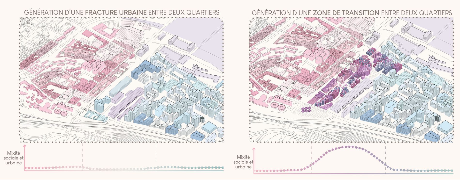 L’objectif est de créer une zone de transition urbaine et sociale qui favorise la mixité, rééquilibre les dynamiques socio-économiques et réduit les fractures territoriales. Ainsi, le projet se veut une alternative innovante et durable pour réinventer la ville en articulant écologie, inclusion et justice sociale.