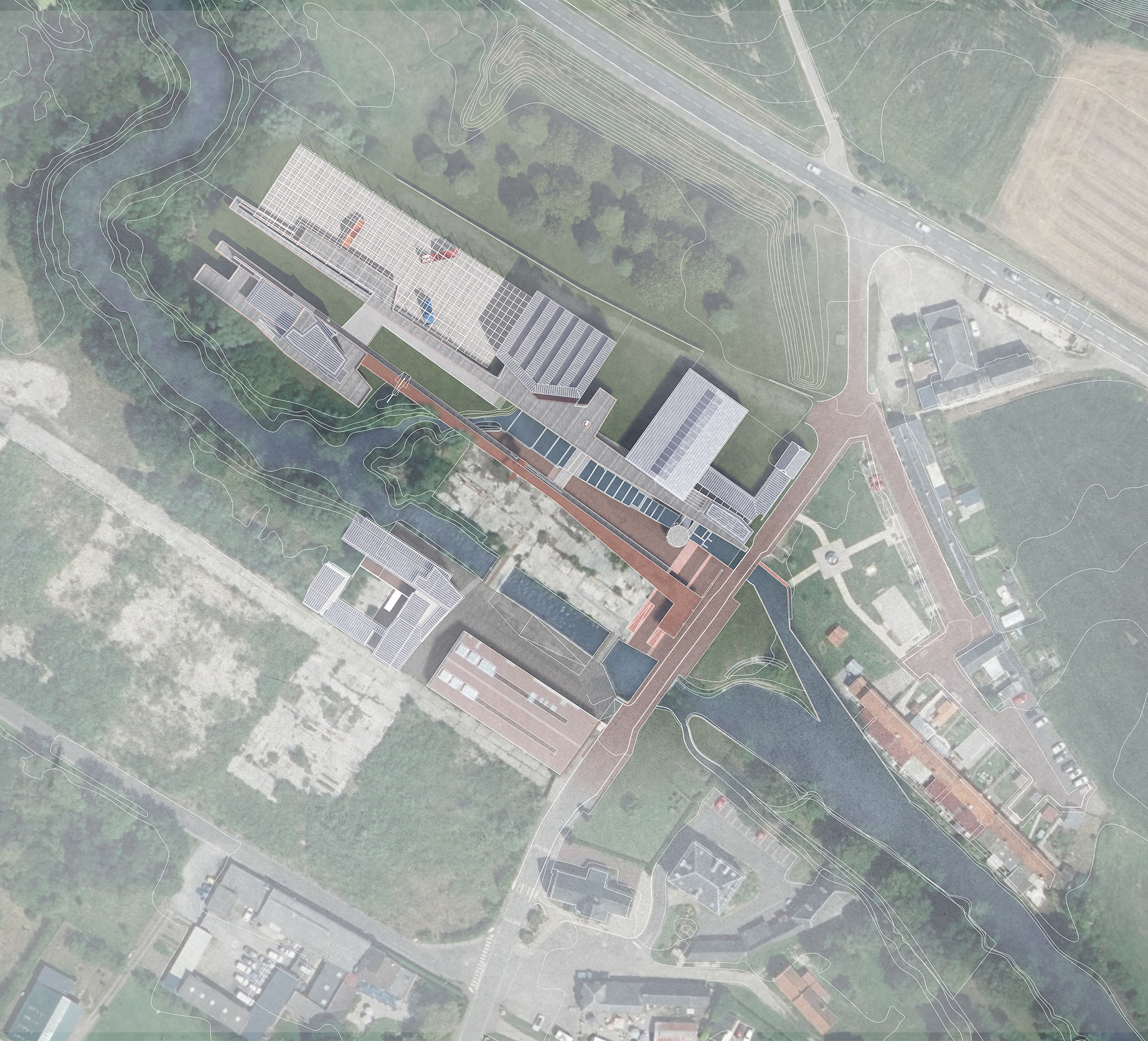 Le jumeau promené embrasse les rythmes métalliques et les origamis nomades quand le jumeau suspendu investit le théâtre paysager d’où émerge un vaisseau rouge. Sur sa peau, les tatouages marquent la pierre coulée de l’unité du village. La trame d’éclat et d’ombre dévale les façades, emboîte le pas et ravive la déambulation au cœur de Ponts-et-Marais.