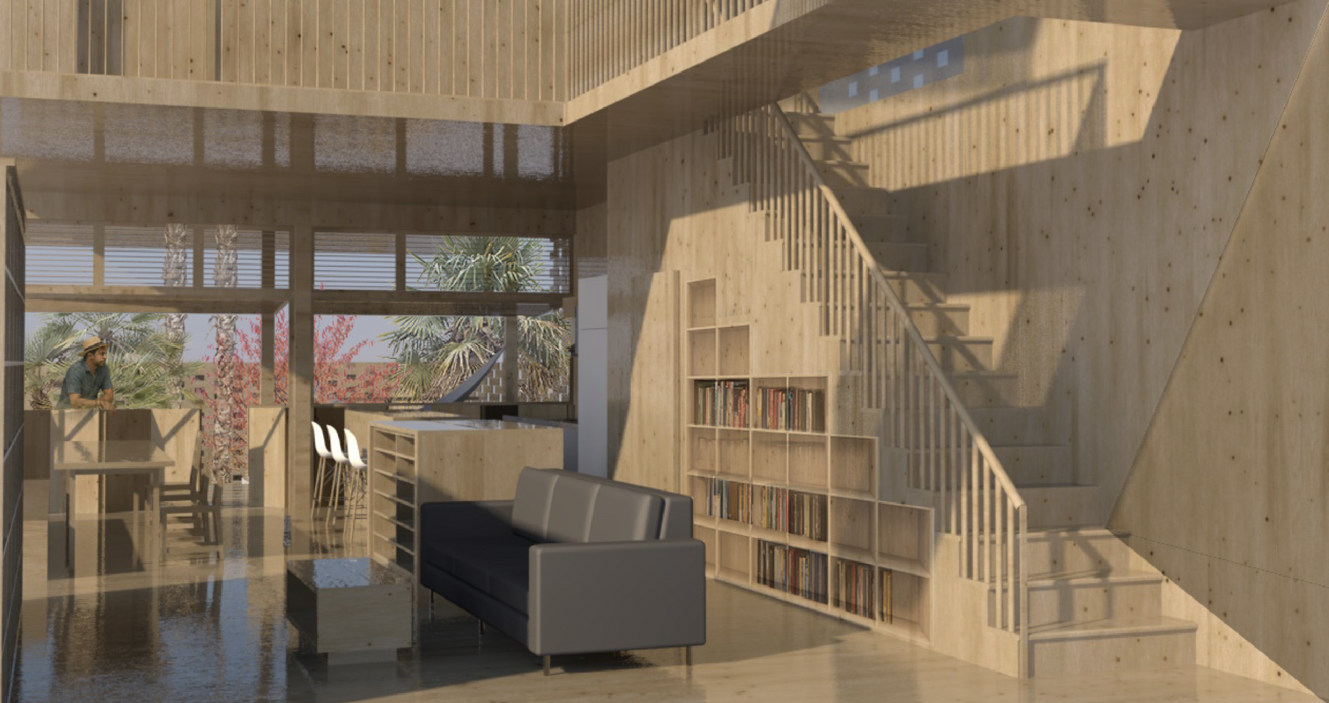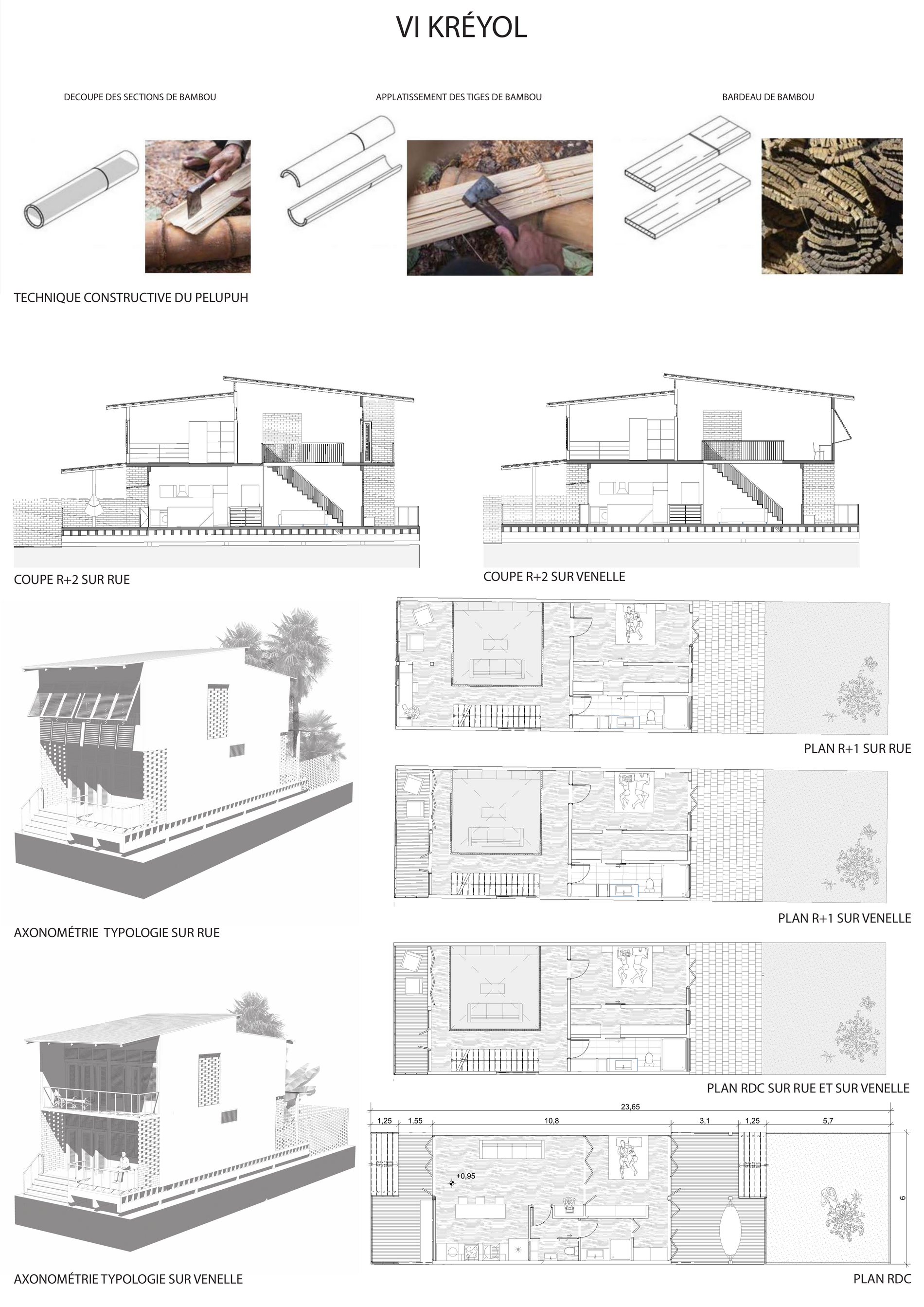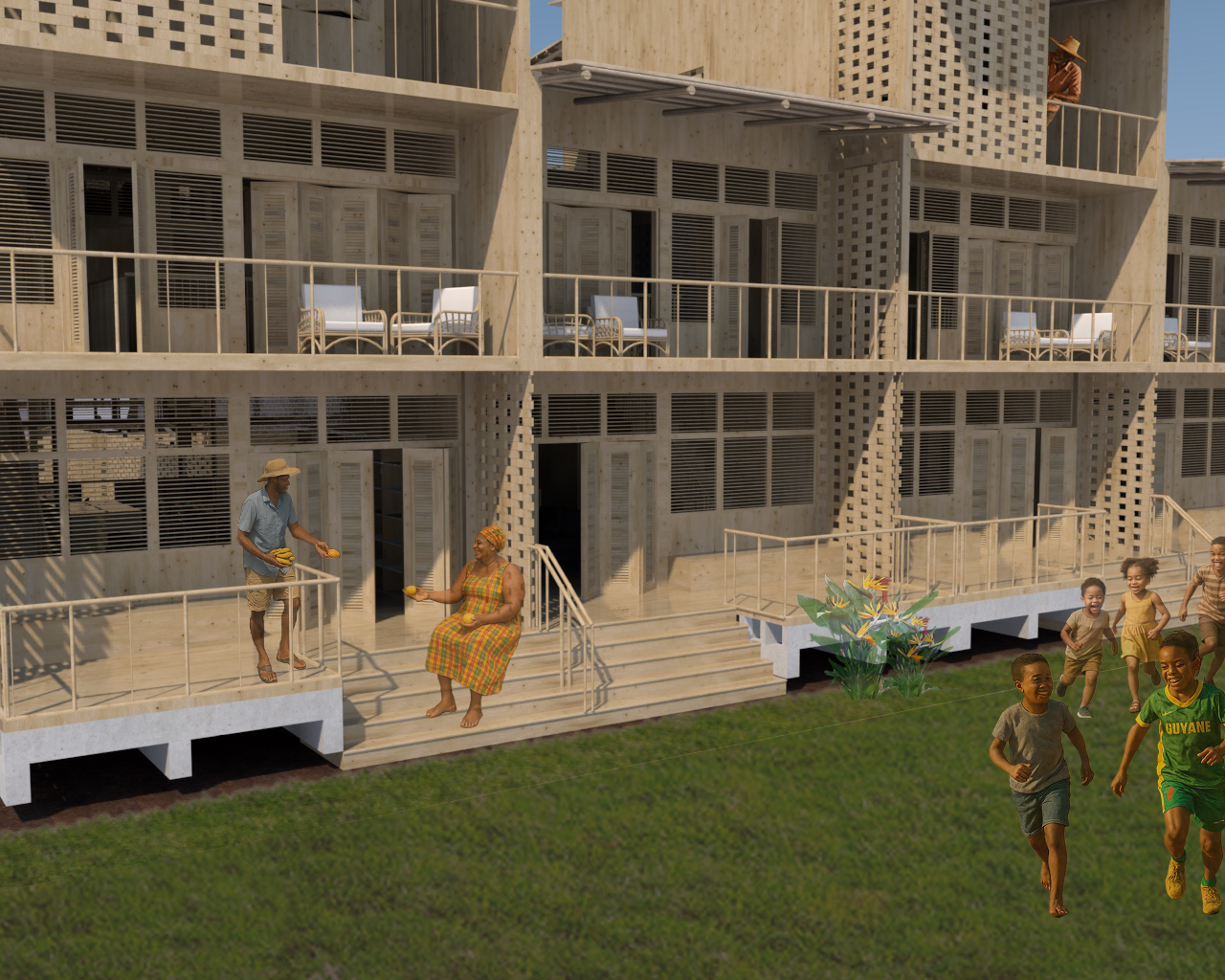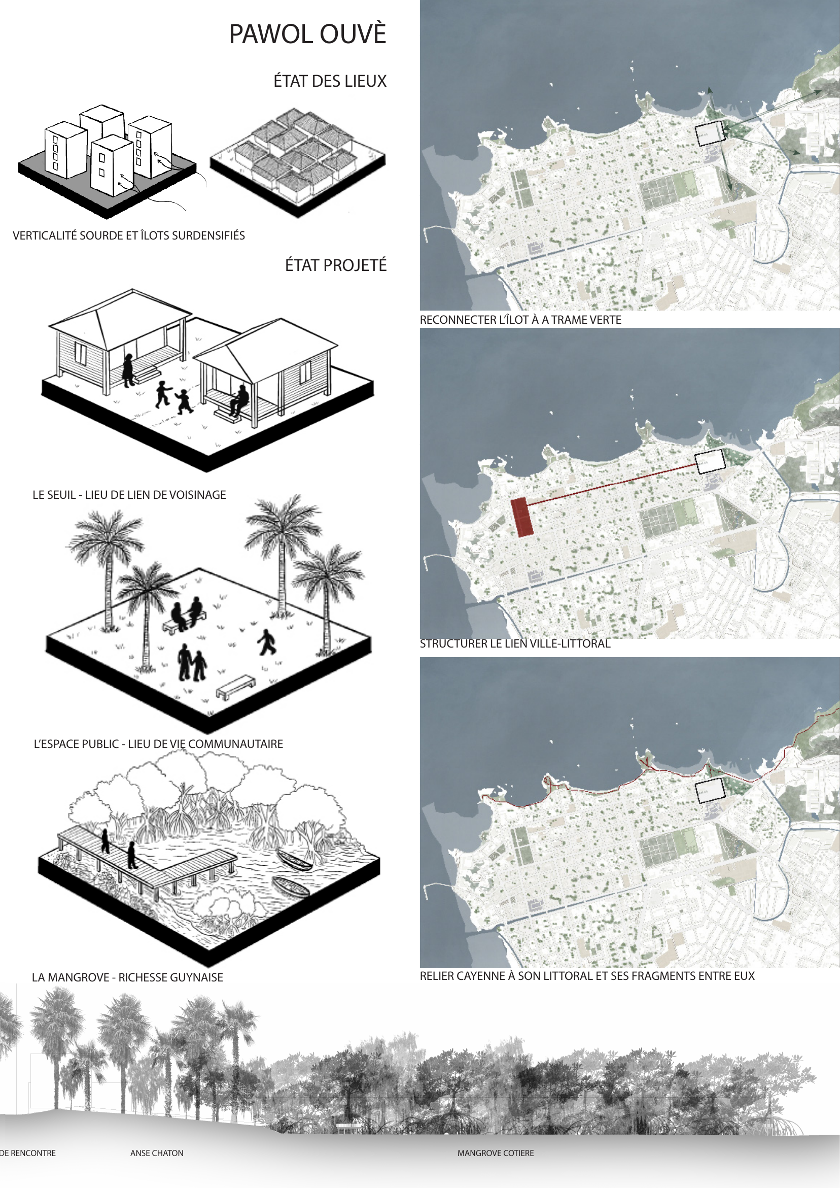 À Cayenne, la rencontre entre la ville et la mangrove a longtemps été pensée qu’en termes de séparation : la mer comme menace, la mangrove comme obstacle, la ville comme refuge. Pourtant, c’est précisément dans cette zone d’incertitude, mouvante et fertile, que peut se réinventer une manière d’habiter. Ti Vilaj, Gran Kayenn imagine un îlot comme un petit village créole, où la densité urbaine dialogue avec la convivialité des venelles et la respiration des jardins. Les maisons, construites en bois et bambou, sont surélevées pour laisser circuler l’air et l’eau, ouvertes aux alizés, modulables selon les besoins des habitants. À travers galeries, terrasses et espaces partagés, elles renouent avec une culture de voisinage et d’hospitalité aujourd’hui fragilisée. Au cœur du projet, le Parc de la Mangrove agit comme seuil, respiration et lieu d’apprentissage : il relie la ville à son littoral, trop longtemps négligé, par des passerelles et cheminements qui invitent à la découverte de cet écosystème méconnu. Plus qu’une proposition architecturale, Ti Vilaj est un manifeste : celui d’une architecture bioclimatique, ancrée dans les mémoires et ouverte sur l’avenir, où habiter la lisière devient un acte de réconciliation entre nature, culture et urbanité.