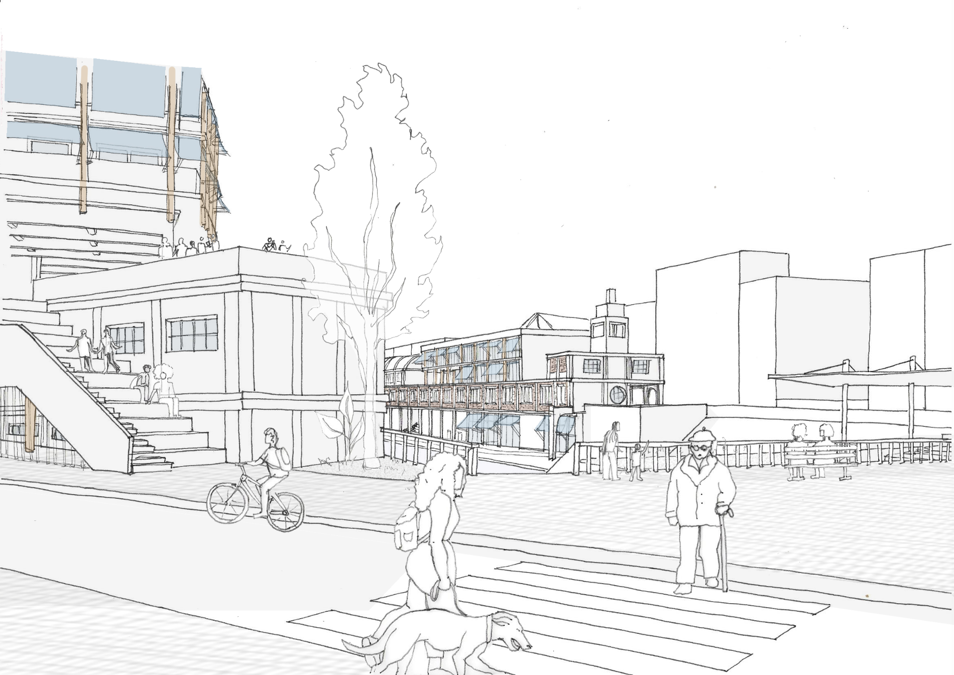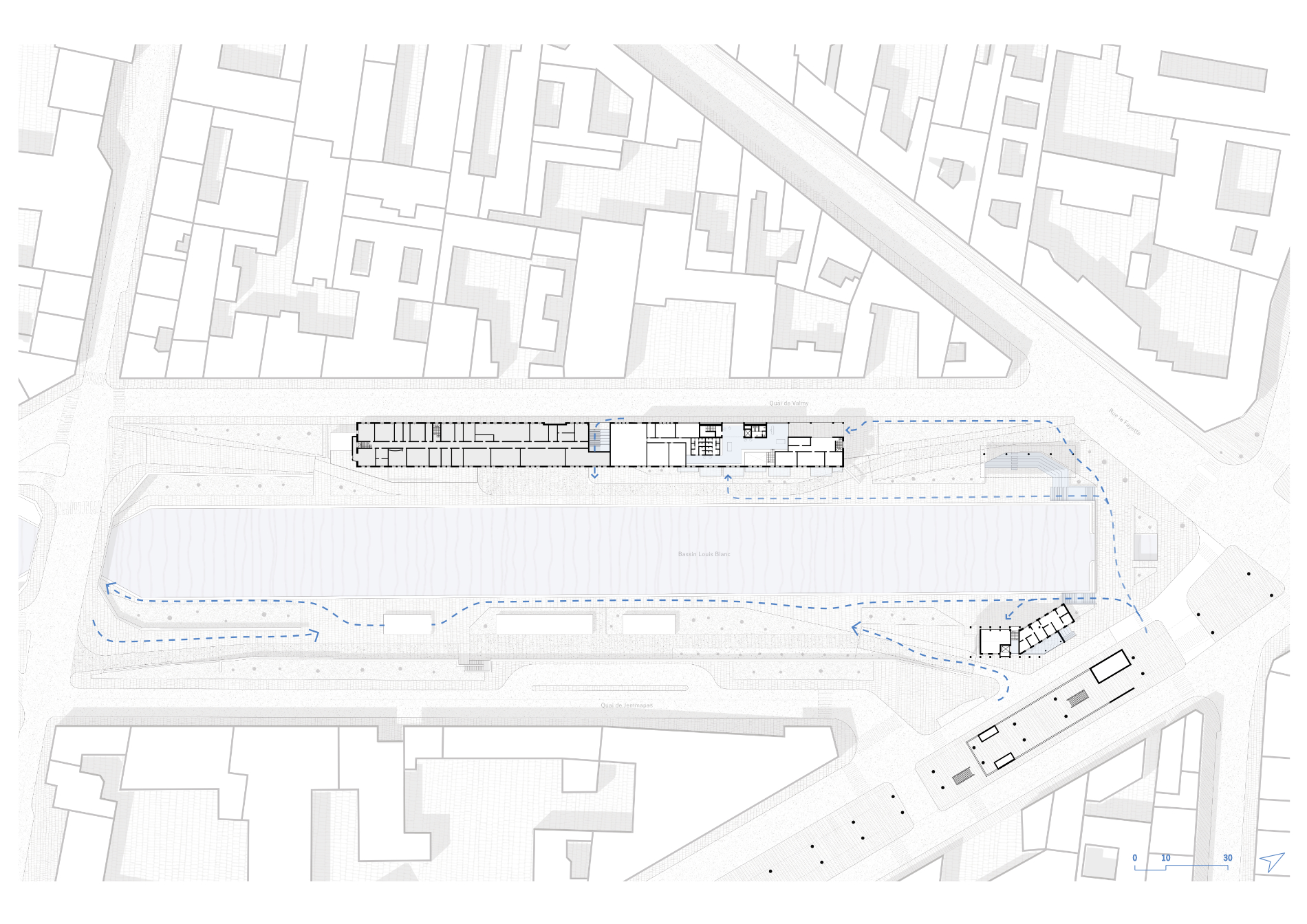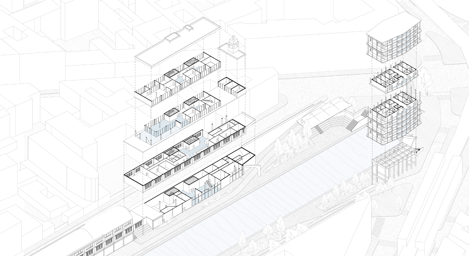 Ce projet de PFE propose une réponse architecturale à l’exclusion des personnes sans-abris des dynamiques sociales urbaines. Pour y répondre, l’importance d’un programme destiné à la fois aux sans-abris et aux riverains est rapidement apparue, afin de créer un espace capable d’attirer ces deux publics et de favoriser leur rencontre. Le site retenu, place Stalingrad et quais du Bassin Louis Blanc, dans le 10ᵉ arrondissement, s’est révélé pertinent de par sa large fréquentation des publics concernés mais également par sa situation au bord du canal, son patrimoine industriel et la présence du Point Éphémère, déjà fréquenté par les riverains. Le projet se déploie à travers deux surélévations : l’une sur le Point Éphémère, plus discrète, qui met en valeur le patrimoine existant et accueille le programme de jour, l’autre sur le bâtiment du service propreté, plus haute, qui devient un marqueur urbain signalant ce lieu dans la séquence du canal et dans le site. Enfin, un travail sur l’espace public et les accès aux quais bas a été mené pour connecter le site à son territoire.