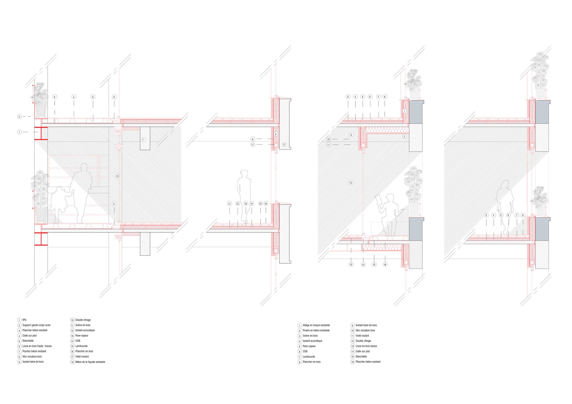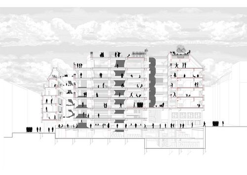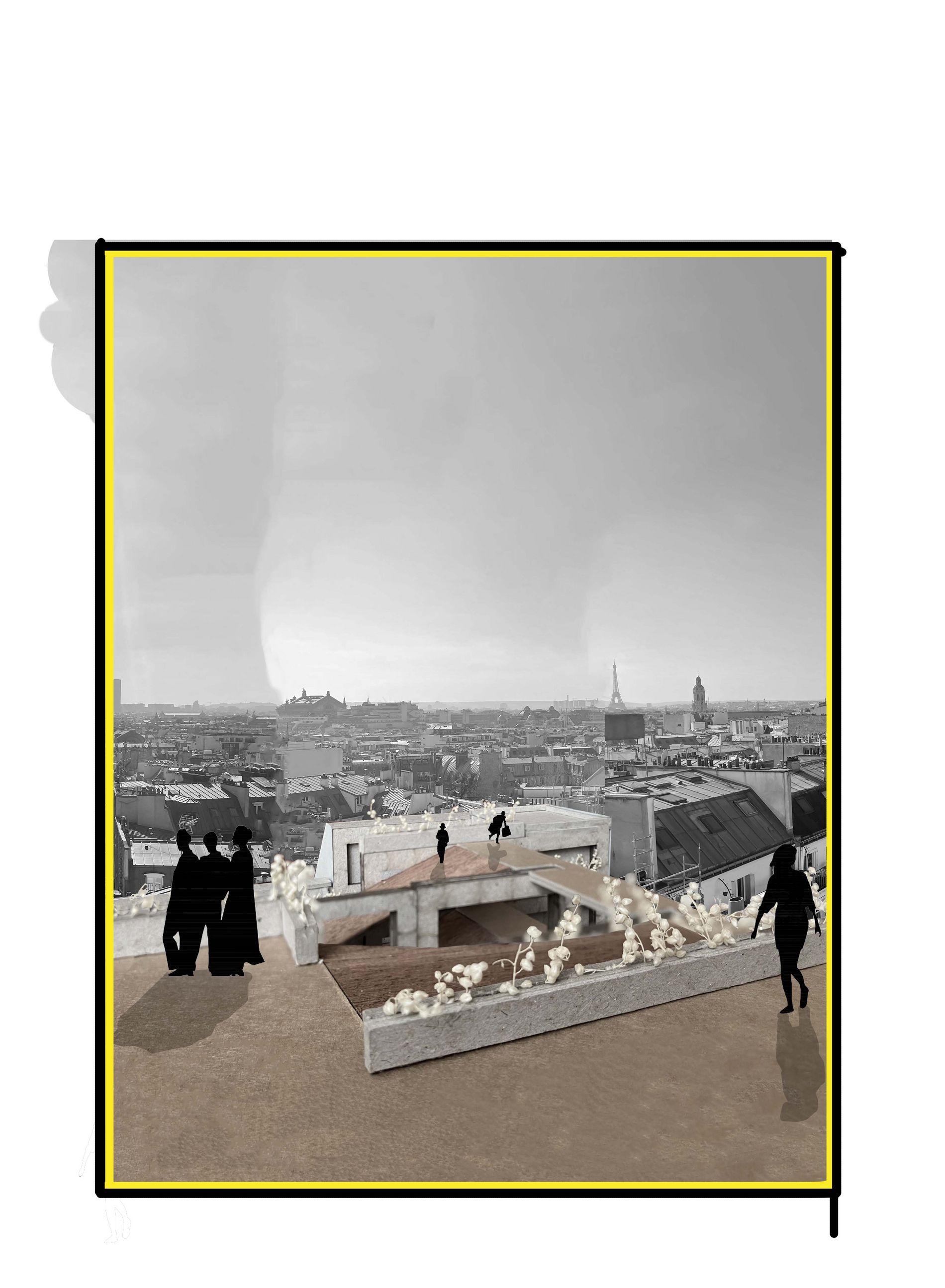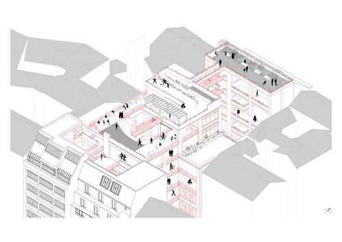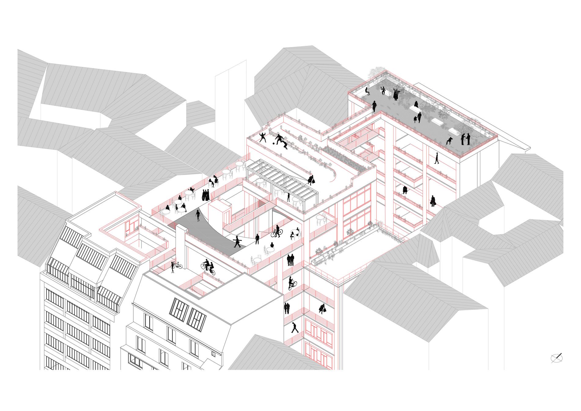 Cette circulation verticale dessert des logements en duplex et des locaux pour des professions de services. Enfin le toit, aujourd'hui réservé aux automobiles et donné à la collectivité. Il offre un jardin, végétalisé , un moment de pause afin de contempler la vue sur Paris.