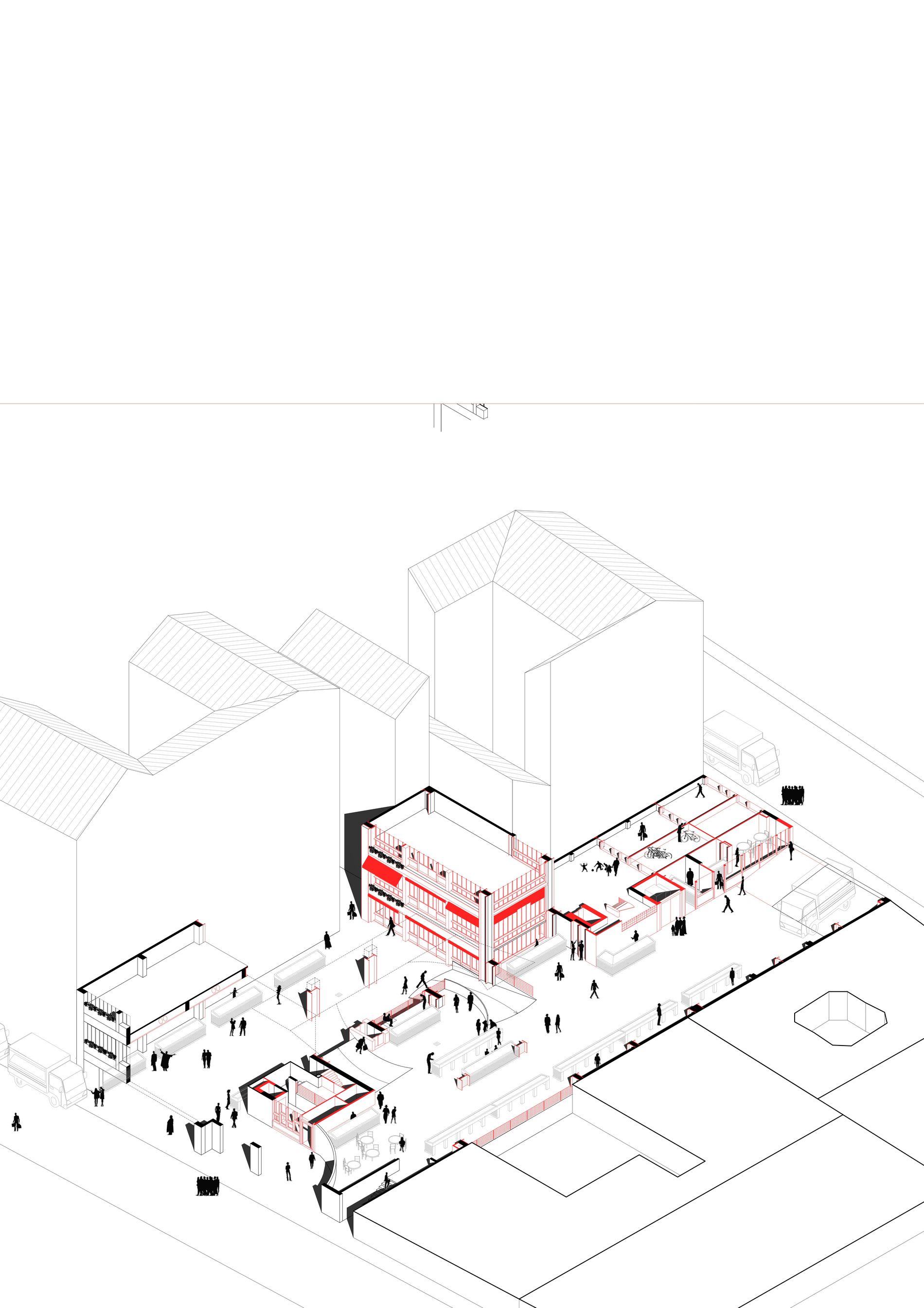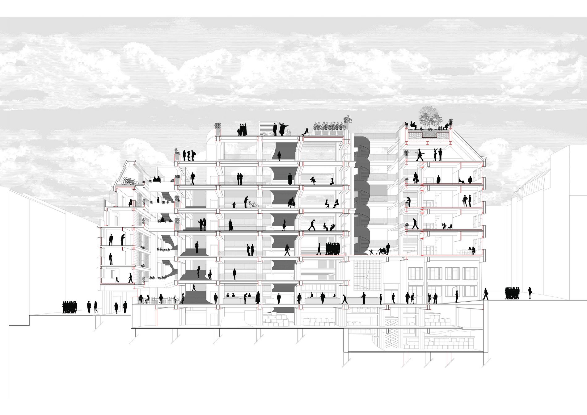 Tout d'abord, une circulation horizontale connectant les rues de Navarin et Clauzel. Le rez-de-chaussée est pensé comme une halle de marché apportant aux quartier un accès à l'alimentation et aux produits locaux. Les sous-sol sont alors à destination du stockage des commerces.