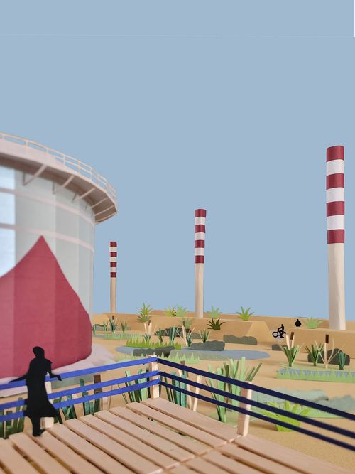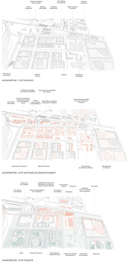 Les plateformes industrielles du golfe de Fos, perçues comme obsolètes et indésirables, s’inscrivent dans un réseau globalisé tout en étant profondément enracinées dans leur territoire. À la suite de mon mémoire interrogeant le fonctionnement et la perception de ces plateformes industrielles à travers la notion de patrimoine, ce projet de fin d’études prend pour terrain la raffinerie Rhône Énergies à Fos-sur-Mer afin d’expérimenter sa reconversion progressive. Face à une obsolescence matérielle, extractive et environnementale, il s’agit non pas d’effacer ces infrastructures mais de les considérer comme fondation pour une nouvelle forme d’habitabilité. Le projet s’appuie sur un processus alternant dépollution, démantèlement partiel, réemploi, maintenance et adaptation des sols comme des installations. Chaque élément est abordé selon son état, son potentiel de reconversion et sa valeur paysagère pour accompagner l’émergence d’un paysage hybride où se conjuguent mémoire, activités et vivants. Cette approche intermédiaire, entre démantèlement et patrimonialisation, reconnecte le site à son territoire par de nouveaux usages partagés.