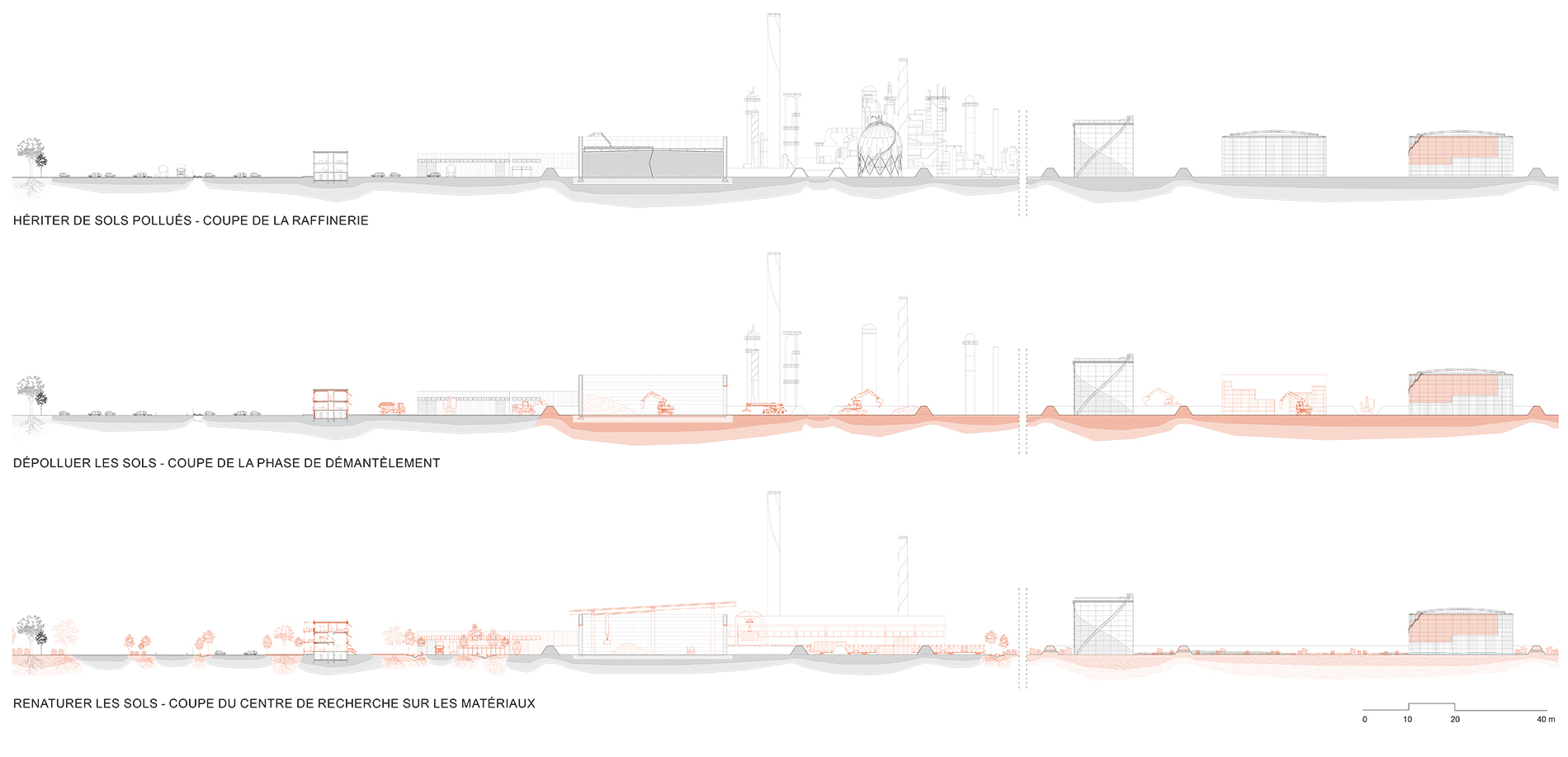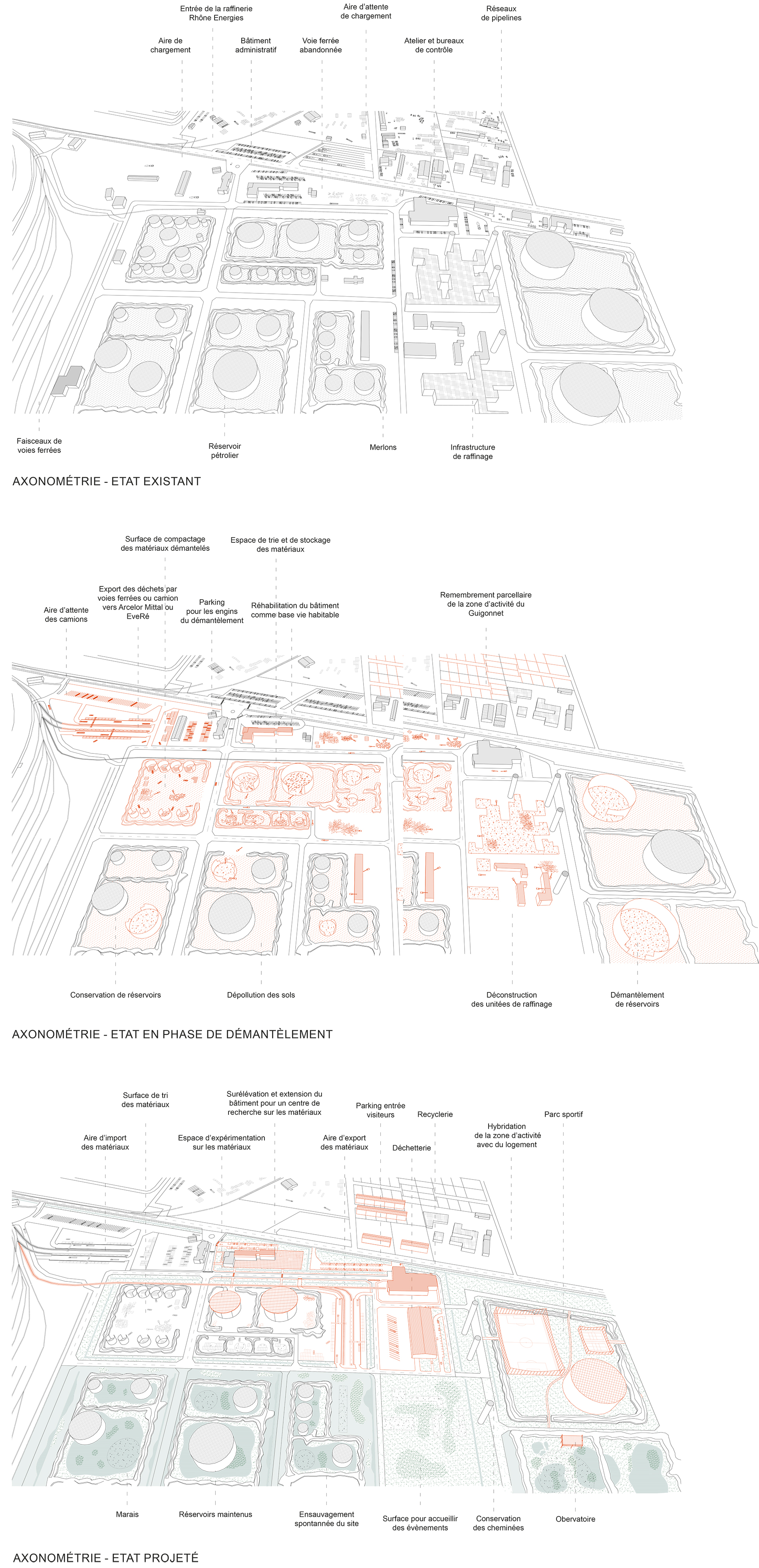 Les plateformes industrielles du golfe de Fos, perçues comme obsolètes et indésirables, s’inscrivent dans un réseau globalisé tout en étant profondément enracinées dans leur territoire. À la suite de mon mémoire interrogeant le fonctionnement et la perception de ces plateformes industrielles à travers la notion de patrimoine, ce projet de fin d’études prend pour terrain la raffinerie Rhône Énergies à Fos-sur-Mer afin d’expérimenter sa reconversion progressive. Face à une obsolescence matérielle, extractive et environnementale, il s’agit non pas d’effacer ces infrastructures mais de les considérer comme fondation pour une nouvelle forme d’habitabilité. Le projet s’appuie sur un processus alternant dépollution, démantèlement partiel, réemploi, maintenance et adaptation des sols comme des installations. Chaque élément est abordé selon son état, son potentiel de reconversion et sa valeur paysagère pour accompagner l’émergence d’un paysage hybride où se conjuguent mémoire, activités et vivants. Cette approche intermédiaire, entre démantèlement et patrimonialisation, reconnecte le site à son territoire par de nouveaux usages partagés.