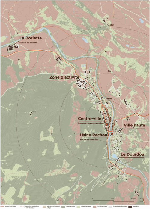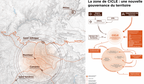 Au travers d’une approche multiscalaire et holistique, le projet utilise le cyclisme comme toile de fond de l’aménagement de différentes interventions. D’abord en questionnant les fondements territoriaux d’un tel projet en inventant une nouvelle gouvernance : la zone de CICLE (Coordination des Initiatives pour une Circulation Locale et Ecologique), dans le but de favoriser les projets porteurs de résilience.