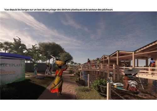 L’analyse systémique de la ville d’Abidjan a mis en lumière les difficultés des quartiers populaires, souvent exposés à la pollution plastique, aux risques d’inondation et au manque d’infrastructures scolaires et médicales. Parmi eux, Adjahui-Coubé se distingue : selon les sources gouvernementales, il n’était pas menacé de destruction au moment du projet. Ce contexte a permis d’élaborer des stratégies adaptées aux besoins du territoire, issues de diagnostics précis et de constats croisés (affordances).