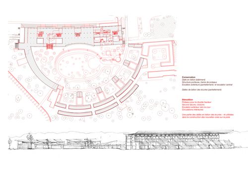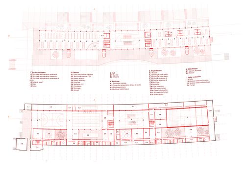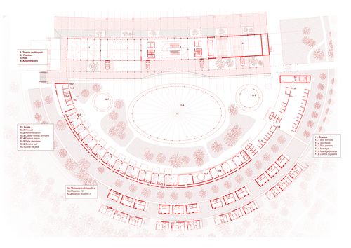 Patrimoine moderne des années 1970, sa réhabilitation préserve la structure et la toiture en pagode tout en valorisant le passé hippique. La piste devient un grand parc métropolitain bordé de gradins et de programmes publics. La cour intérieure, plus intime, accueille logements, école et écuries : une partie est transformée en maisons, l’autre maintenue pour un centre équestre prolongé à l’arrière. Un manège central articule les activités. Trois accès structurent le site : public vers le parc, privé pour les habitants, mixte pour les espaces communs. Un hall et une circulation verticale traversent le bâtiment, assurant flexibilité entre usage local en semaine et ouverture métropolitaine le week-end. Le projet recrée un cœur de ville et un quartier habité, vivant, ouvert aux communes voisines.