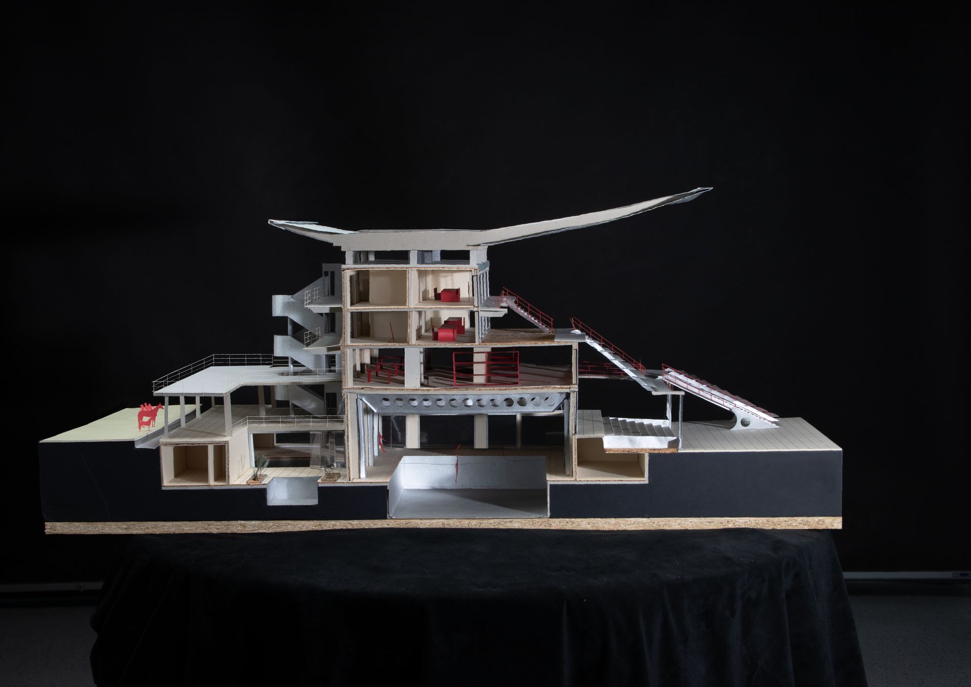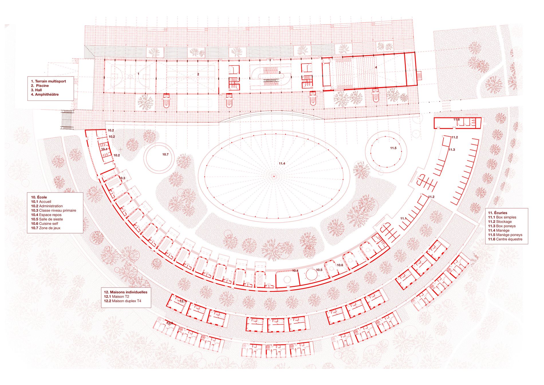 Patrimoine moderne des années 1970, sa réhabilitation préserve la structure et la toiture en pagode tout en valorisant le passé hippique. La piste devient un grand parc métropolitain bordé de gradins et de programmes publics. La cour intérieure, plus intime, accueille logements, école et écuries : une partie est transformée en maisons, l’autre maintenue pour un centre équestre prolongé à l’arrière. Un manège central articule les activités. Trois accès structurent le site : public vers le parc, privé pour les habitants, mixte pour les espaces communs. Un hall et une circulation verticale traversent le bâtiment, assurant flexibilité entre usage local en semaine et ouverture métropolitaine le week-end. Le projet recrée un cœur de ville et un quartier habité, vivant, ouvert aux communes voisines.