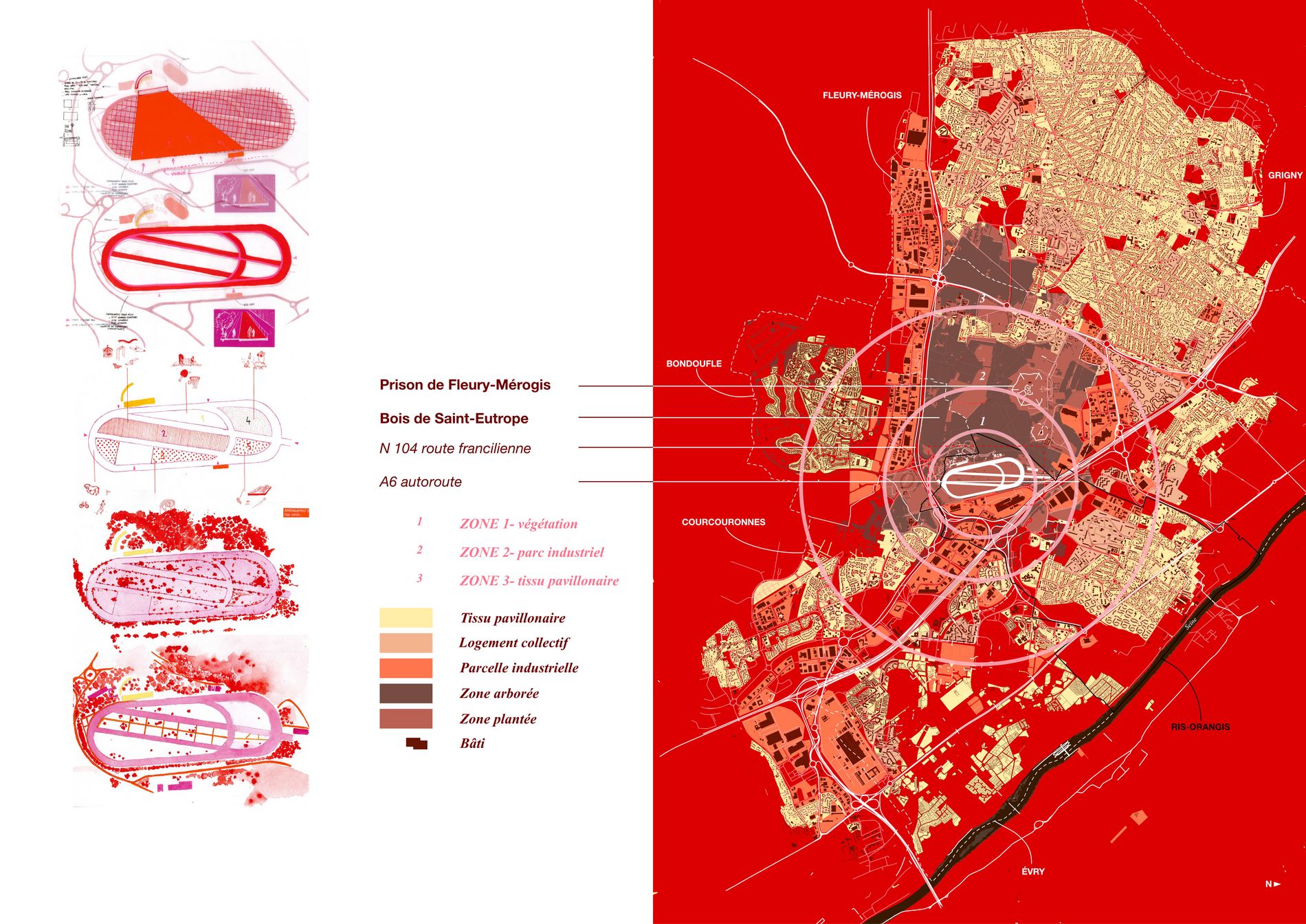 L’hippodrome de Ris-Orangis (23 ha, plus grand que l’île de la Cité) se situe en marge de la commune, entre bois, zones industrielles et quartiers résidentiels. Malgré l’A6, la N104, le RER D et le T12, il reste isolé et peu visible, ce qui en fait un enjeu d’accessibilité.