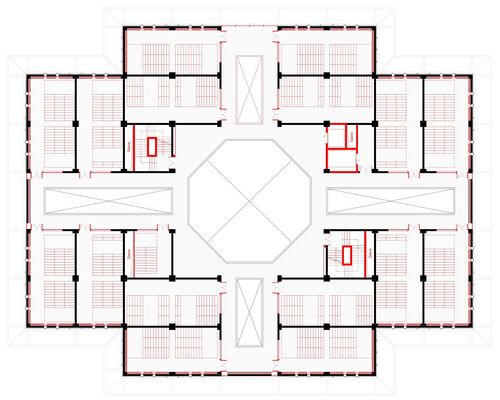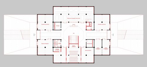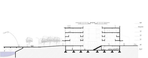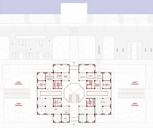 Le projet ouvre le RDC et le R-1 pour y faire entrer l’espace public à travers des rues intérieures. Les cuves de stockage sont réutilisées pour les magasins d’archives, placés aux R+1 et R+2, ils sont protégés des inondations en cas de crue de la Seine. Les jardins botaniques à l’extérieur créent de nouveaux espaces perméables. En toiture-terrasse, une surélévation est créée pour accueillir un restaurant/cabaret tout en offrant un panorama sur les paysages de Rouen.