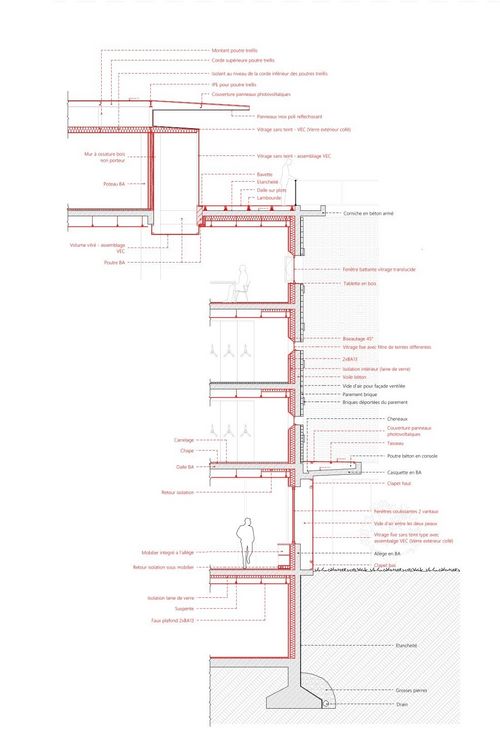 La façade du RDC ainsi que la surélévation alternent entre vitrage et bardage réfléchissant. Ce choix permet de mettre ces niveaux dans une abstraction tout en faisant ressortir les façades existantes en brique. Le projet apporte une touche contemporaine sans dénaturer le bâtiment existant.
