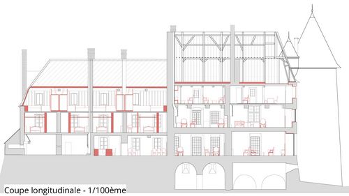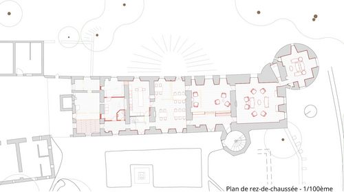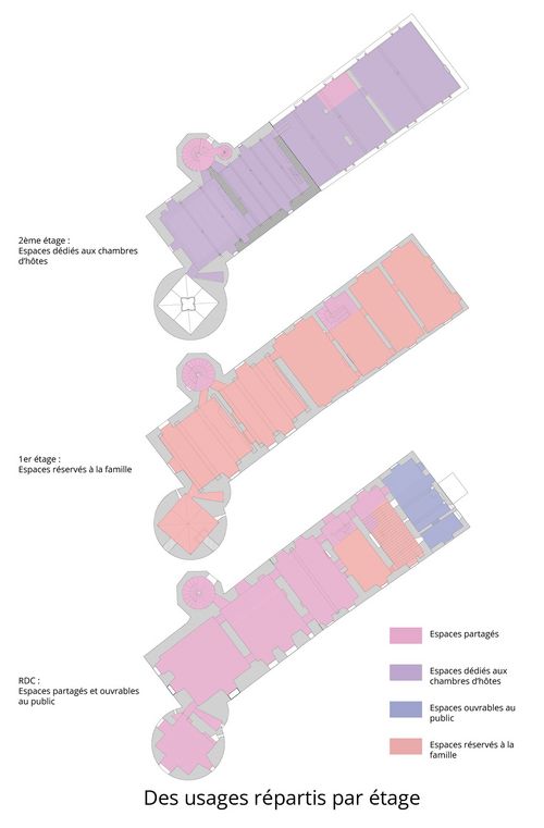 Le château lui-même, aujourd’hui sous-occupé car peu confortable et coûteux à entretenir, a fait l’objet d’un projet plus précis. En plus du réaménagement d’une maison de famille, plus fonctionnelle, mon travail s’est porté sur la création d’espaces de chambres d’hôtes afin de donner une source de revenus à la famille propriétaire et ainsi faciliter l’entretien de la bâtisse. La cohabitation des habitants et de leurs hôtes, la mise en valeur des traces du passé et strates historiques ainsi que la réversibilité des interventions ont été les axes principaux de ce travail sur un existant complexe.
