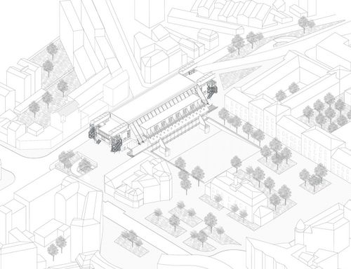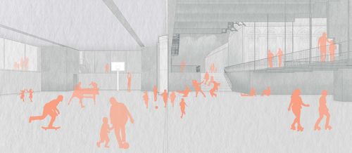 Cela passe par le fait d’associer la patinoire et le parking pour en faire un seul et même équipement, puisque la clé pour débloquer leur potentiel programmatique se situe dans leur relation avec l’espace public. Cette relation peut se créer dans l’interstice entre les deux bâtiments, jusqu’alors investi par la voiture.