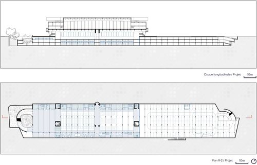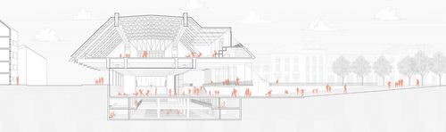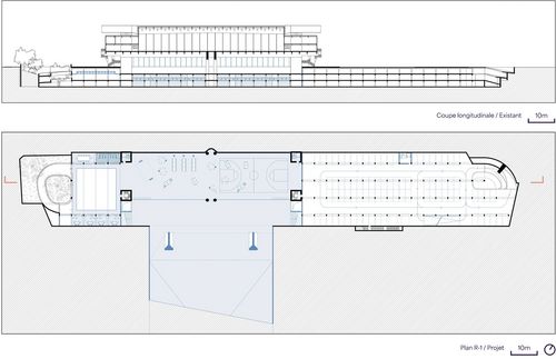 L’ancien parking sert de point d’ancrage à l’ensemble du bâtiment, devenant l’accès aux différents programmes sportifs et le lien avec la ville. Ce choix s’appuie sur l’indépendance structurelle du parking vis-à-vis de la patinoire. Cela permet d’envisager des interventions plus lourdes sur sa structure, sans mettre en péril la stabilité de l’édifice au-dessus. Enfin, la conception habile de la patinoire permet de limiter les interventions sur celle-ci.
