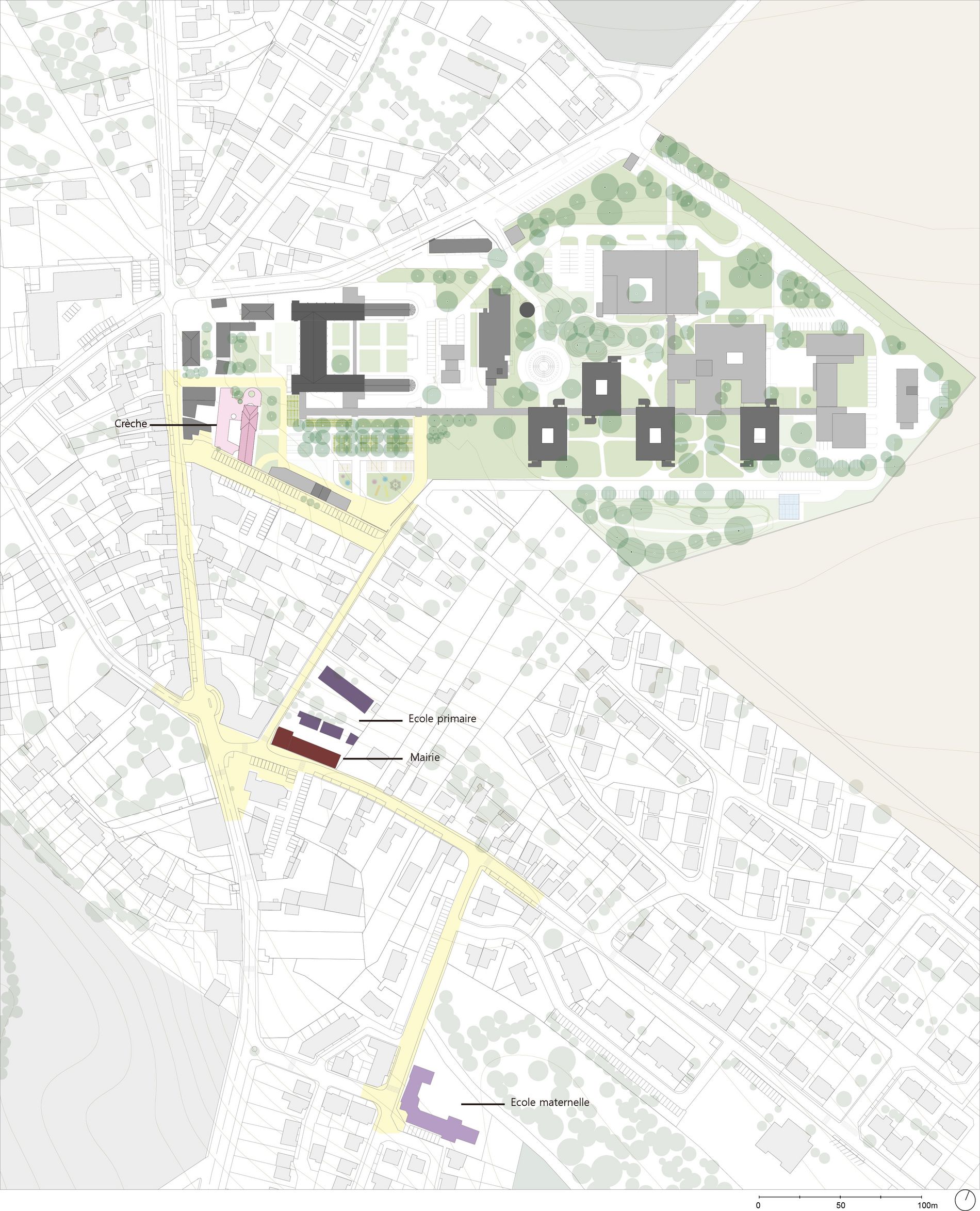 Le projet repose sur trois axes : relier écoles, crèche et village par de nouvelles circulations piétonnes ; transformer un parking en jardin public et le bâtiment SMASH en halle polyvalente ; valoriser la mémoire du site et ses expériences sensorielles grâce à la lumière, aux matériaux naturels et aux sons.
