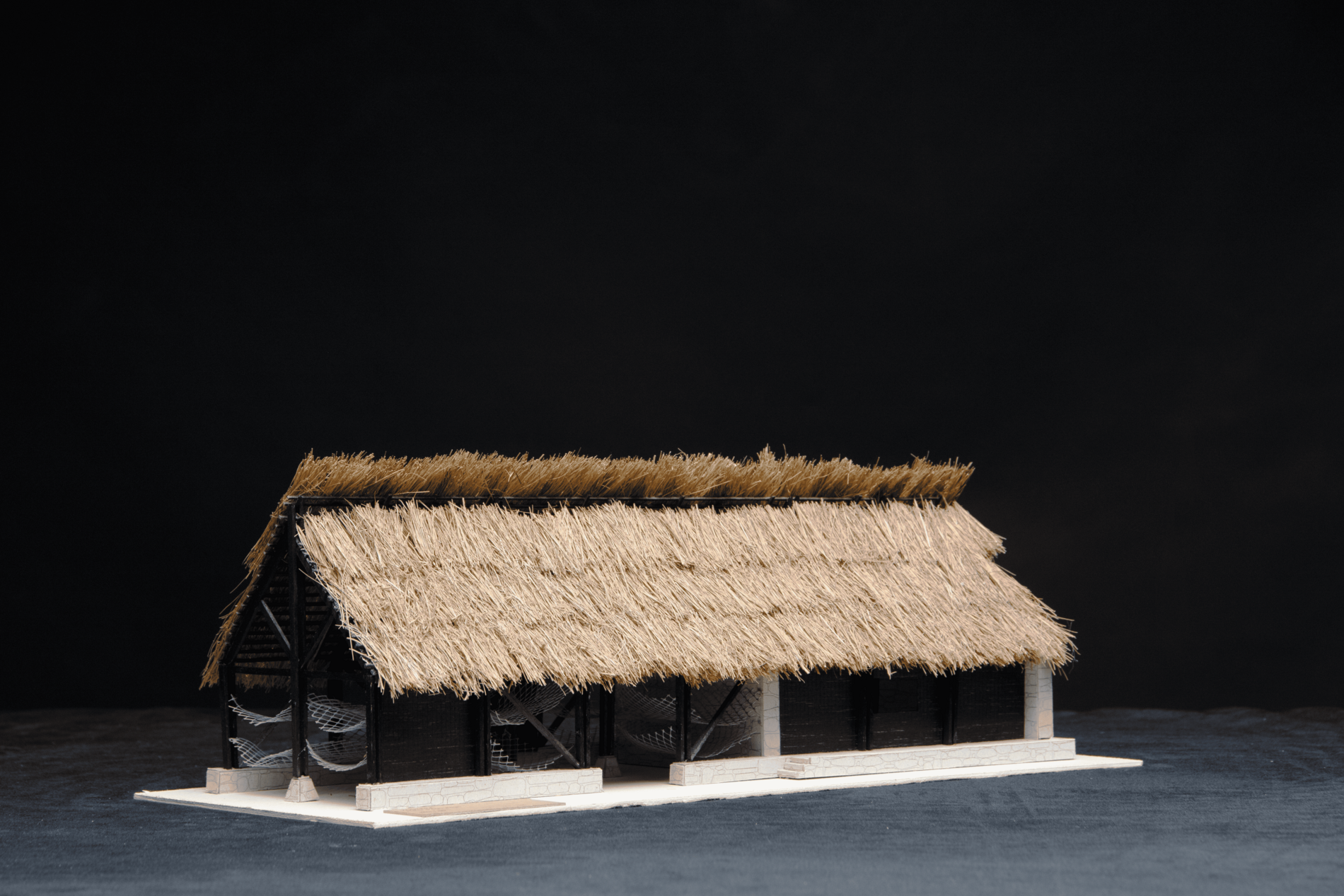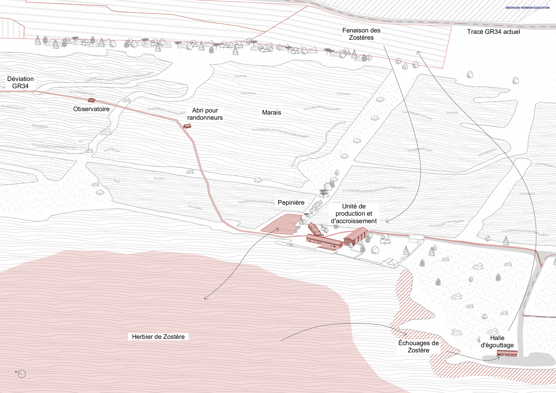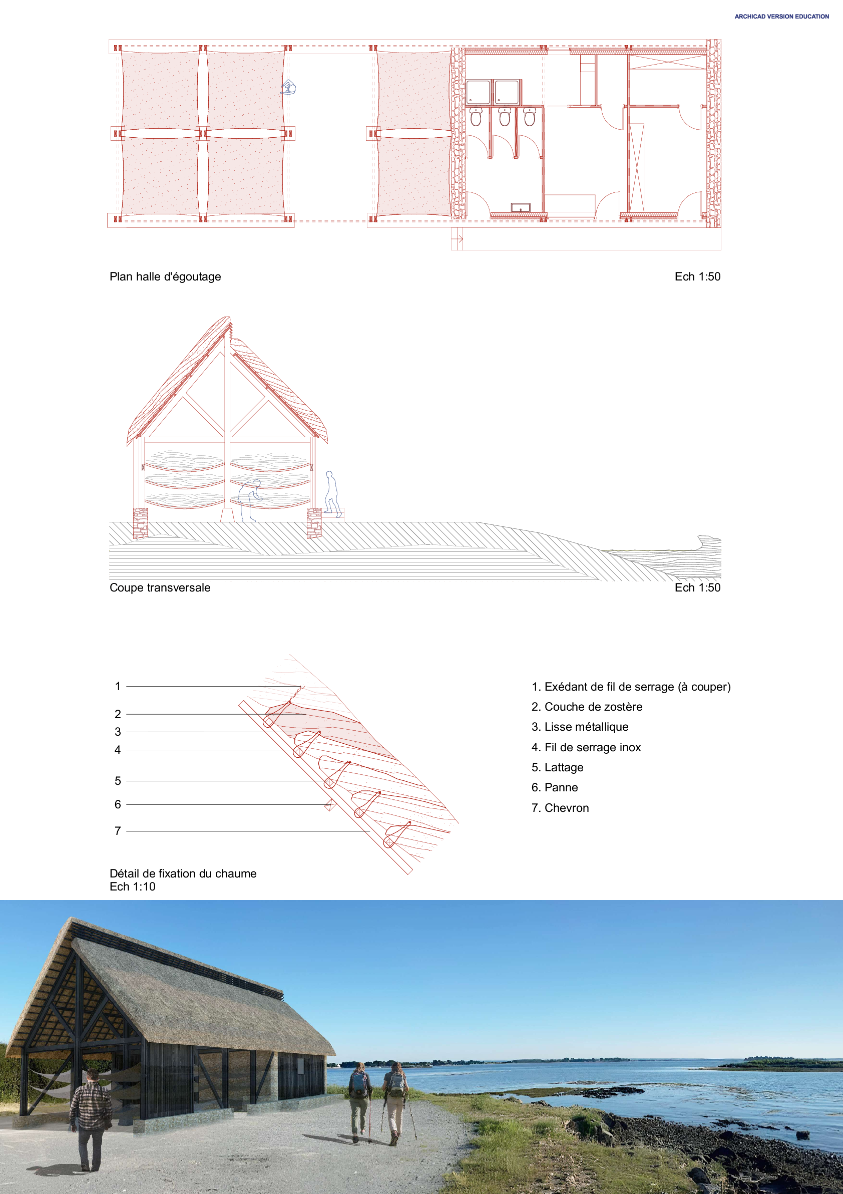 Le dispositif s’organise en plusieurs halles d’égouttage réparties sur le territoire, une unité pilote pour la transformation de la matière, et une pépinière derrière une ancienne digue. L’architecture, en bois noir et couverte en zostère, est sobre et contextuelle.