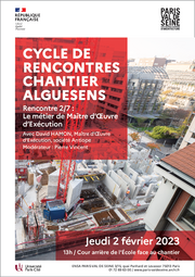 Le cycle de rencontres "Chantier Alguesens", proposé par Pierre Vincent, s'adresse à tous les étudiants de l'ENSA Paris-Val de Seine intéressés par la découverte du chantier de construction de logements expérimentaux conçus par l'agence X-TU, à côté de l'École. Deuxième rencontre : le jeudi 2 février à 13h face au chantier, avec David HAMON, Maître d’Œuvre d’Exécution, société Antiope. Modérateur : Pierre Vincent.