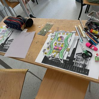 La seconde séance a été consacrée à la conception d’une façade en lieu et place de celle imaginée par Frédéric Borel. Encadré par Isabelle Charlot, médiatrice, ce travail devait mener les élèves à se glisser dans la peau d’un architecte pour concevoir des lieux de vie et de travail et des modes d’articulation entre les deux bâtiments.