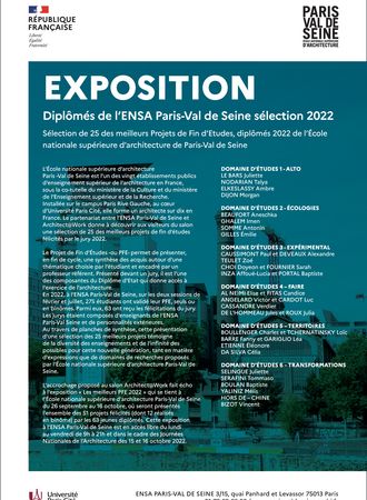 Les 25 Meilleurs PFE 2022 de l’ENSA Paris-Val de Seine ont été exposés, pour certains accompagnés de leur maquette, au salon Architect@Work les 22 et 23 septembre derniers.